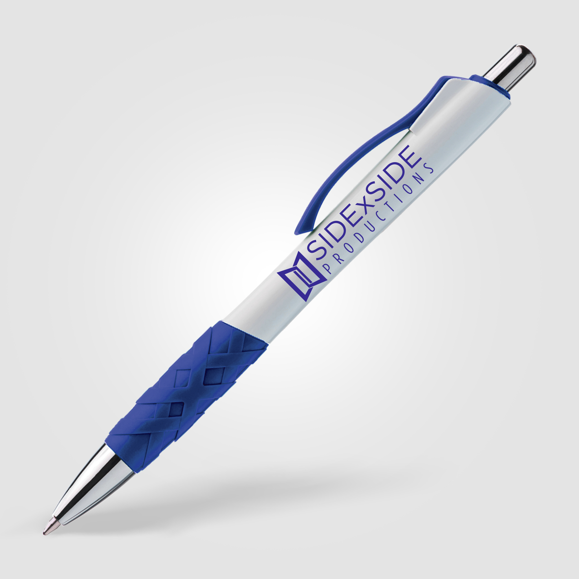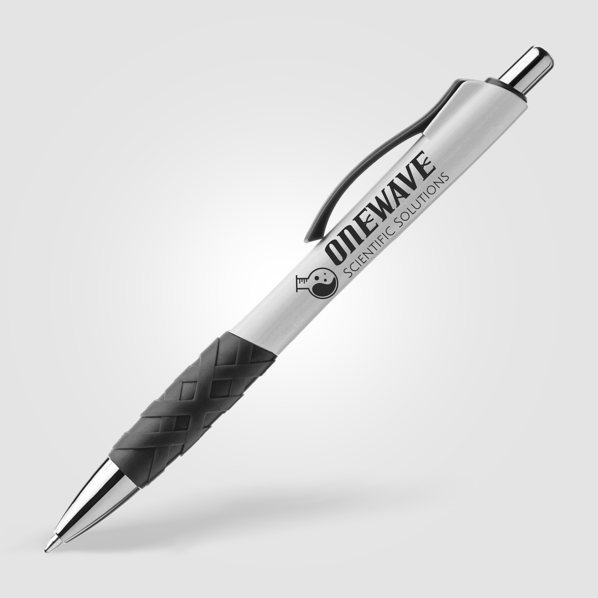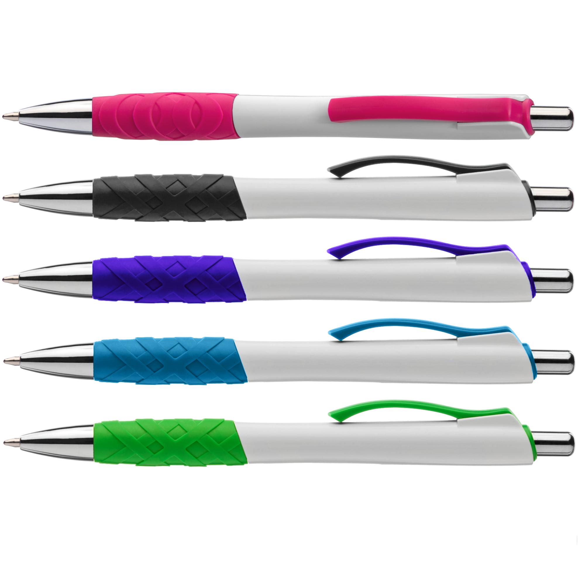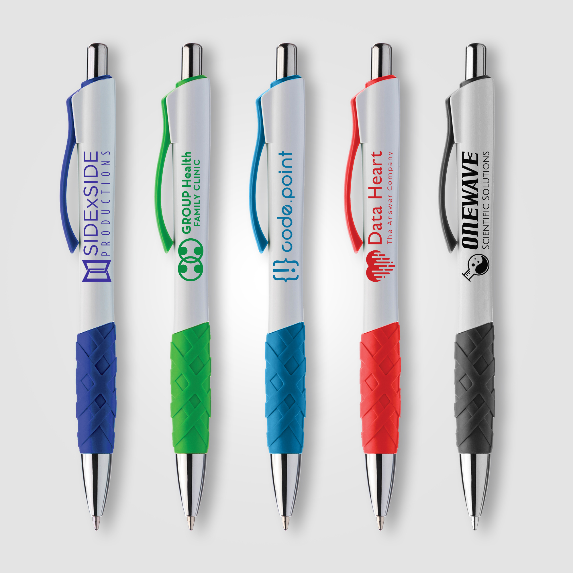 The Delano is a plastic retractable ballpoint pen that features a matching silkscreen imprint and trim color. Choose a trim color, upload artwork, and voila! Imprints are matched to the trim and placed on an opaque white barrel for added contrast. This pen features a unique rubber grip that has a unique link pattern and texture. An excellent value for the quality.
