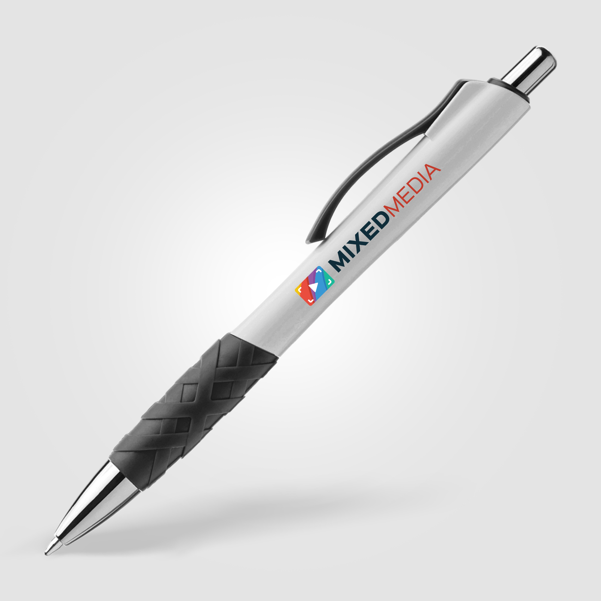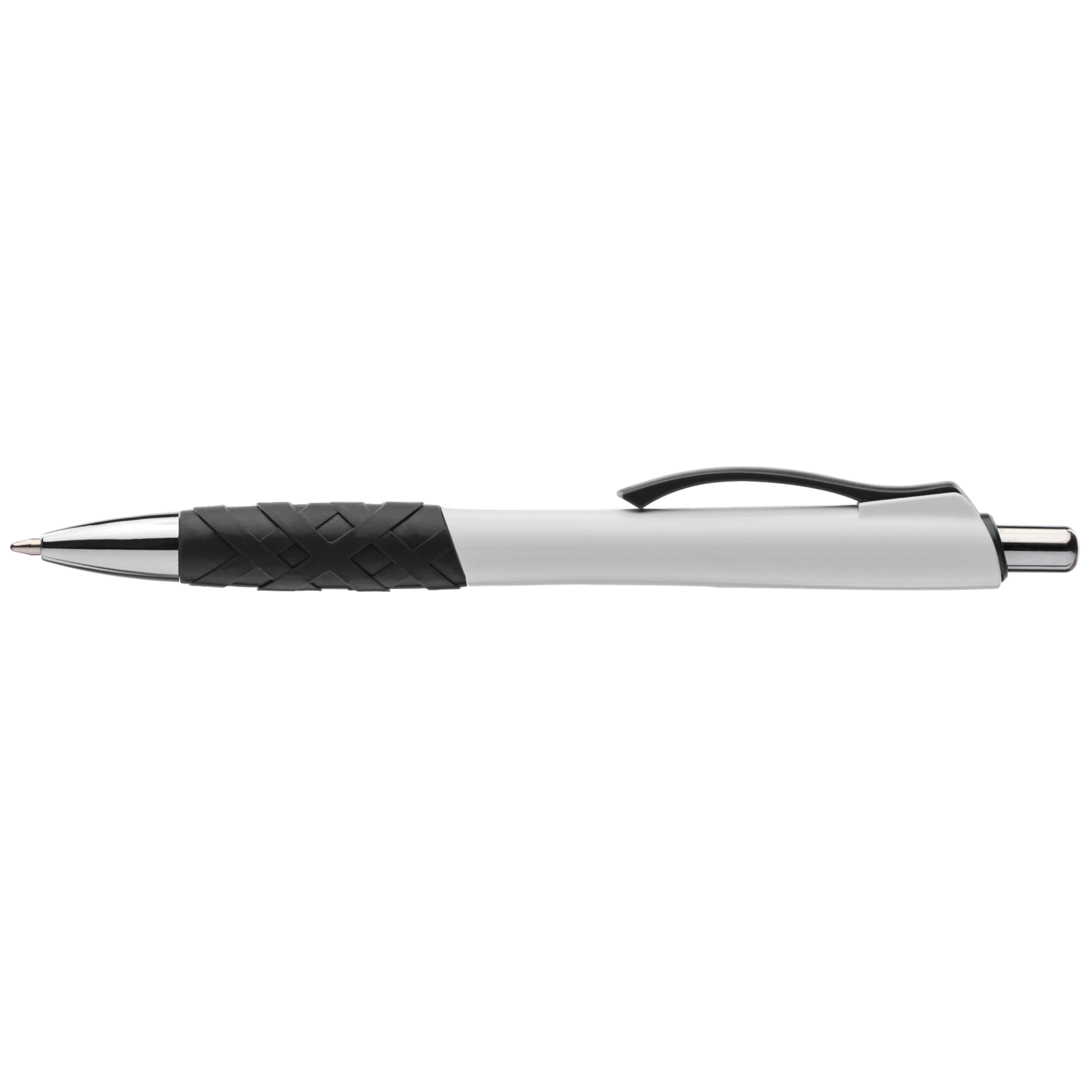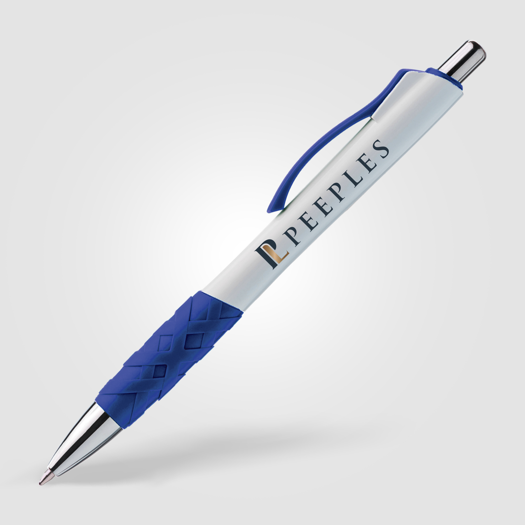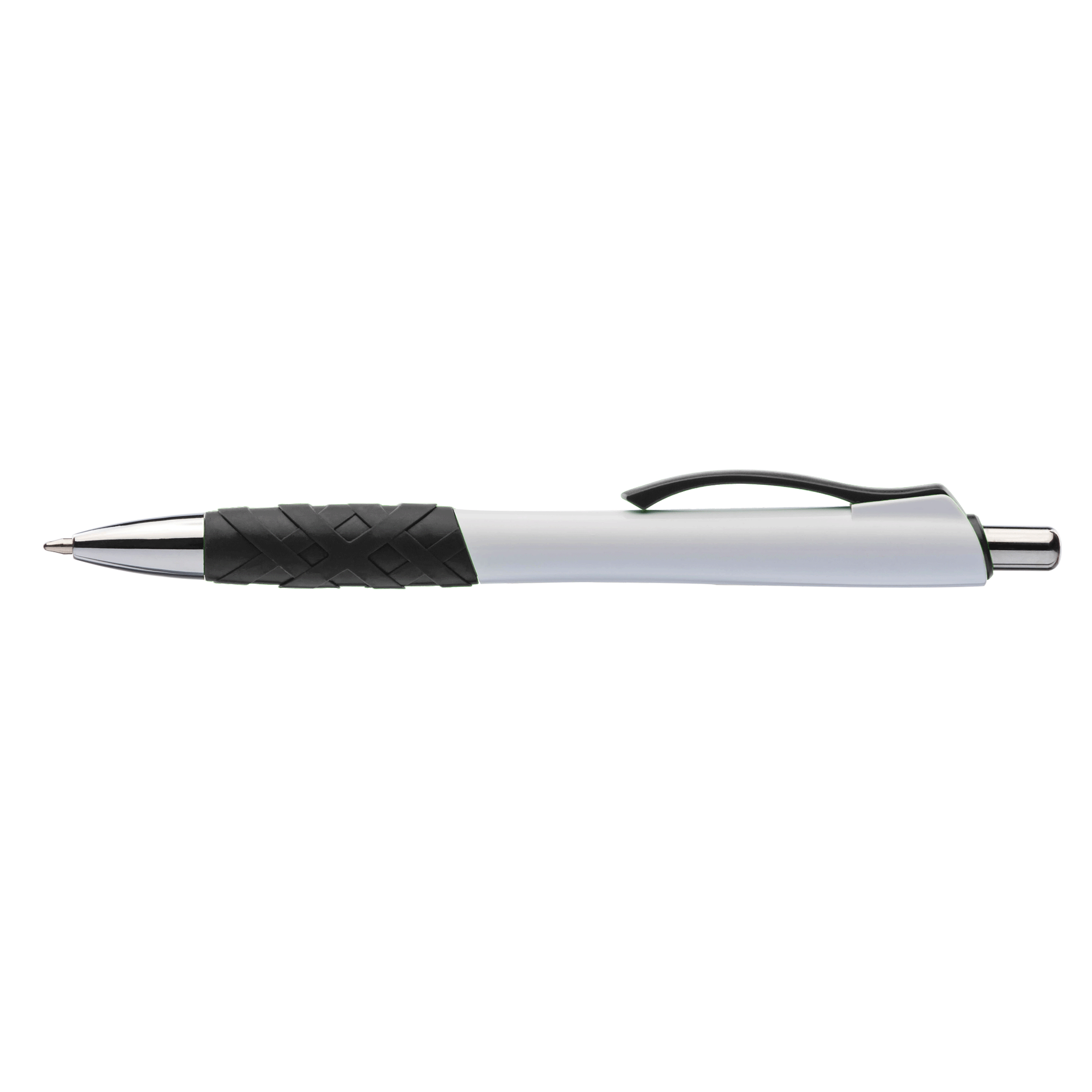 The Delano is a plastic retractable ballpoint pen that features a matching silkscreen imprint and trim color. Choose a trim color, upload artwork, and voila! Imprints are matched to the trim and placed on an opaque white barrel for added contrast. This pen features a unique rubber grip that has a unique link pattern and texture. An excellent value for the quality.