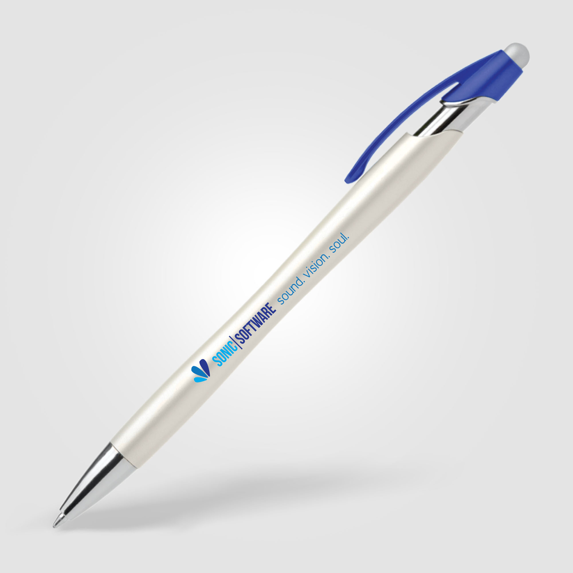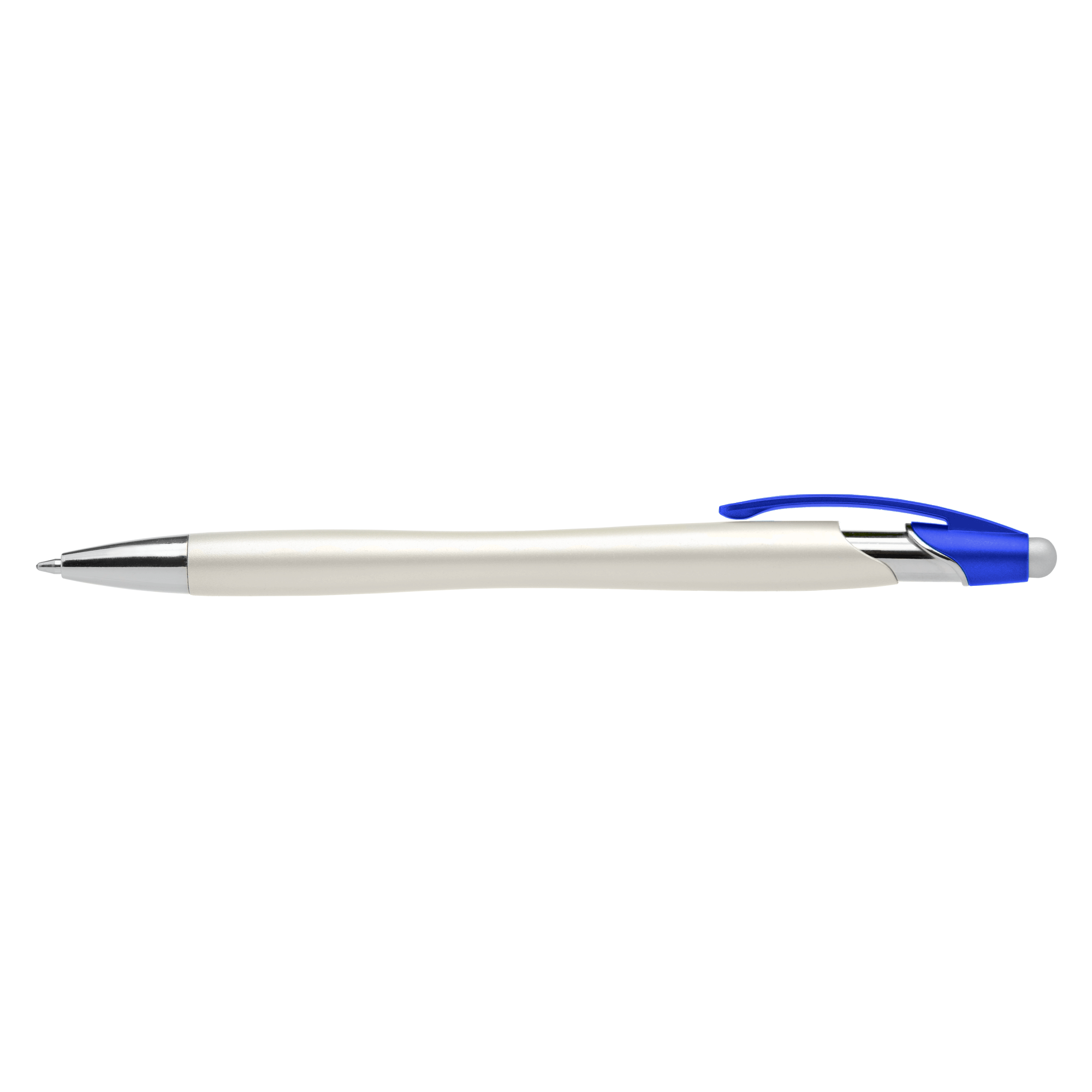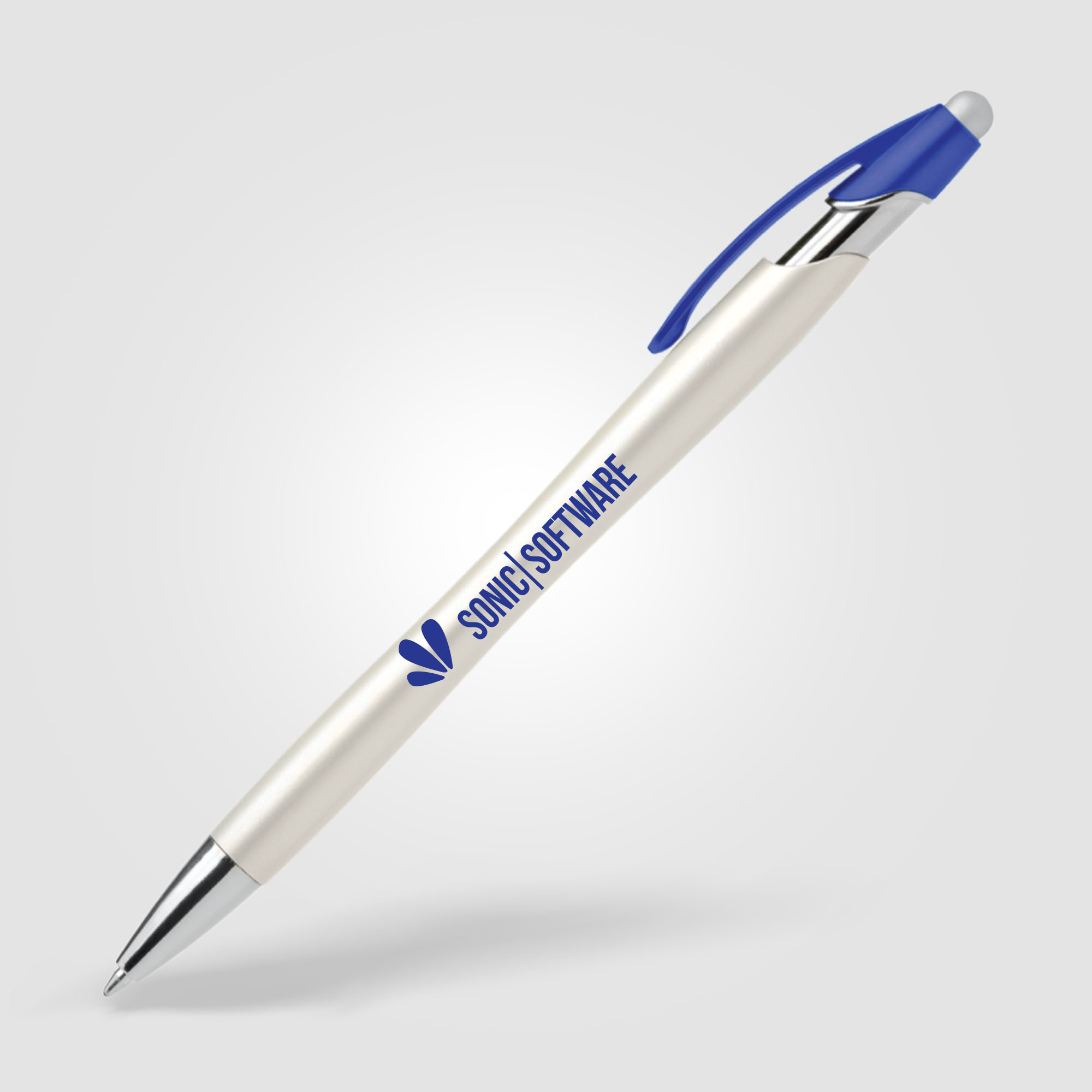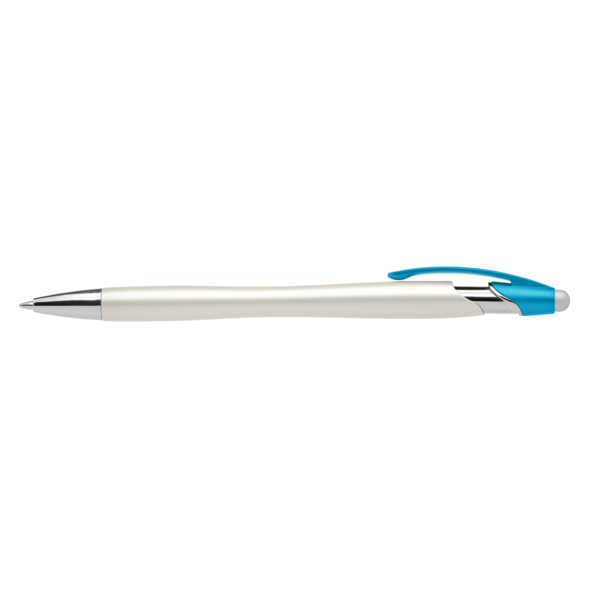 This plastic ballpoint pen features one of our most popular pen styles, now offered with a pearlized metallic painted barrel, chrome accents, colored clip and satin silver stylus. Customize the white pearlized barrel by selecting a clip color and matching 1-color silkscreen imprint.