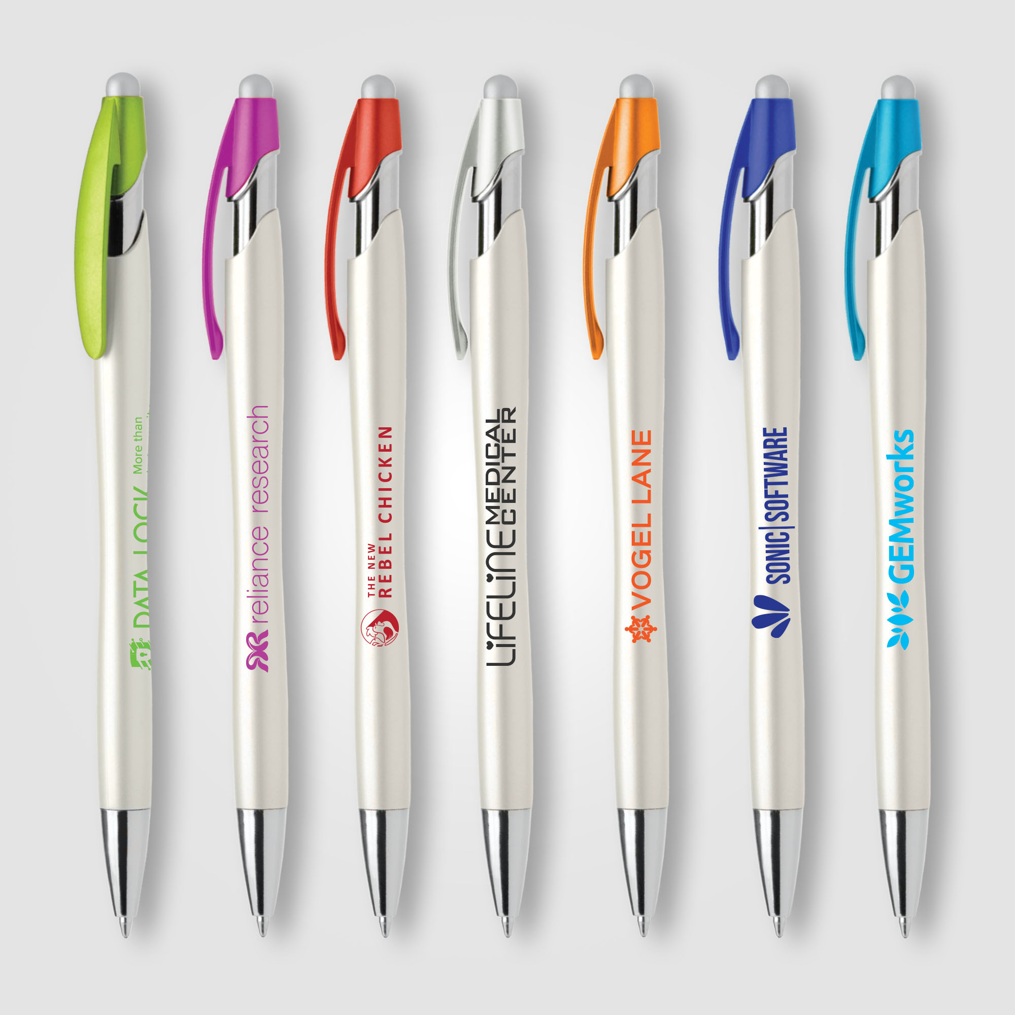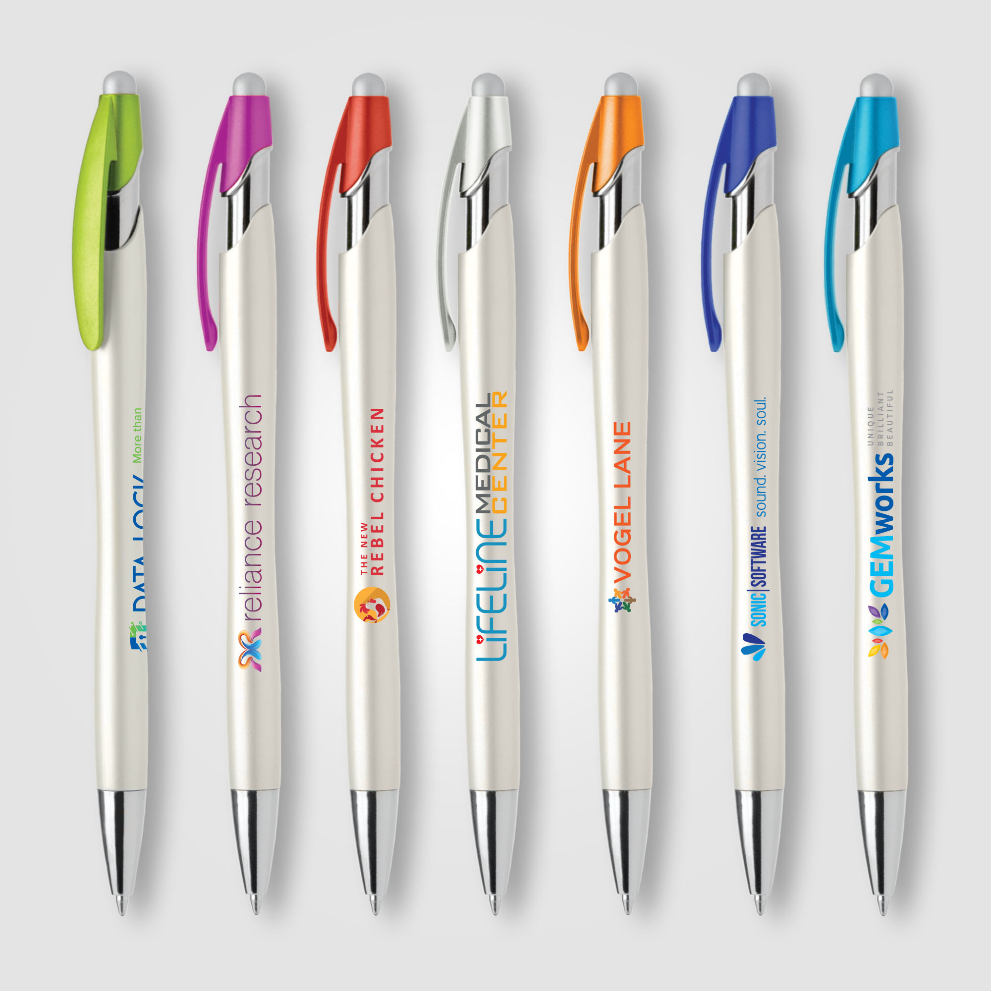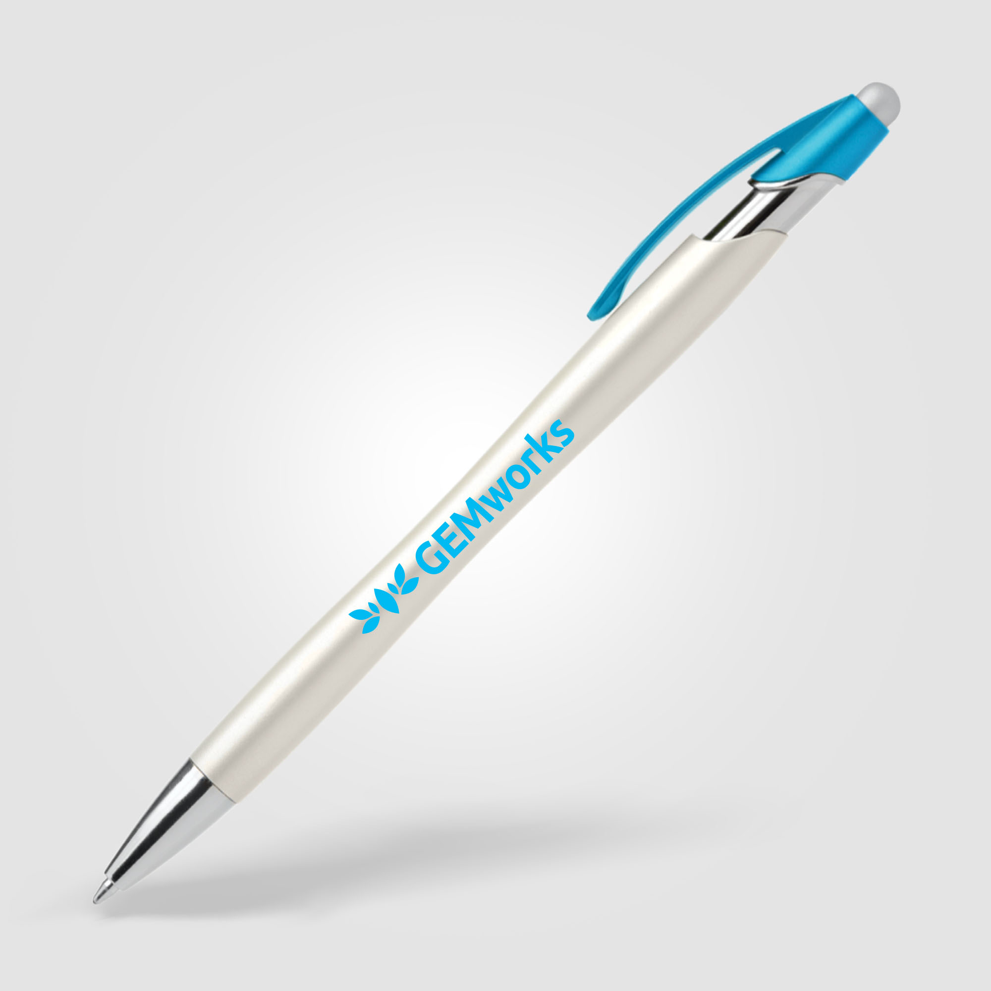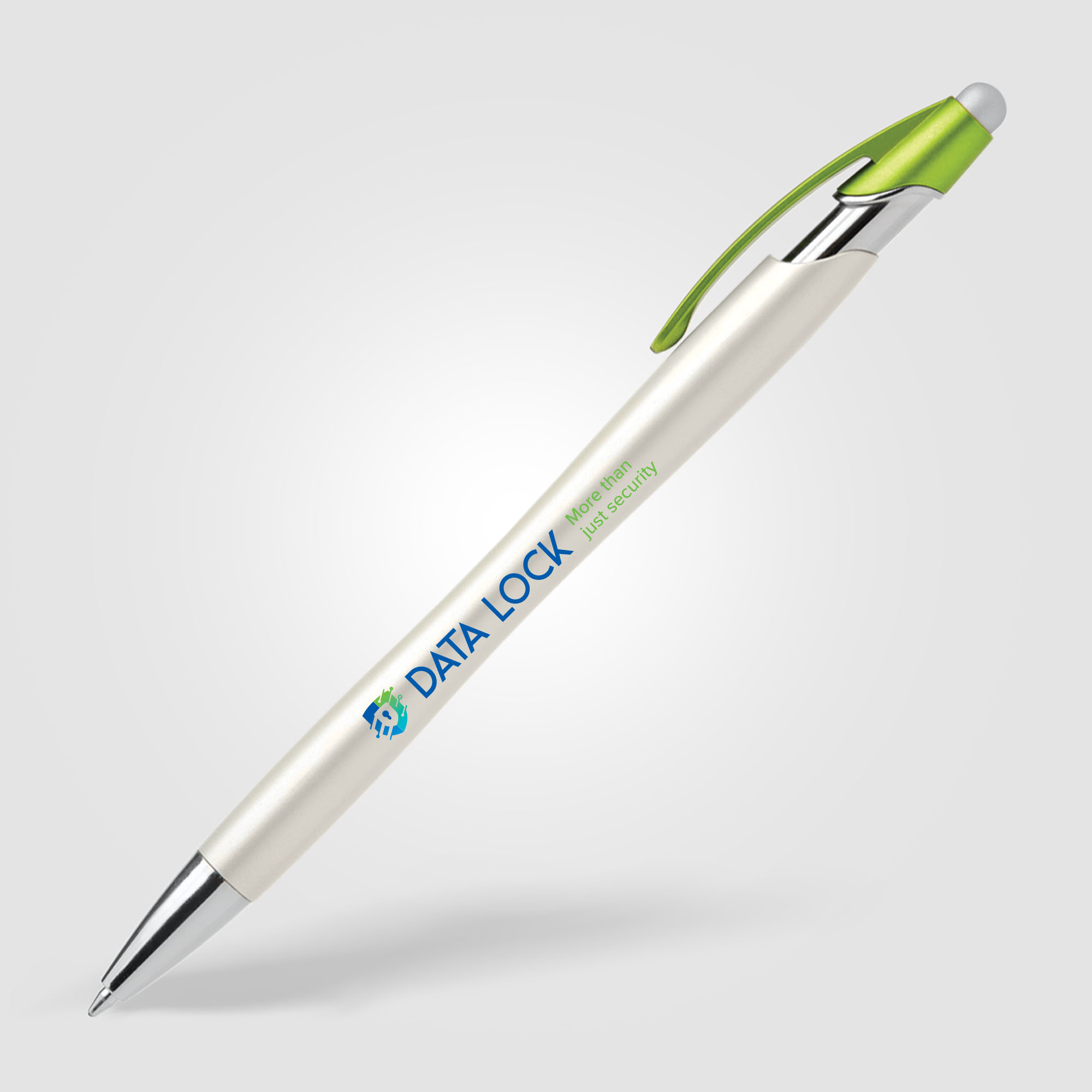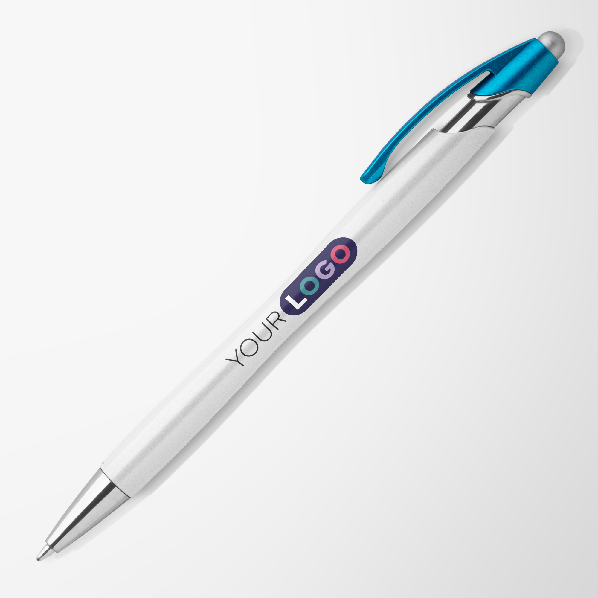 This plastic ballpoint pen features one of our most popular pen styles, now offered with a pearlized metallic painted barrel, chrome accents, colored clip and satin silver stylus. Customize the white pearlized barrel by selecting a clip color and matching 1-color silkscreen imprint.