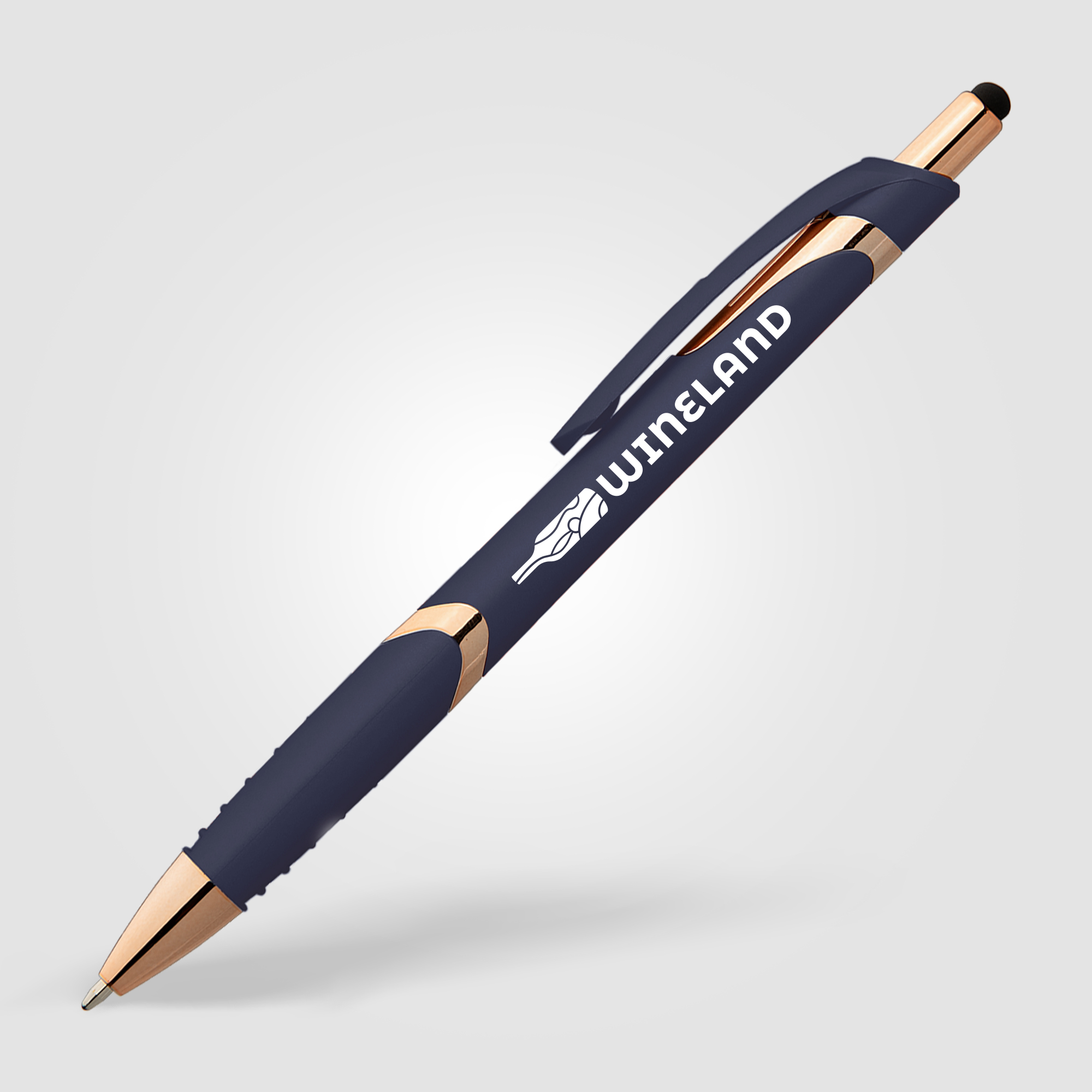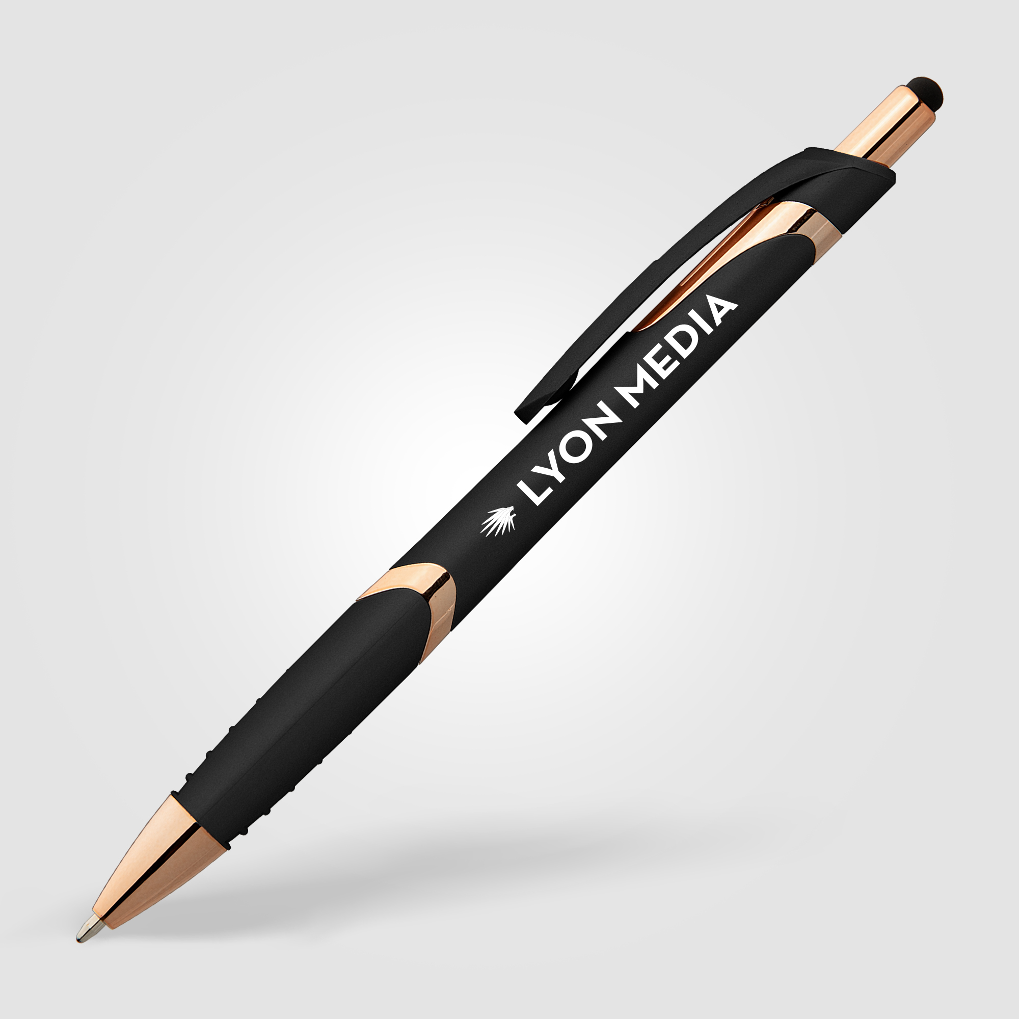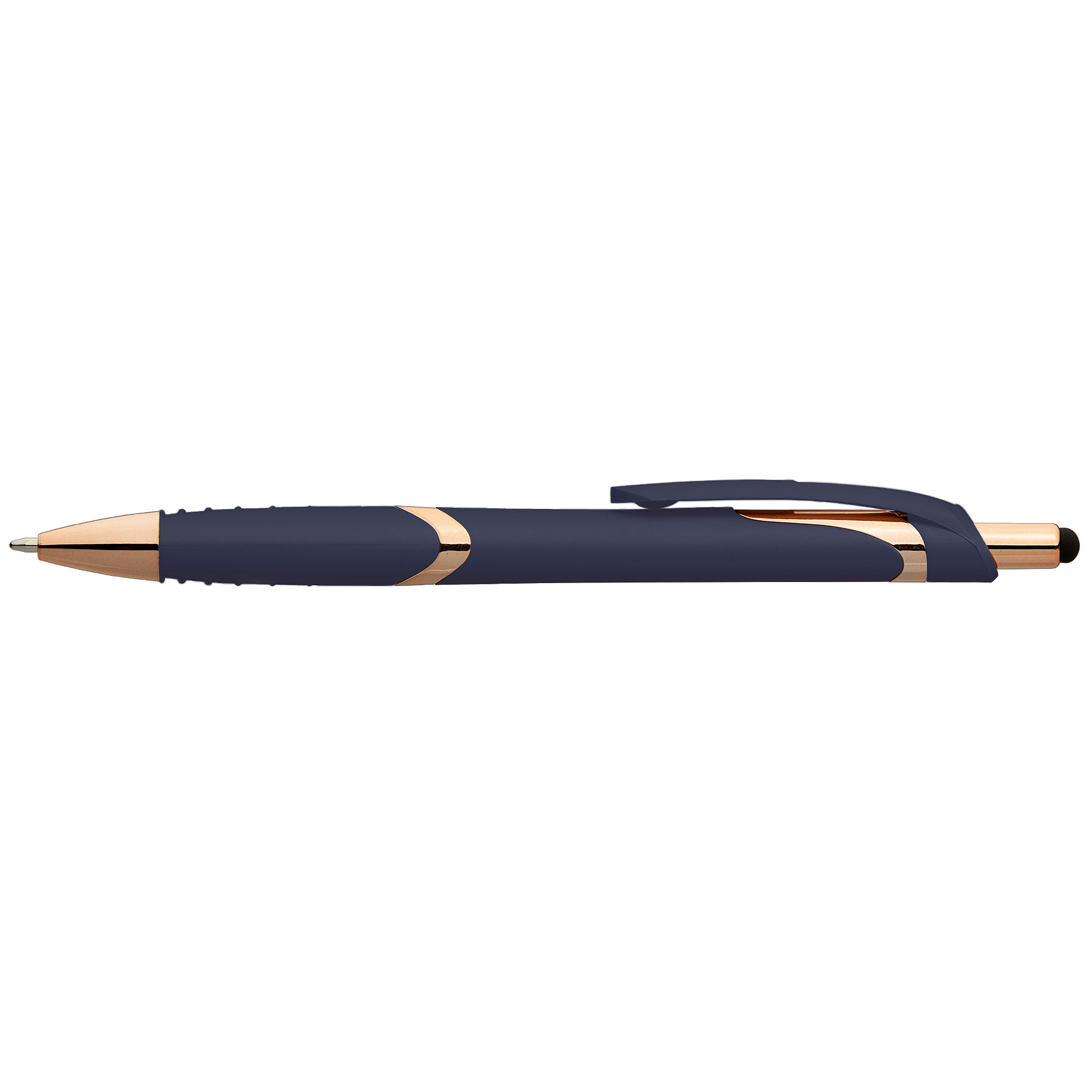 The Solana Softy Rose Gold with Stylus features super-stylish rose gold accents that really shine next to luxurious soft-touch barrel colors. This click-action plastic retractable ballpoint pen features a soft, rubberized barrel with a matching grip, plus capacitive stylus for use with all your digital touchscreen devices. . This stylish pen is an ideal way to promote your brand and delight your fans!