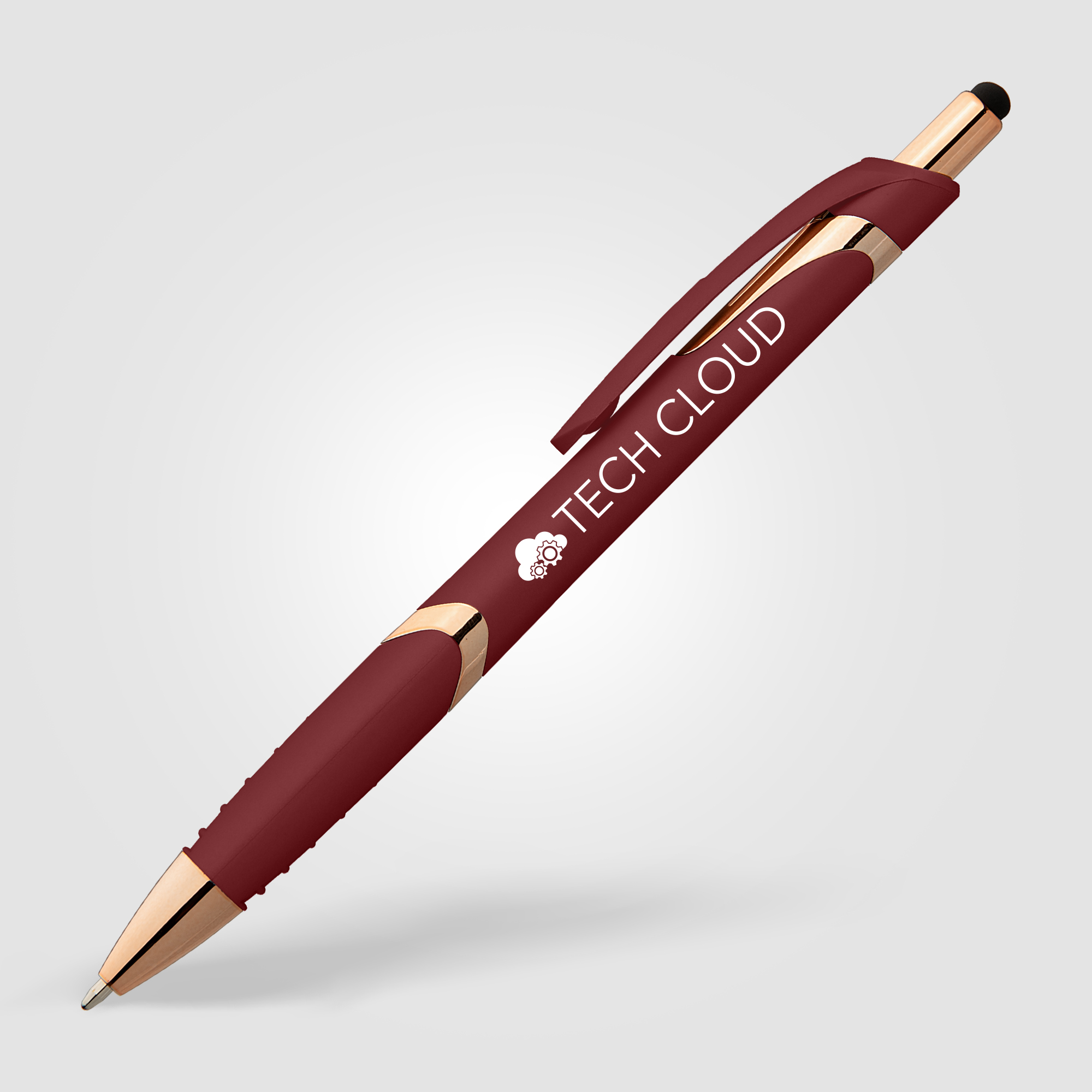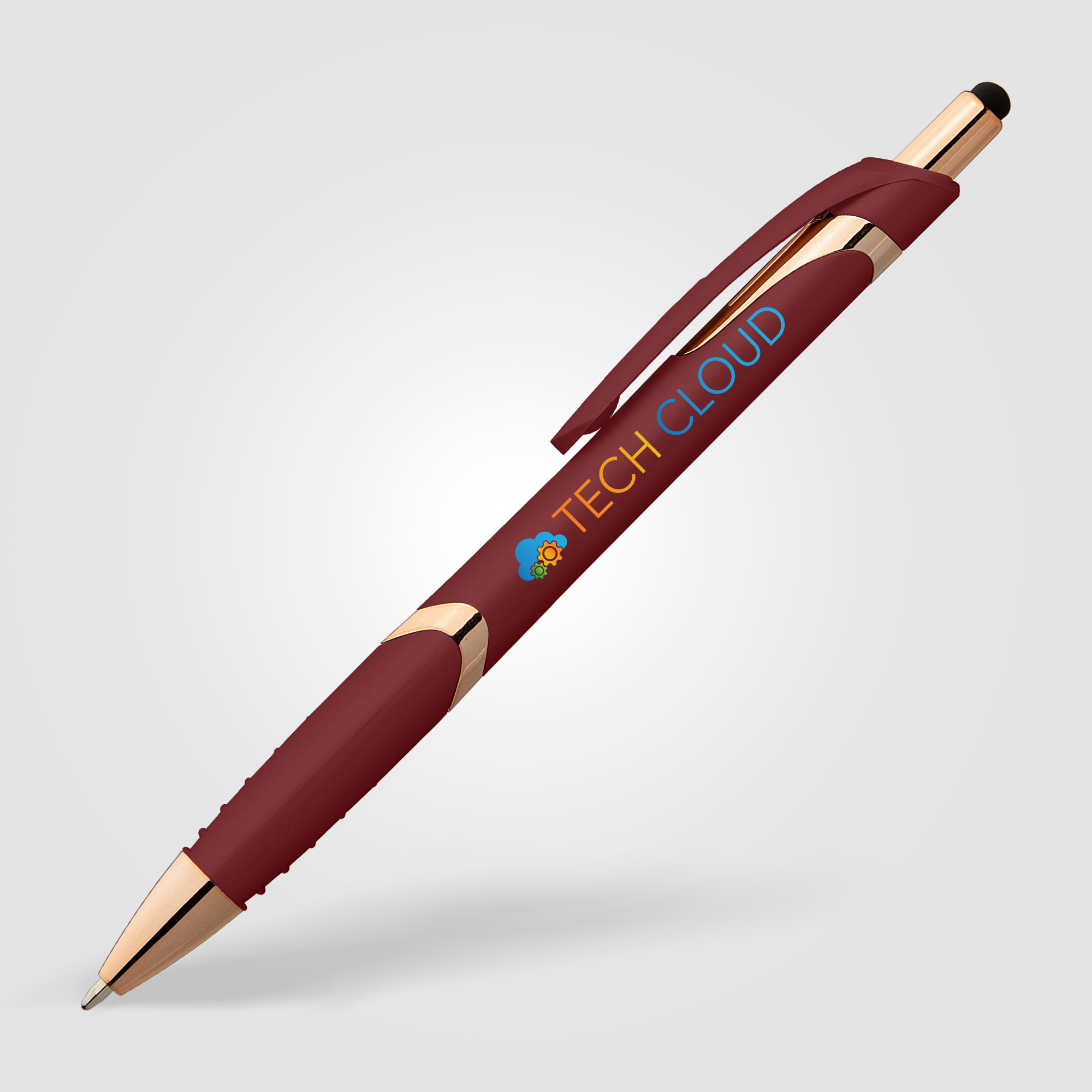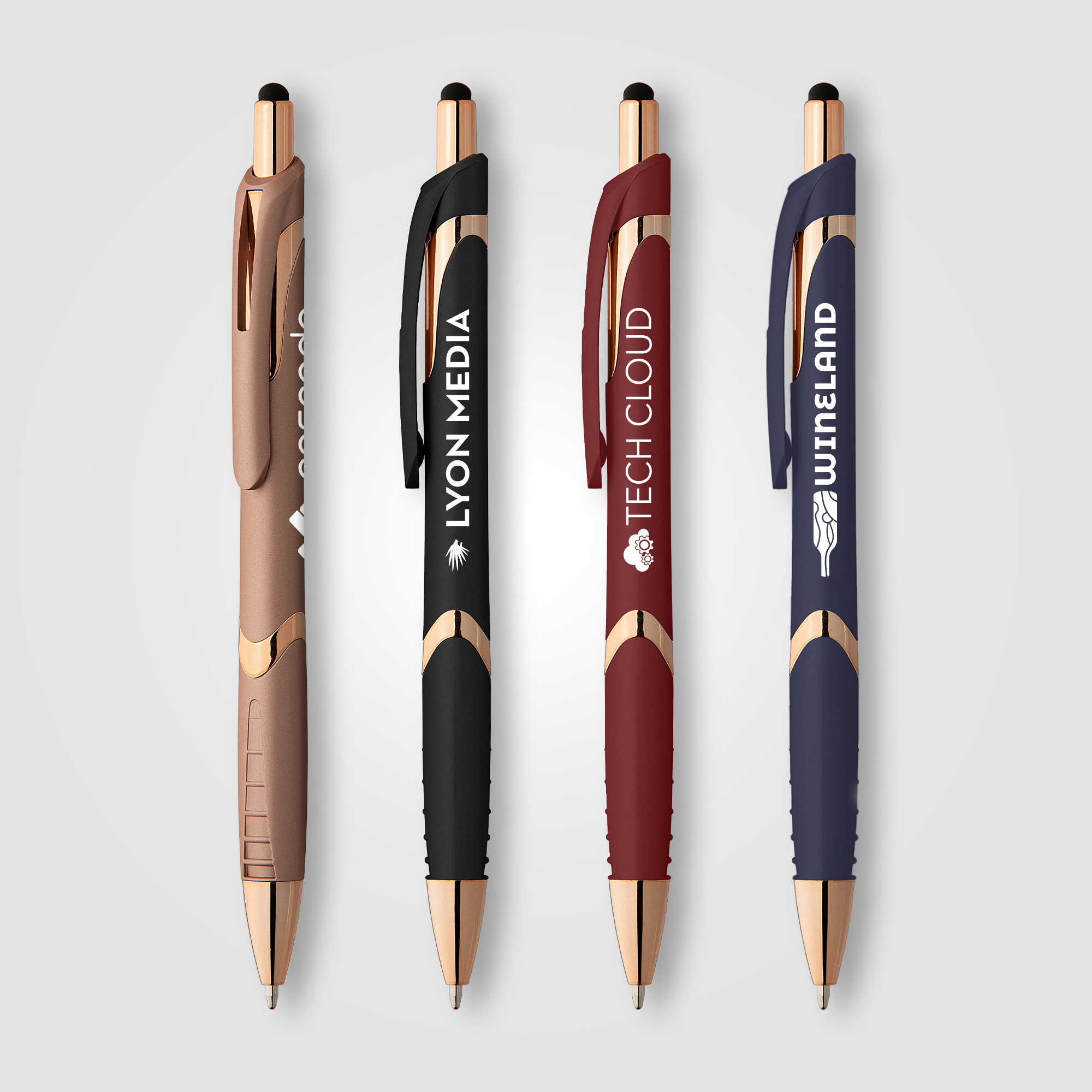 The Solana Softy Rose Gold with Stylus features super-stylish rose gold accents that really shine next to luxurious soft-touch barrel colors. This click-action plastic retractable ballpoint pen features a soft, rubberized barrel with a matching grip, plus capacitive stylus for use with all your digital touchscreen devices. . This stylish pen is an ideal way to promote your brand and delight your fans!