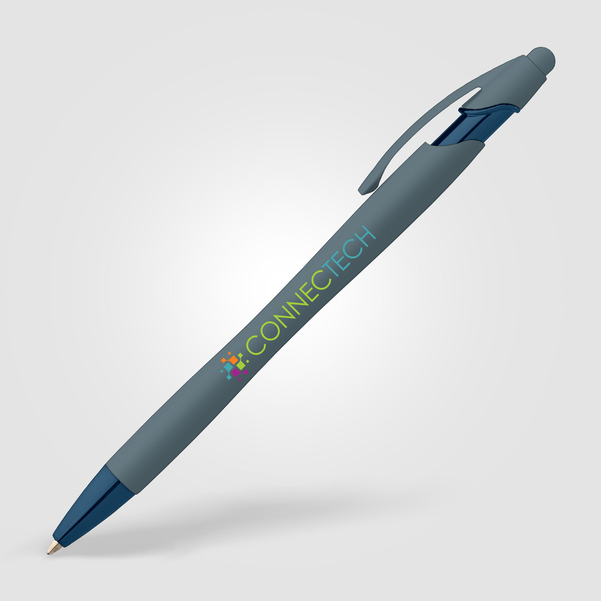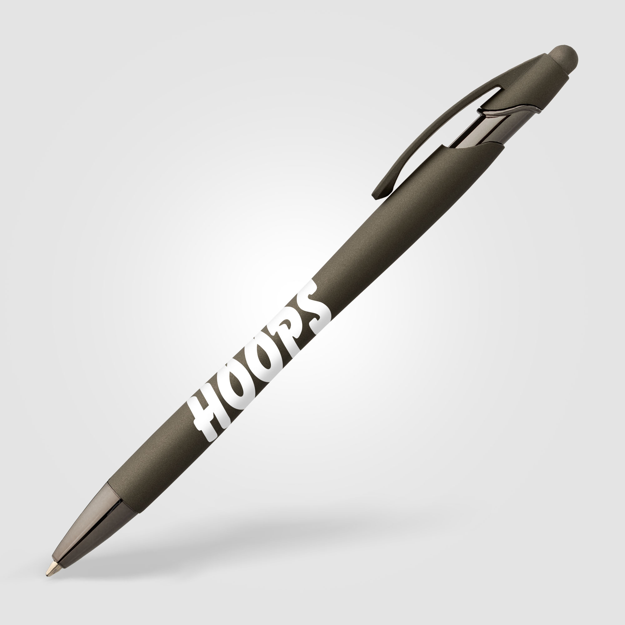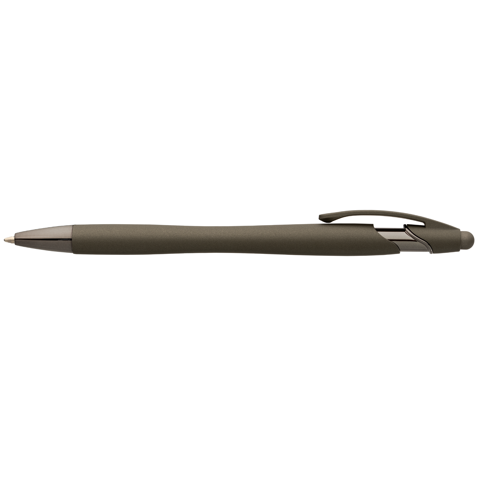 Once clients hold the La Jolla Softy Pen with Stylus, they'll want to use it daily. This sleek, elegant plastic pen uses a trendy monochromatic look throughout the barrel and trim, plus a metallic finish that looks great and is stunning. This medium black ballpoint pen also features a stylus at the top, making this the perfect 2-in-1 advertising gift. .