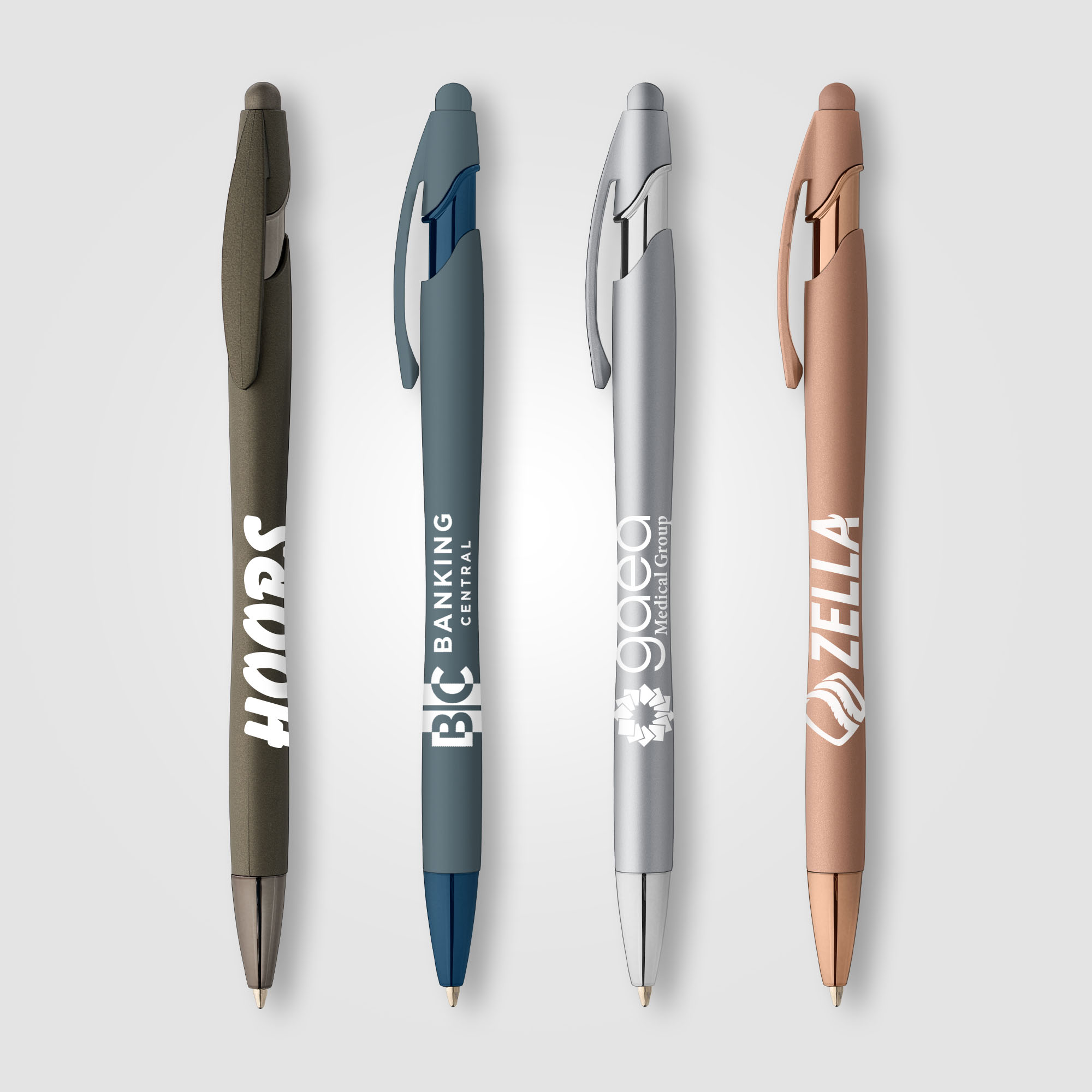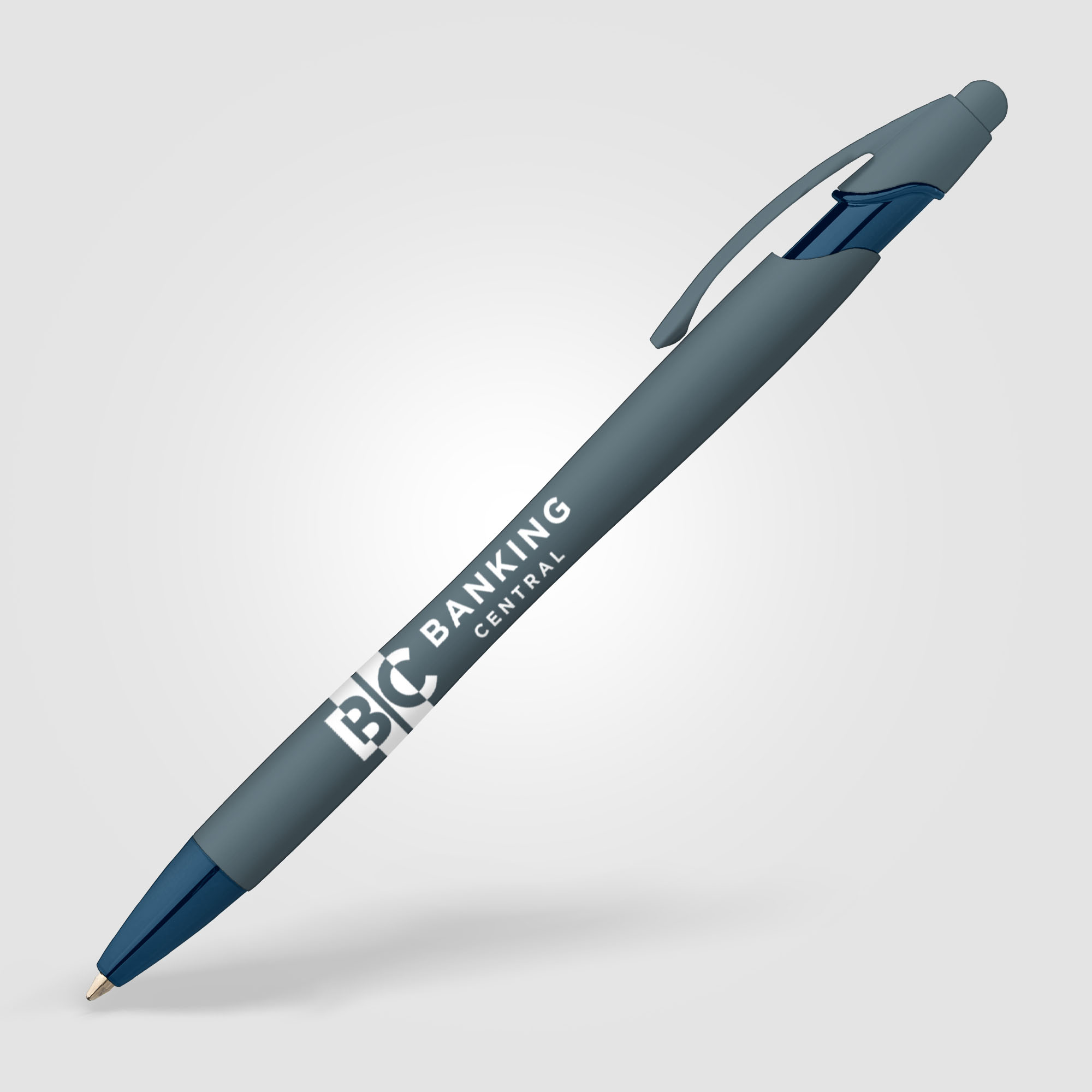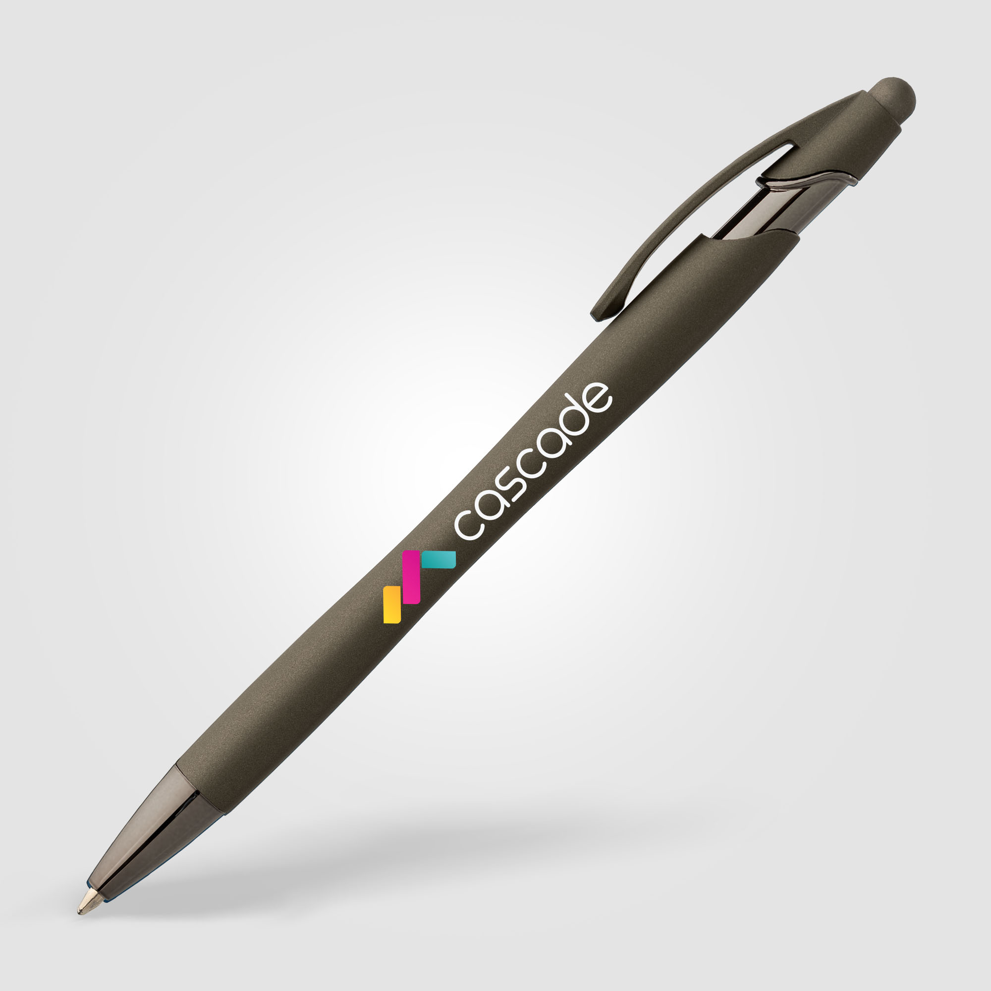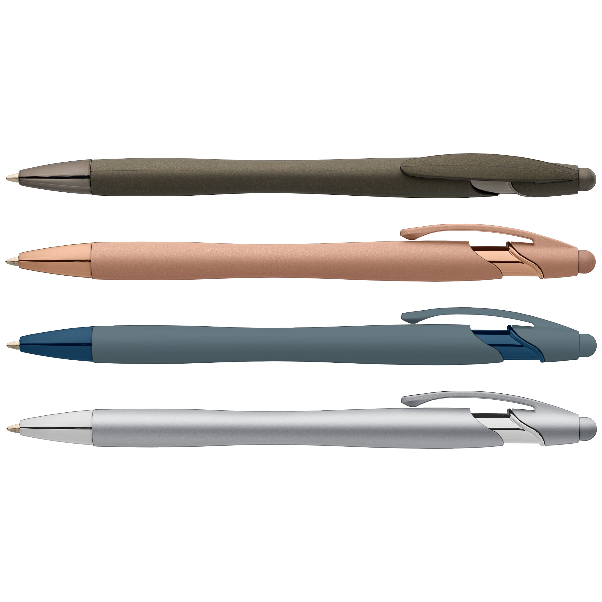 Once clients hold the La Jolla Softy Pen with Stylus, they'll want to use it daily. This sleek, elegant plastic pen uses a trendy monochromatic look throughout the barrel and trim, plus a metallic finish that looks great and is stunning. This medium black ballpoint pen also features a stylus at the top, making this the perfect 2-in-1 advertising gift. .
