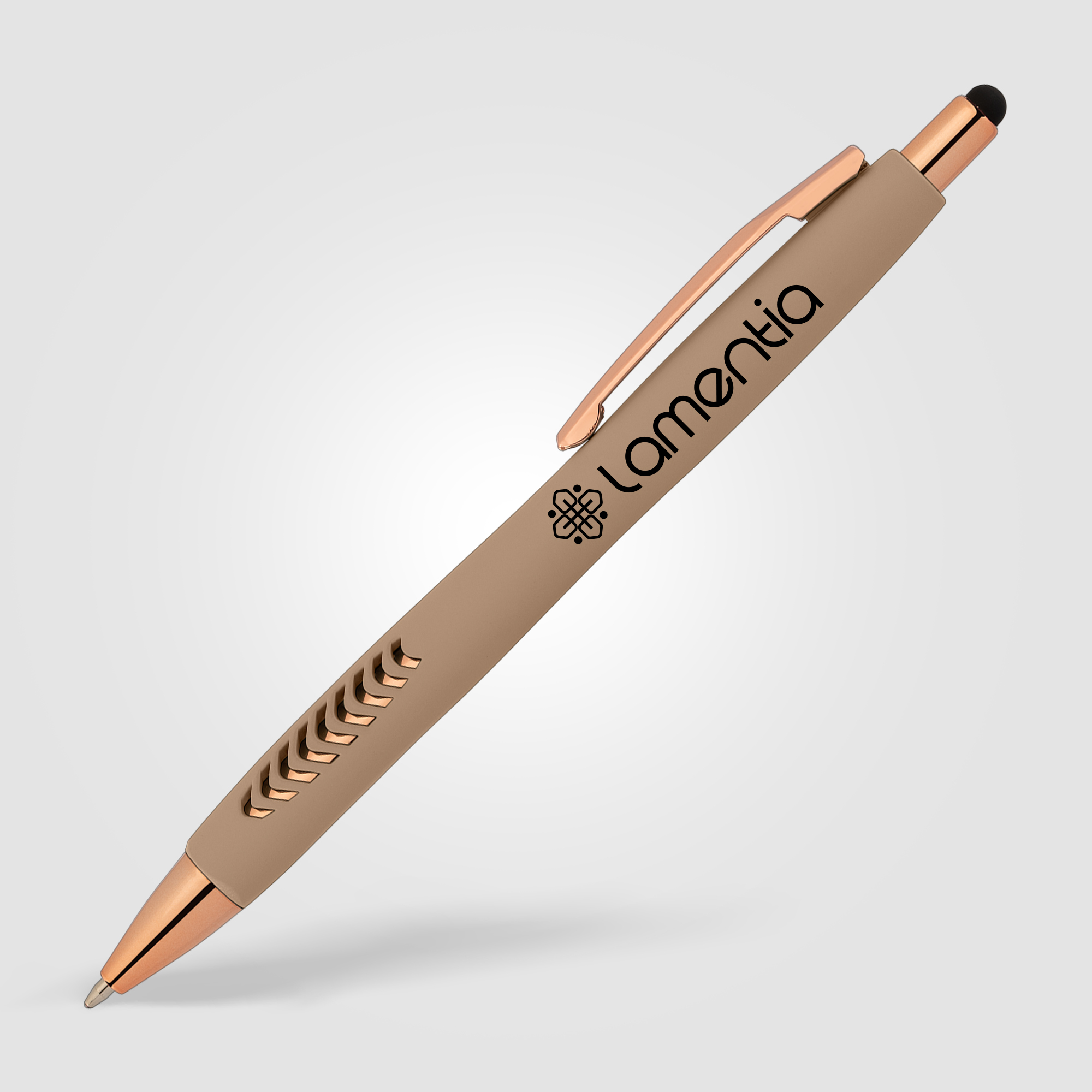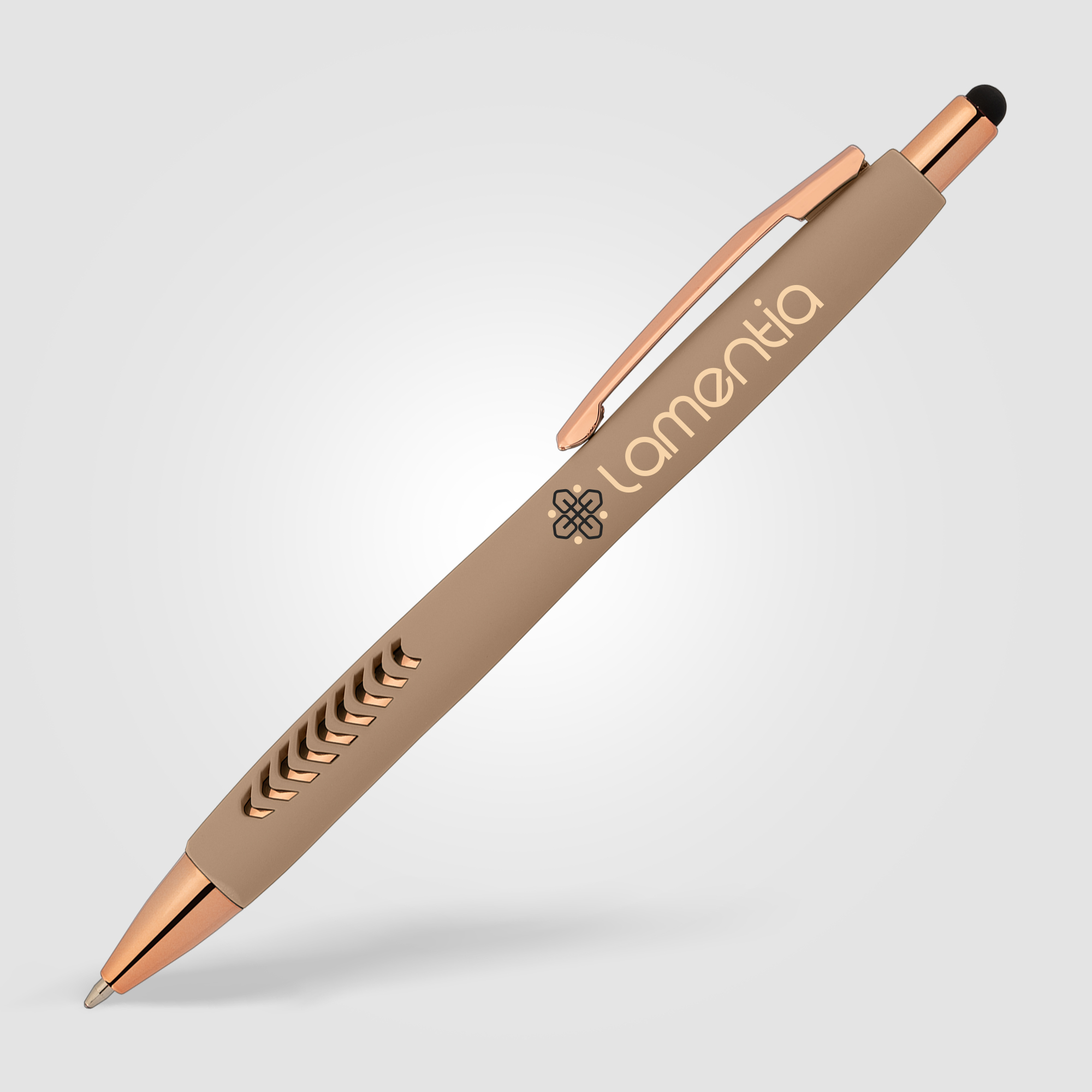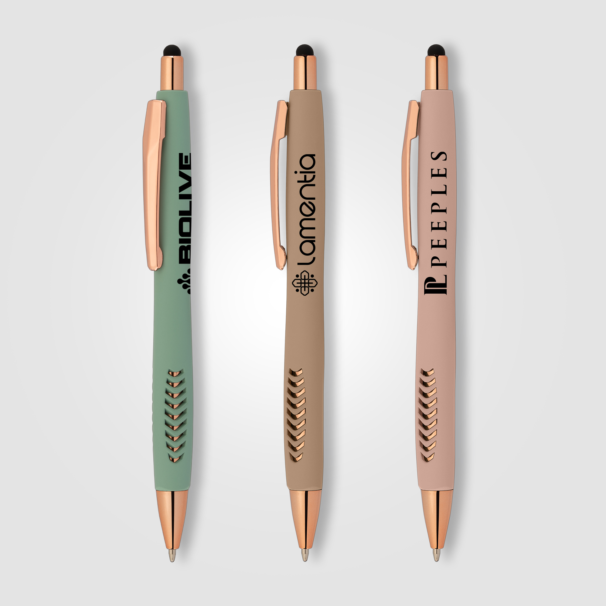 Presenting our Avalon Softy Rose Gold Designer Pen with Stylus – Featuring a luxurious soft touch finish and a rose gold die-cut pattern in the grip designed in a triangle shape, this pen effortlessly combines style and comfort. The barrel is expertly crafted from ABS plastic with a rubber finish, and the rose gold trim adds a touch of elegance to the tip, plunger, and clip. A black stylus is included for added functionality. Your logo will be imprinted in Full ColorJet.