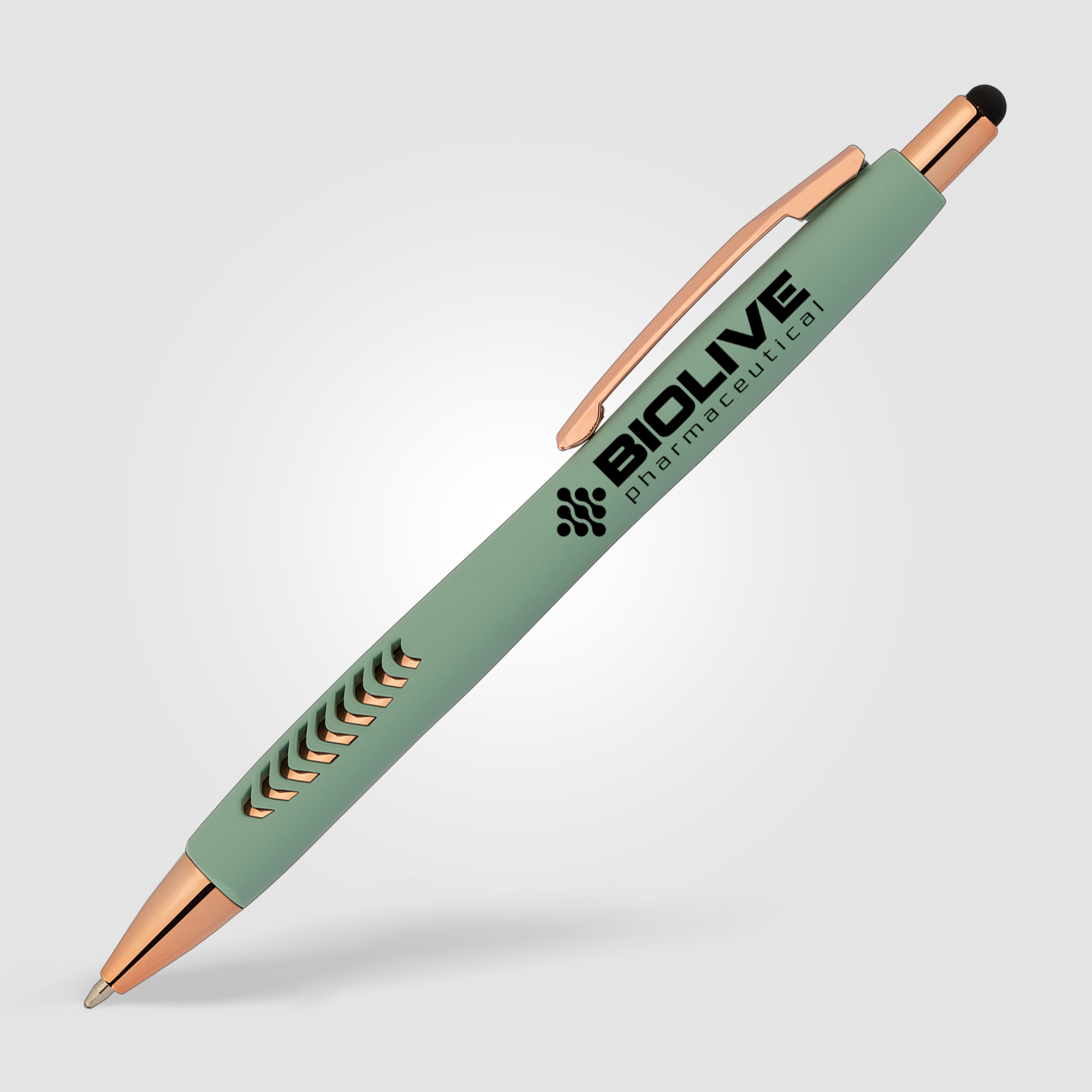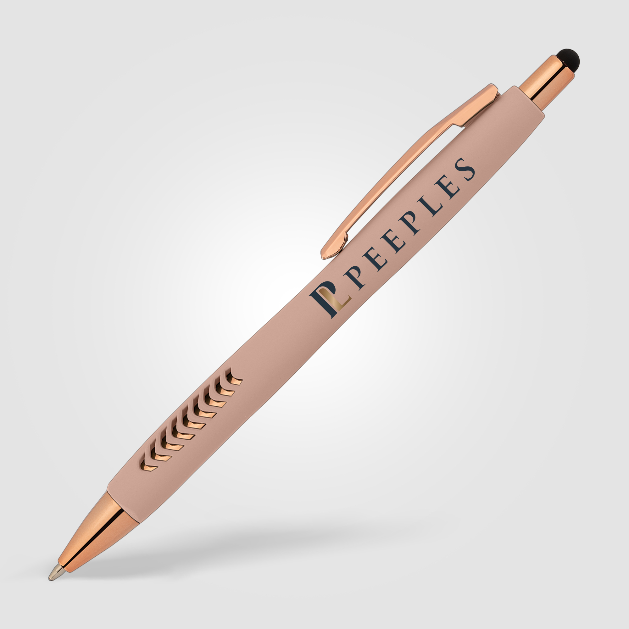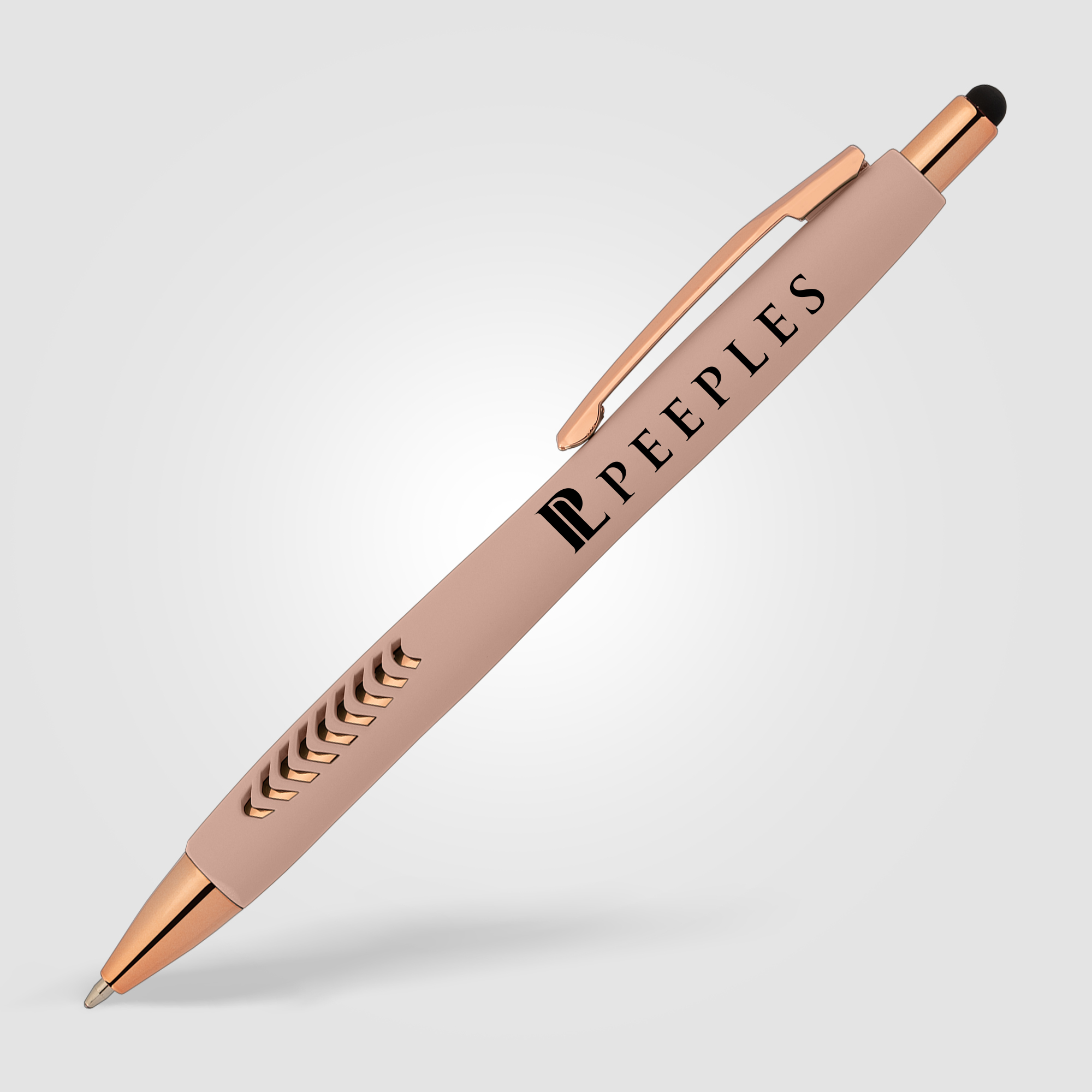 Presenting our Avalon Softy Rose Gold Designer Pen with Stylus – Featuring a luxurious soft touch finish and a rose gold die-cut pattern in the grip designed in a triangle shape, this pen effortlessly combines style and comfort. The barrel is expertly crafted from ABS plastic with a rubber finish, and the rose gold trim adds a touch of elegance to the tip, plunger, and clip. A black stylus is included for added functionality. Your logo will be imprinted in Full ColorJet.