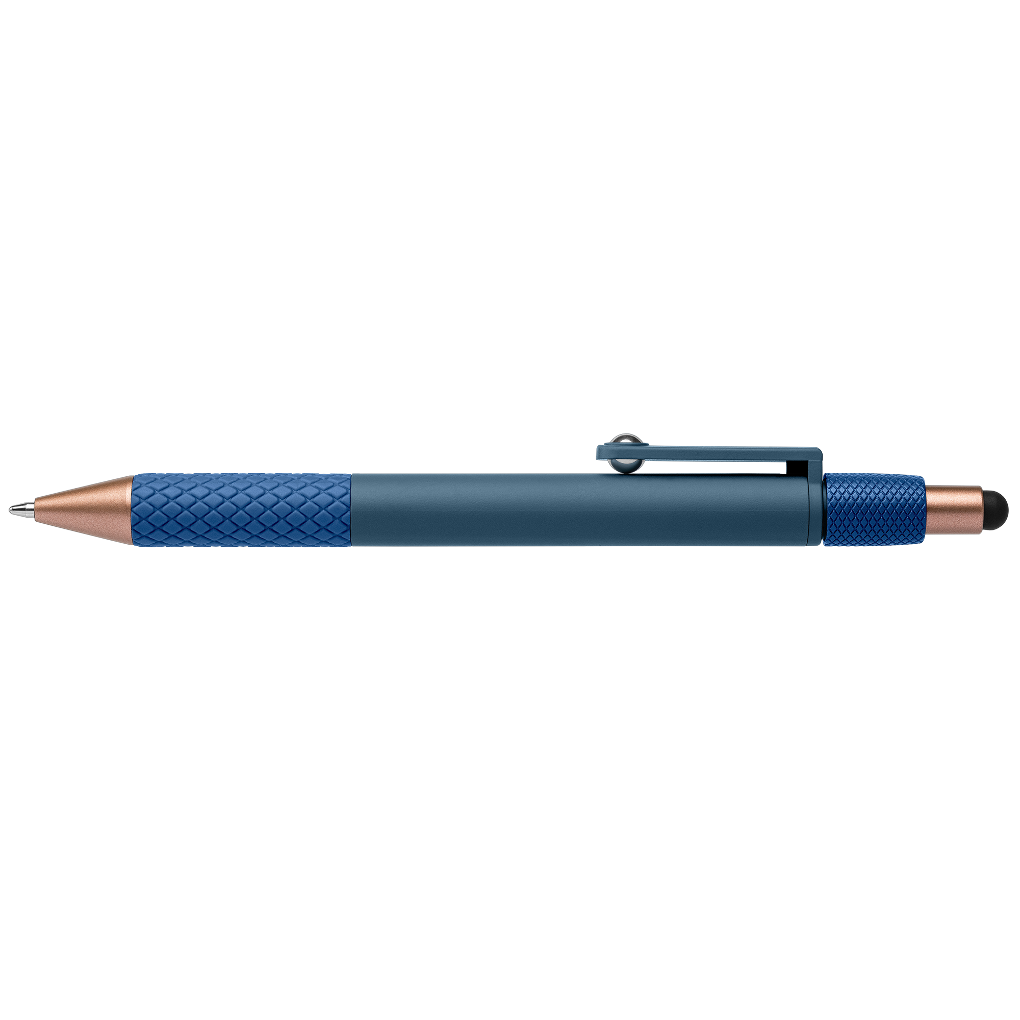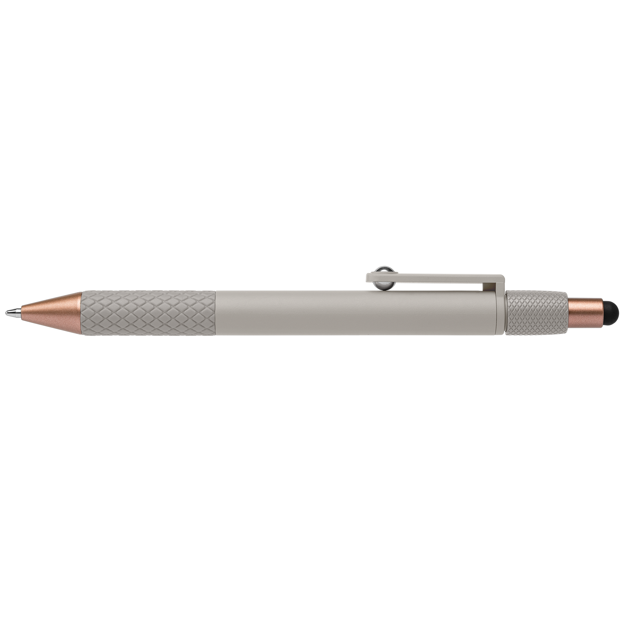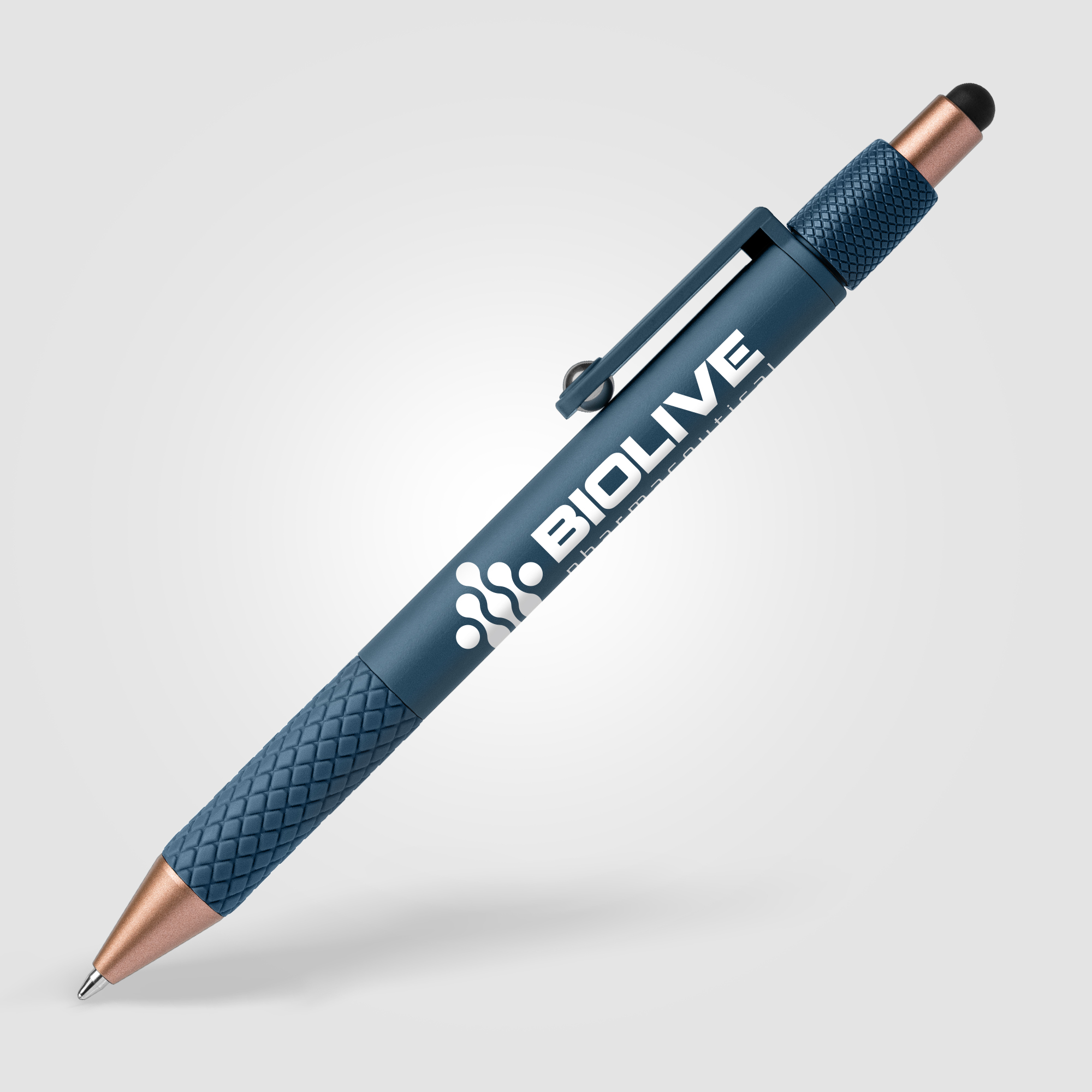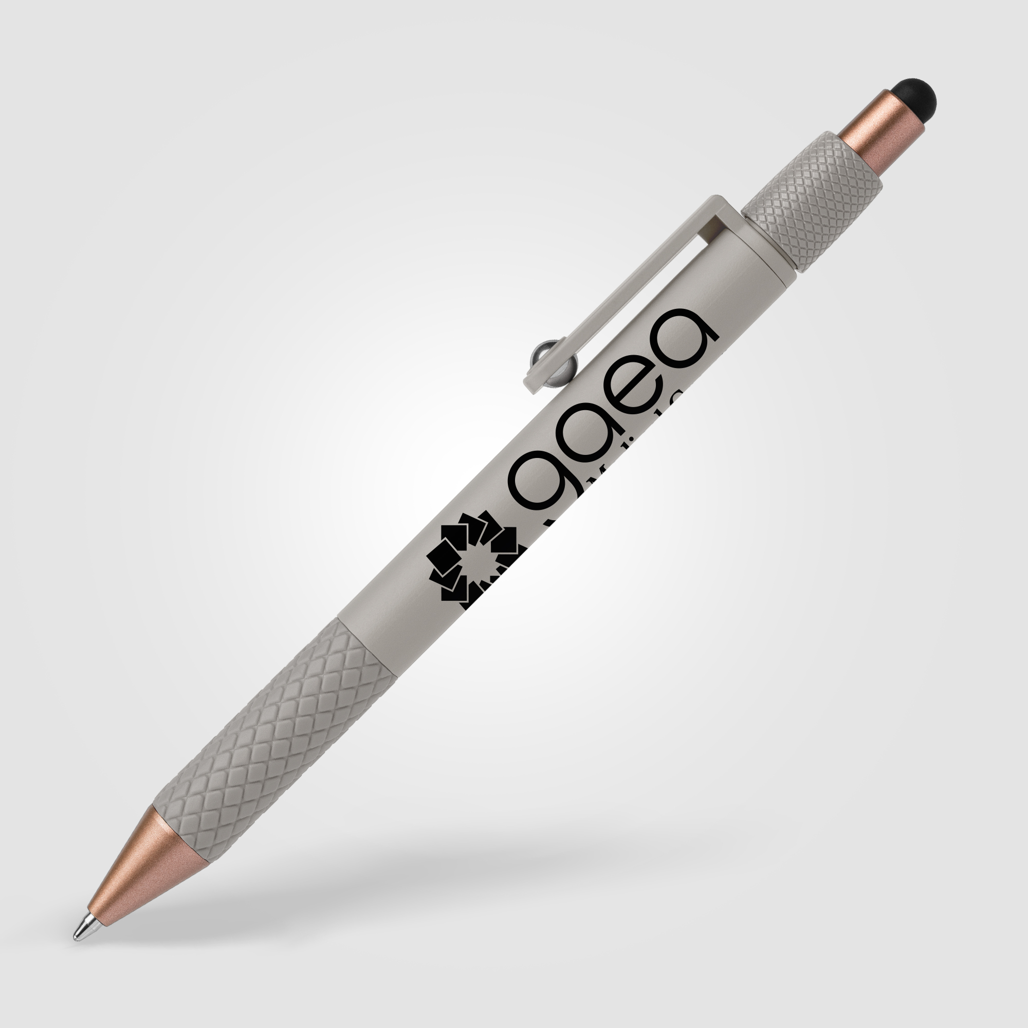 The Nora Recycled Plastic Relax Fidget Stylus Pen blends tactile appeal with smart functionality. The rABS plastic barrel is coated in a soft-touch finish, paired with matte bronze ABS trim for a sleek, modern look. A matching diamond pattern adds texture to the grip and spinner section, which glides smoothly and quietly thanks to a built-in bearing that offers a subtle fidget-friendly touch. A black rubber stylus on the plunger works seamlessly with all touchscreen devices, while the clip includes a stainless steel ball that rolls when pressed. Fitted with a slim 1.0mm Dokumental Ink refill for a smooth, consistent writing experience.