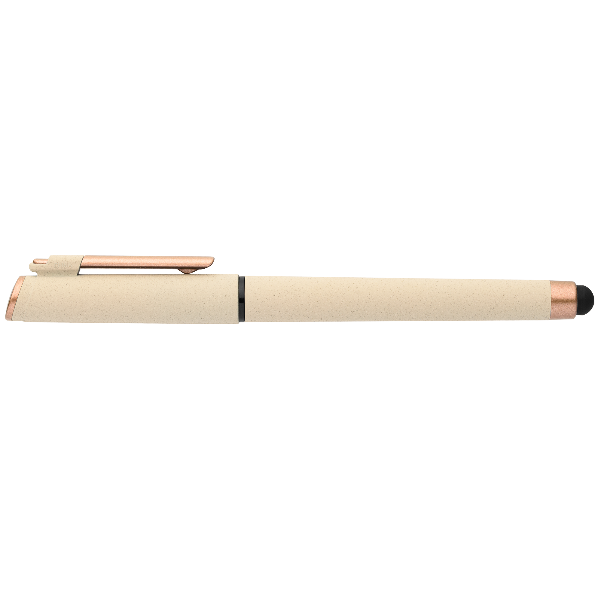 Unleash effortless elegance and mindful innovation with the York Recycled Plastic Bronze Trim Stylus Gel Pen. Crafted from recycled durable ABS plastic, its sleek barrel boasts a sophisticated stone paint finish, beautifully complemented by contemporary matte bronze trims. The integrated black rubber stylus ensures precise touchscreen control, while the 0.7mm gel ink refill delivers clean, consistent lines across a 400-meter writing range. Available in an exclusive monochrome palette of Red, Forest, Sage, Navy, Stone, and Black, the York Pen is the ultimate choice for modern branding that speaks volumes about style and responsibility.