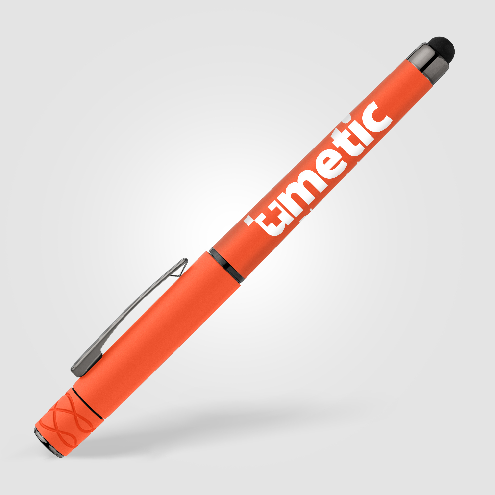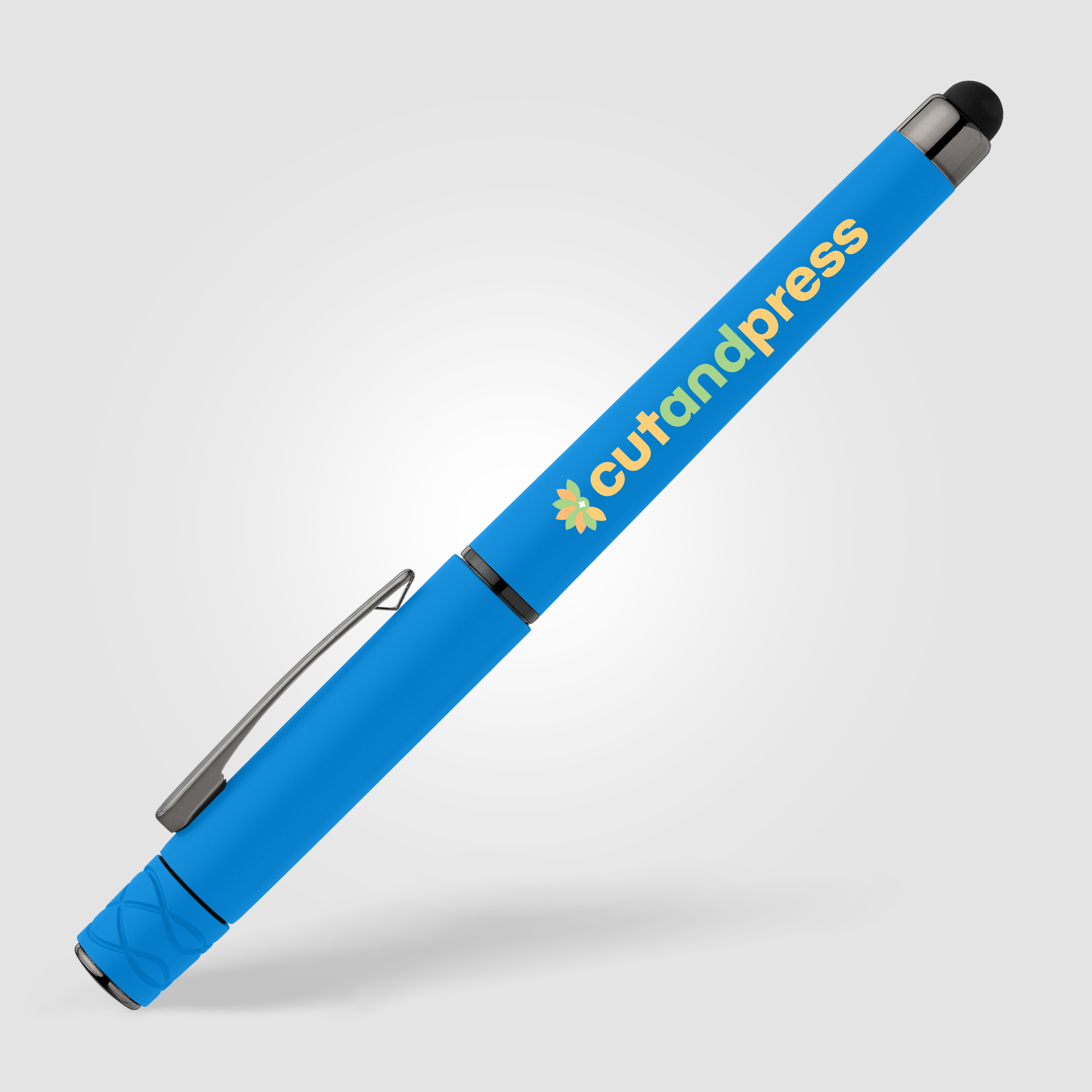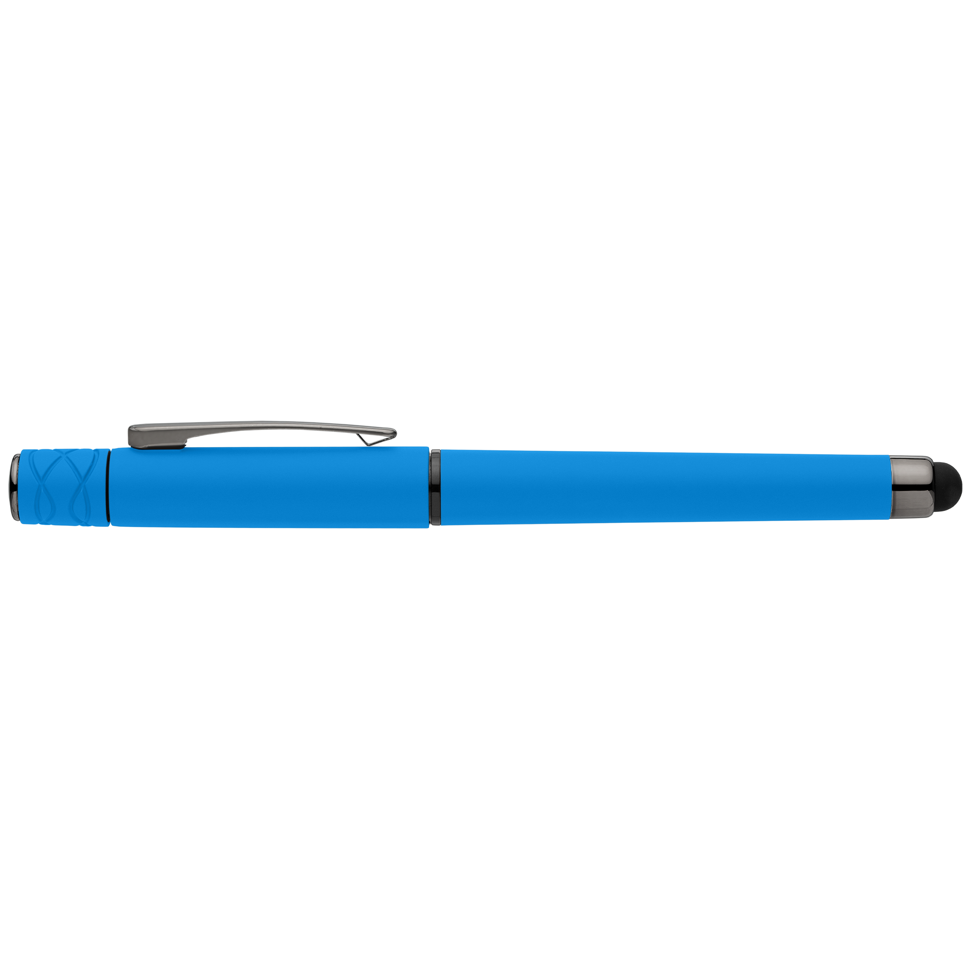 Boost focus with the Tavi Pen, a multifunctional tool designed for both writing and relaxation. This pen's barrel is made from recycled plastic (rABS). It also features a rubber painted soft-touch barrel in bright, fun colors. The standout feature is the fidget spinner integrated into the top of the cap, which has a wave pattern etched into the plastic for tactile engagement. The Tavi pen also includes a black rubber stylus at the end of the barrel and a black grip with a diamond pattern for comfortable writing. It is equipped with a gel ink refill that delivers smooth black ink through a 0.7mm tip and offers a 500-meter write out length. The pen's end, tip, and steel clip are finished with dark shiny gunmetal accents, providing a sleek contrast to the bright colors.