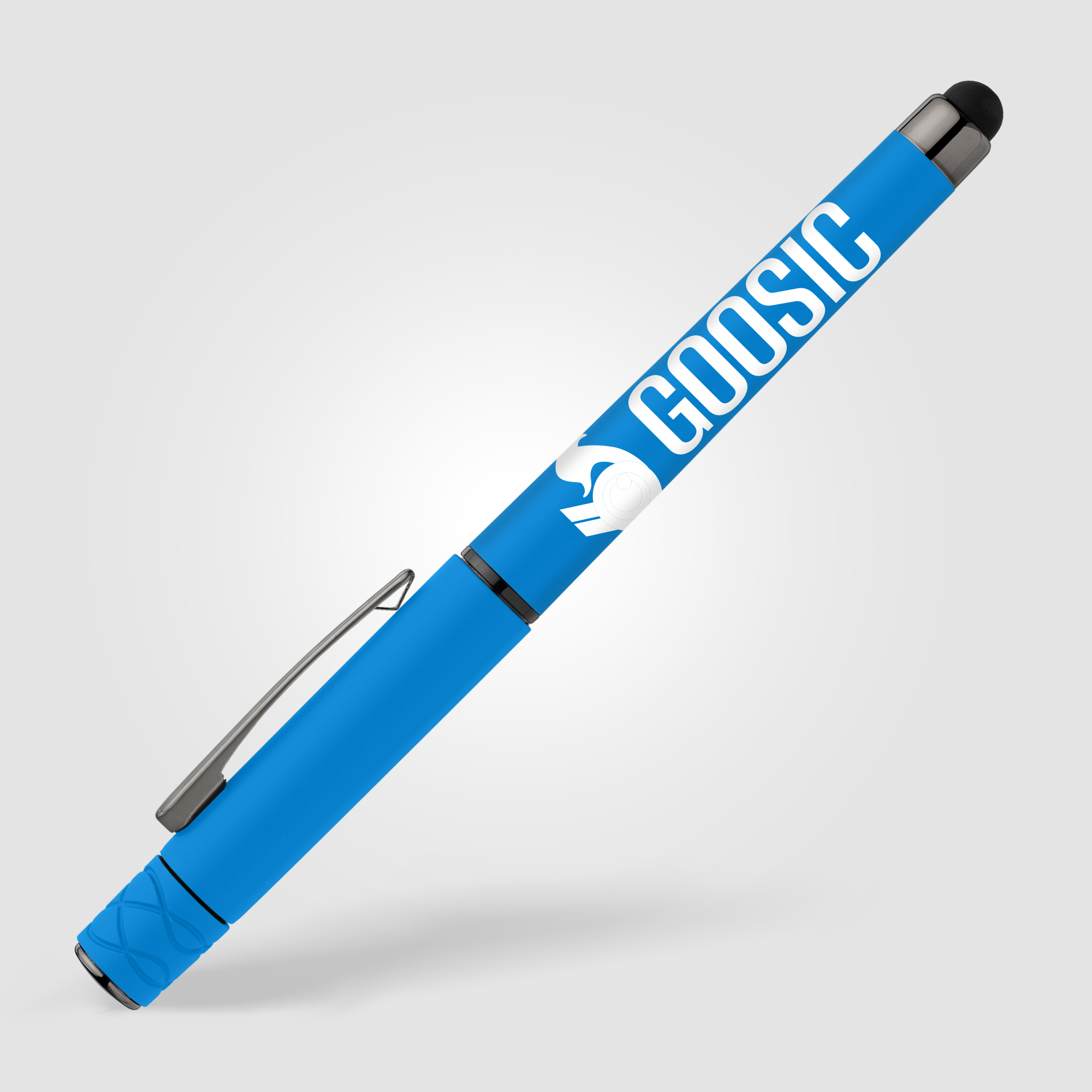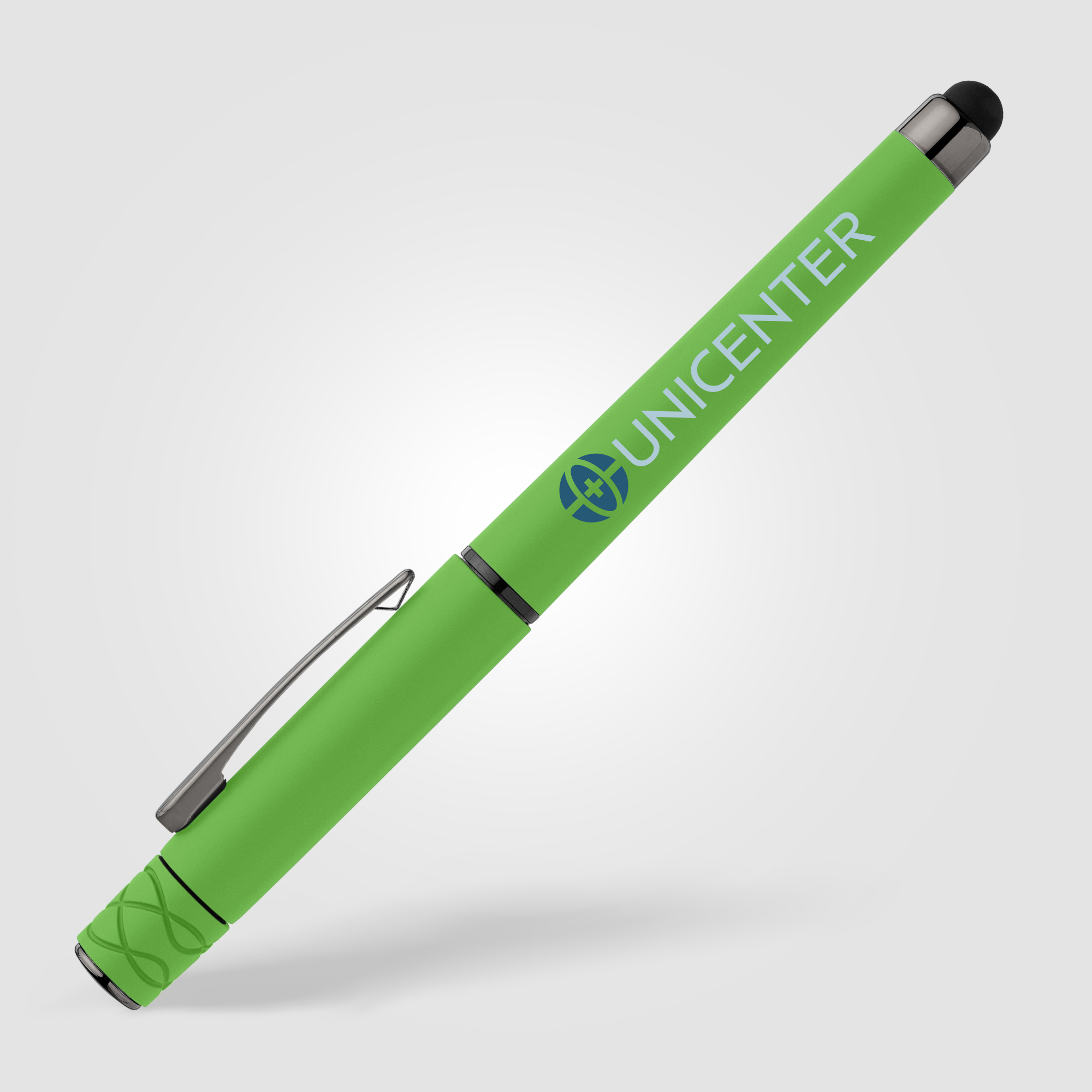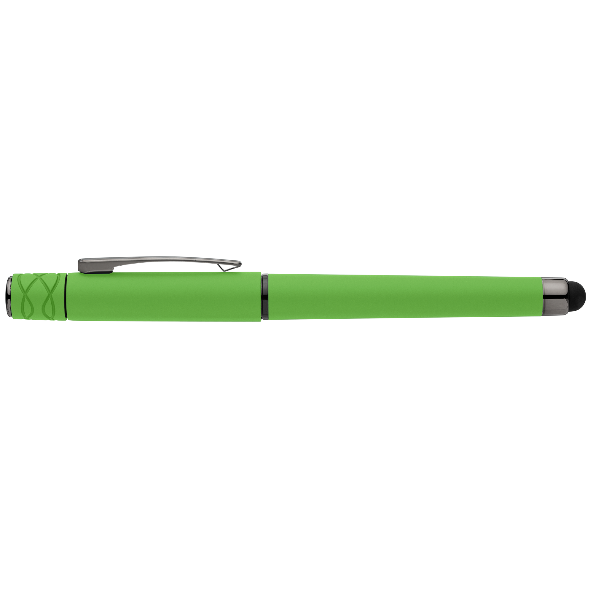 Boost focus with the Tavi Pen, a multifunctional tool designed for both writing and relaxation. This pen's barrel is made from recycled plastic (rABS). It also features a rubber painted soft-touch barrel in bright, fun colors. The standout feature is the fidget spinner integrated into the top of the cap, which has a wave pattern etched into the plastic for tactile engagement. The Tavi pen also includes a black rubber stylus at the end of the barrel and a black grip with a diamond pattern for comfortable writing. It is equipped with a gel ink refill that delivers smooth black ink through a 0.7mm tip and offers a 500-meter write out length. The pen's end, tip, and steel clip are finished with dark shiny gunmetal accents, providing a sleek contrast to the bright colors.
