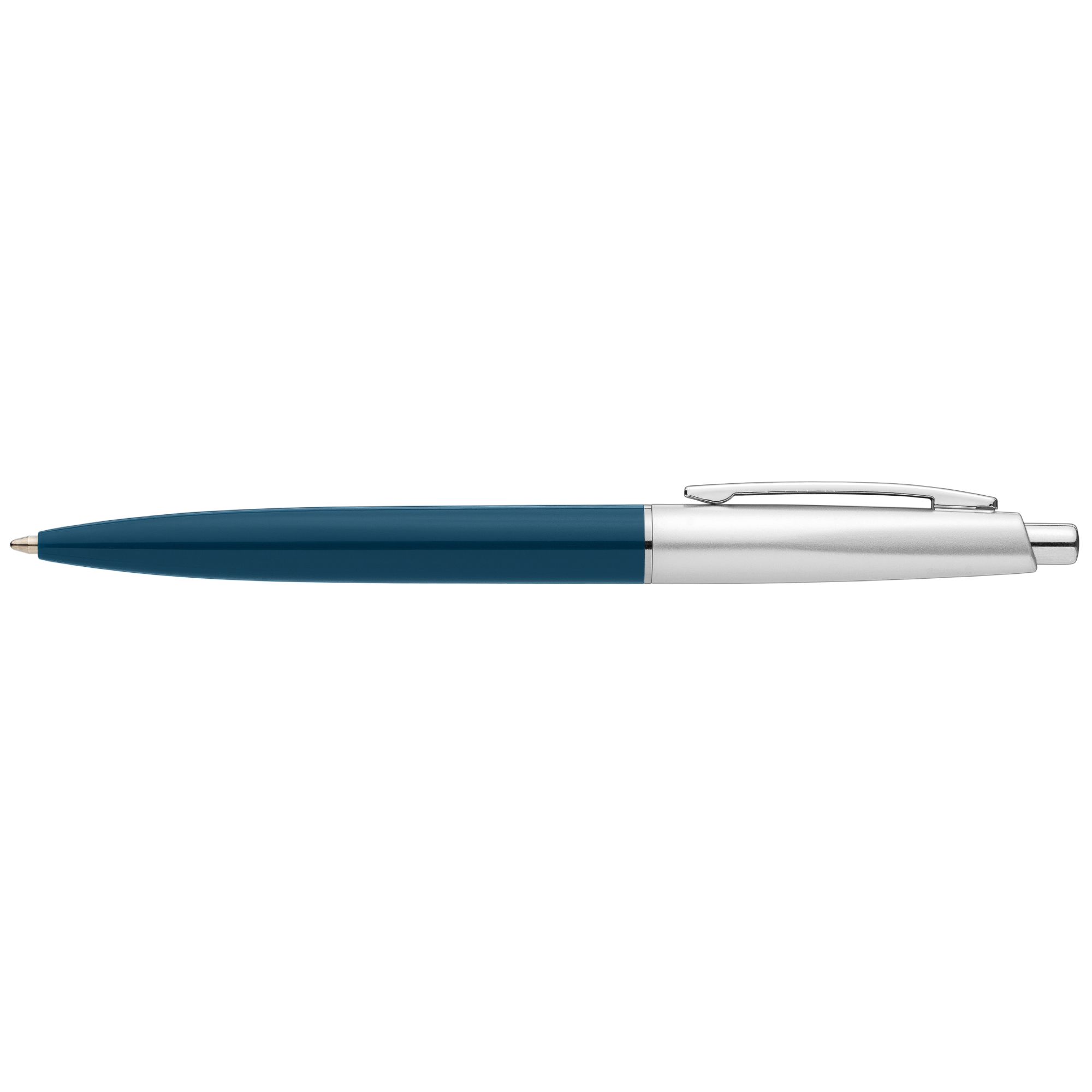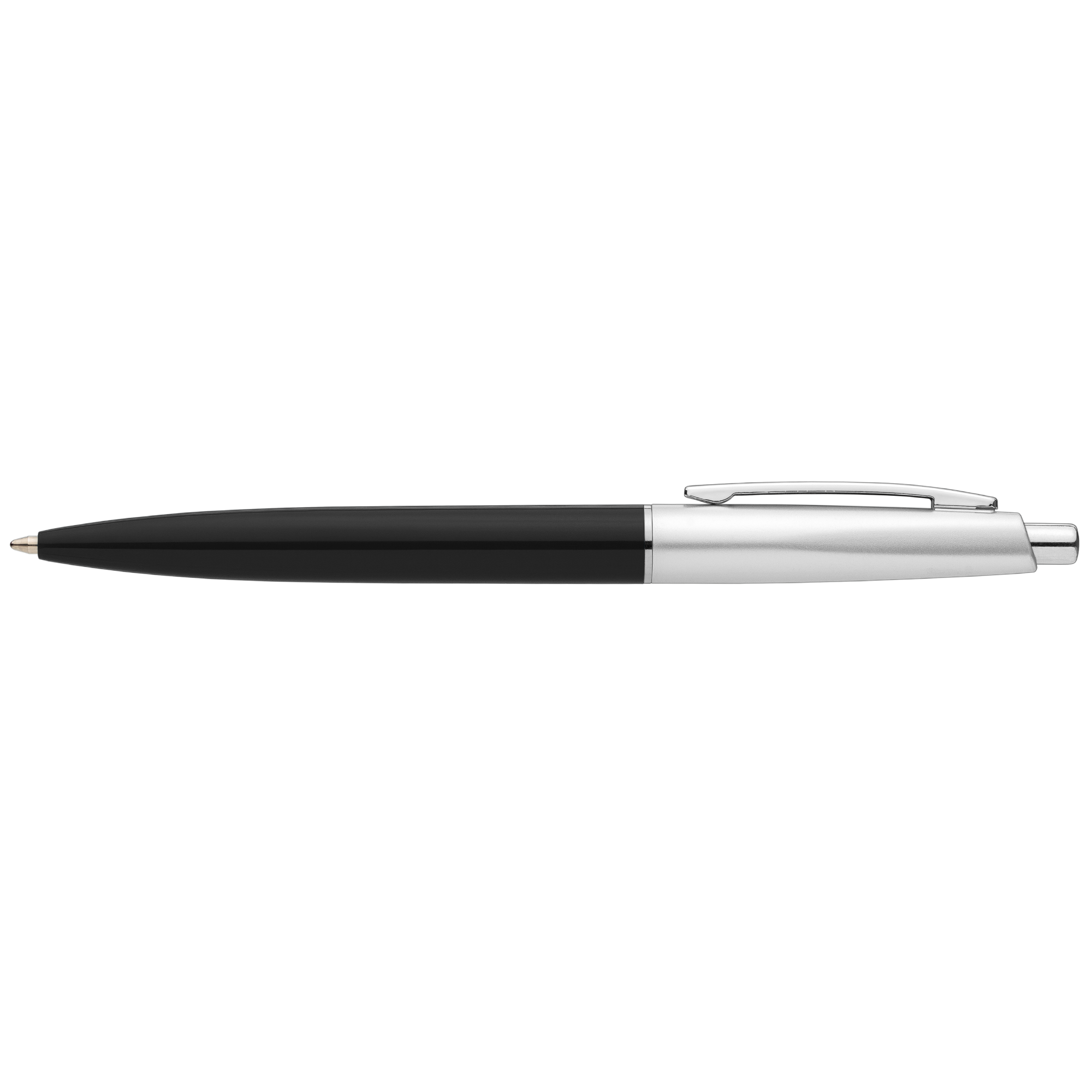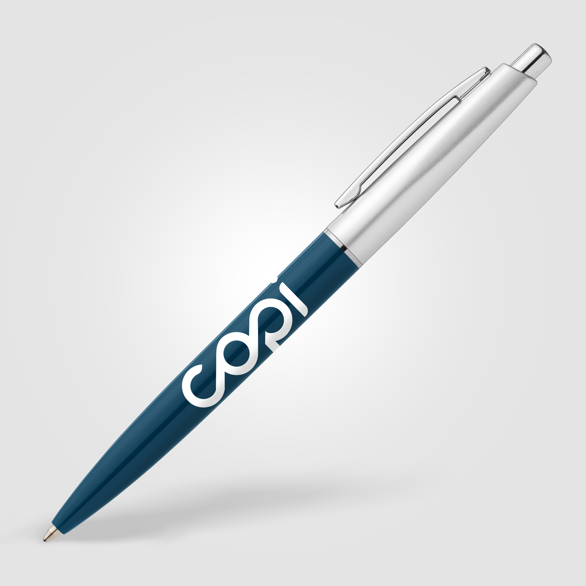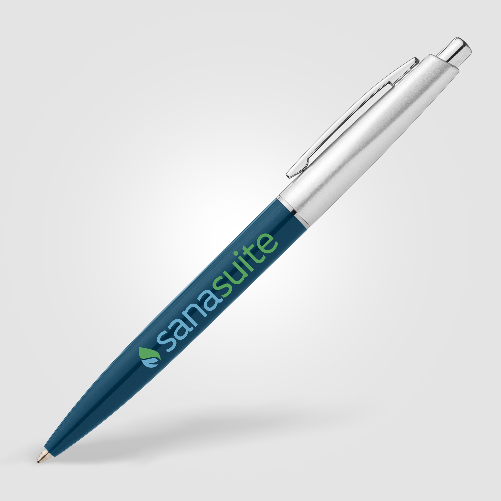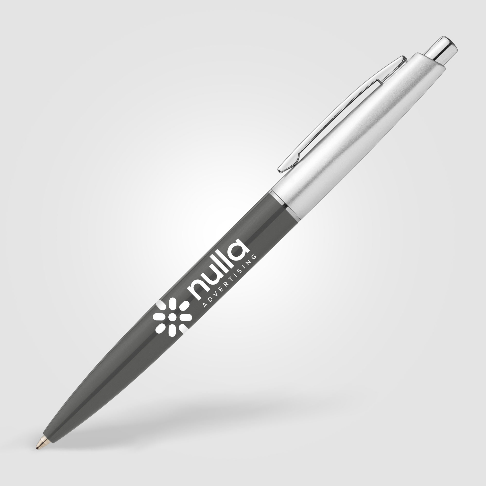 Meet the Natori Chrome Trim Pen, a modern interpretation of a classic style. This retractable pen's barrel is made from recycled plastic (rABS), featuring a molded color finish on the lower barrel and a contrasting chrome upper barrel, clip, and tip. The design offers an "old school" style with updated materials. The Natori pen is equipped with a high-quality Parker refill that delivers smooth black ink through a 1.0mm tip and boasts an impressive 800-meter write out length. Available in colors like red, navy, and grey, this pen combines a timeless look with reliable, long-lasting performance.