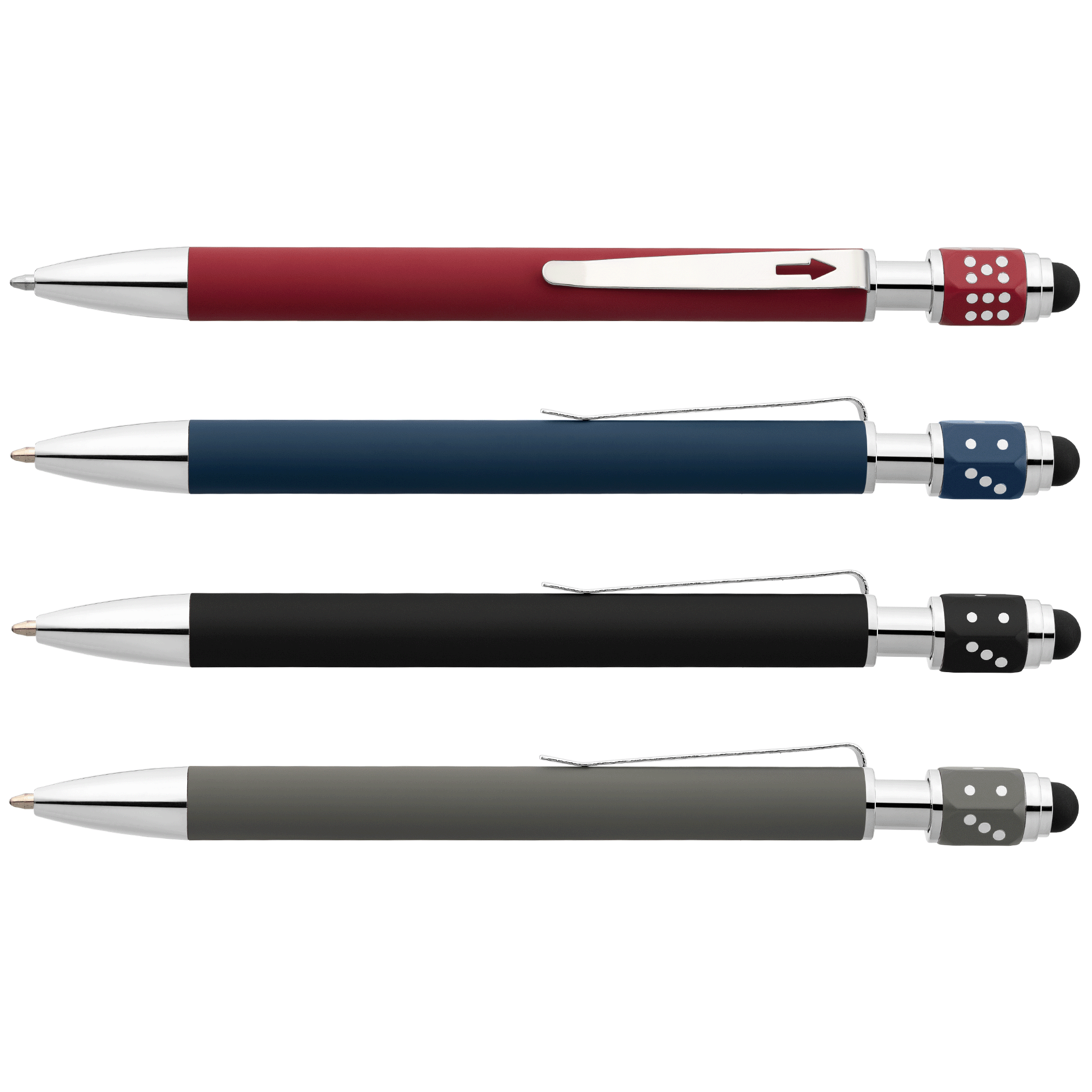 Spark creativity and connection with the Ace Recycled Aluminum Hex-Dice Spinner Pen. More than a writing tool, it’s a conversation starter with a playful edge. The recycled aluminum barrel features a smooth rubberized finish and chrome accents, paired with a 1.0 mm slim Dokumental® ink refill for clean, consistent lines and a 500-meter write-out. At the top, a hex-shaped ABS spinner with white dice-style markings spins quietly thanks to its built-in bearing. A black rubber stylus offers easy touchscreen use, while the chrome steel clip with an arrow cut-out adds a distinctive touch. Available in Burgundy, Navy, Gunmetal, and Black, it brings fun and function into perfect balance.
