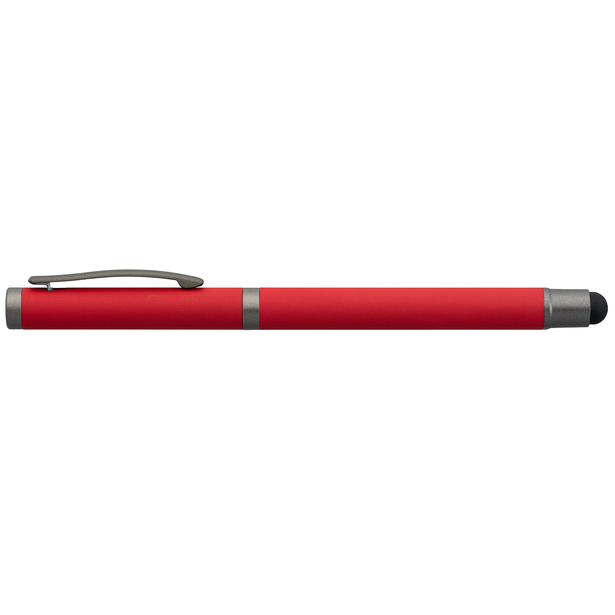 Experience the perfect fusion of modern sophistication with the Bowie Recycled Aluminum Stylus Gel Pen. Crafted with a recycled aluminum barrel featuring a unique shiny gunmetal finish and a soft-touch rubberized coating, this capped pen offers an exceptional grip and a striking gunmetal mirror imprint effect. The thoughtful design includes recycled plastic (rABS) ends, sleek matte gunmetal trim, and a durable steel clip with a matching matte gunmetal finish. Navigate your digital world effortlessly with the integrated black rubber stylus. Inside, a smooth 0.7mm gel refill delivers a consistently fluid writing experience. A subtle recycled symbol is elegantly engraved opposite the clip on the cap.