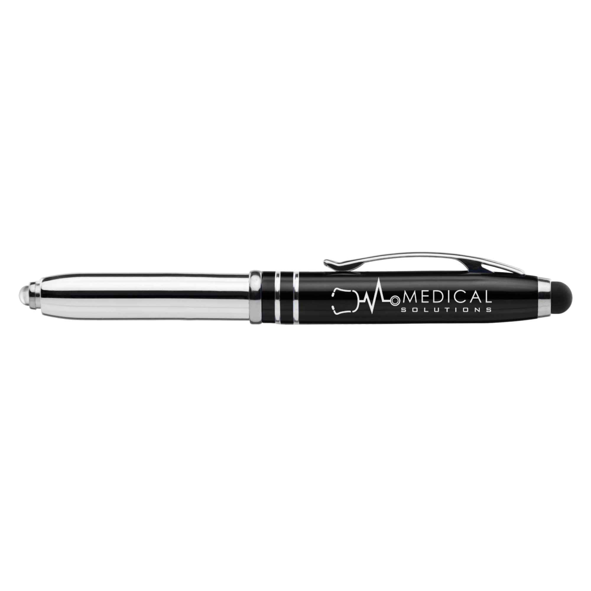Engage with clients using the Vivano Duo Pen w/ Stylus. This popular pen features a "touch" stylus at the top of the cap. It also has a push activated bright white LED light, and three button cell sleeved batteries are included. Customize it with your company name, logo and marketing message using LaserMax (R), our special laser engraving process that yields the largest standard imprint area in the market. Add this medium ballpoint pen to your advertising campaign to revive it for the next wave of your promotions!
