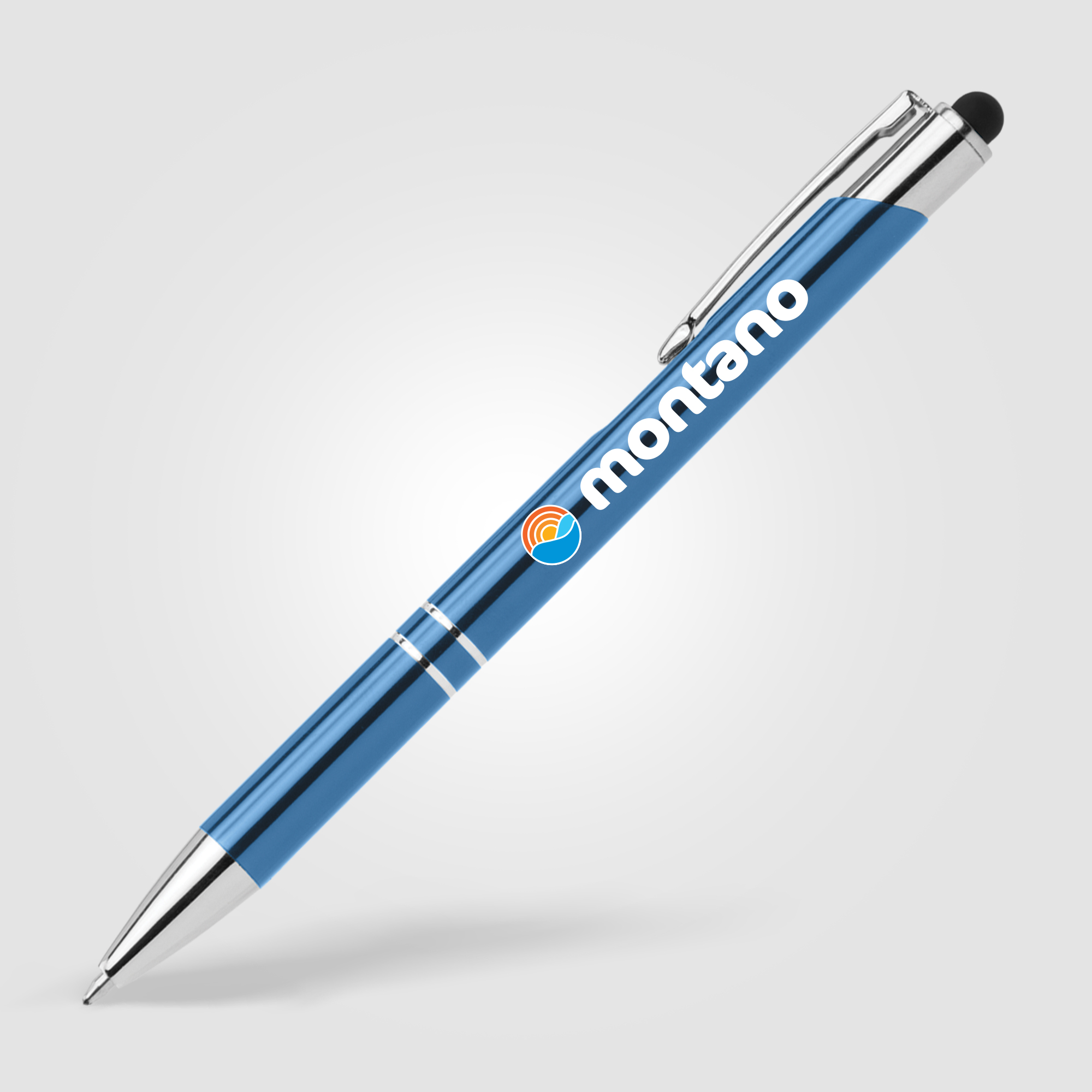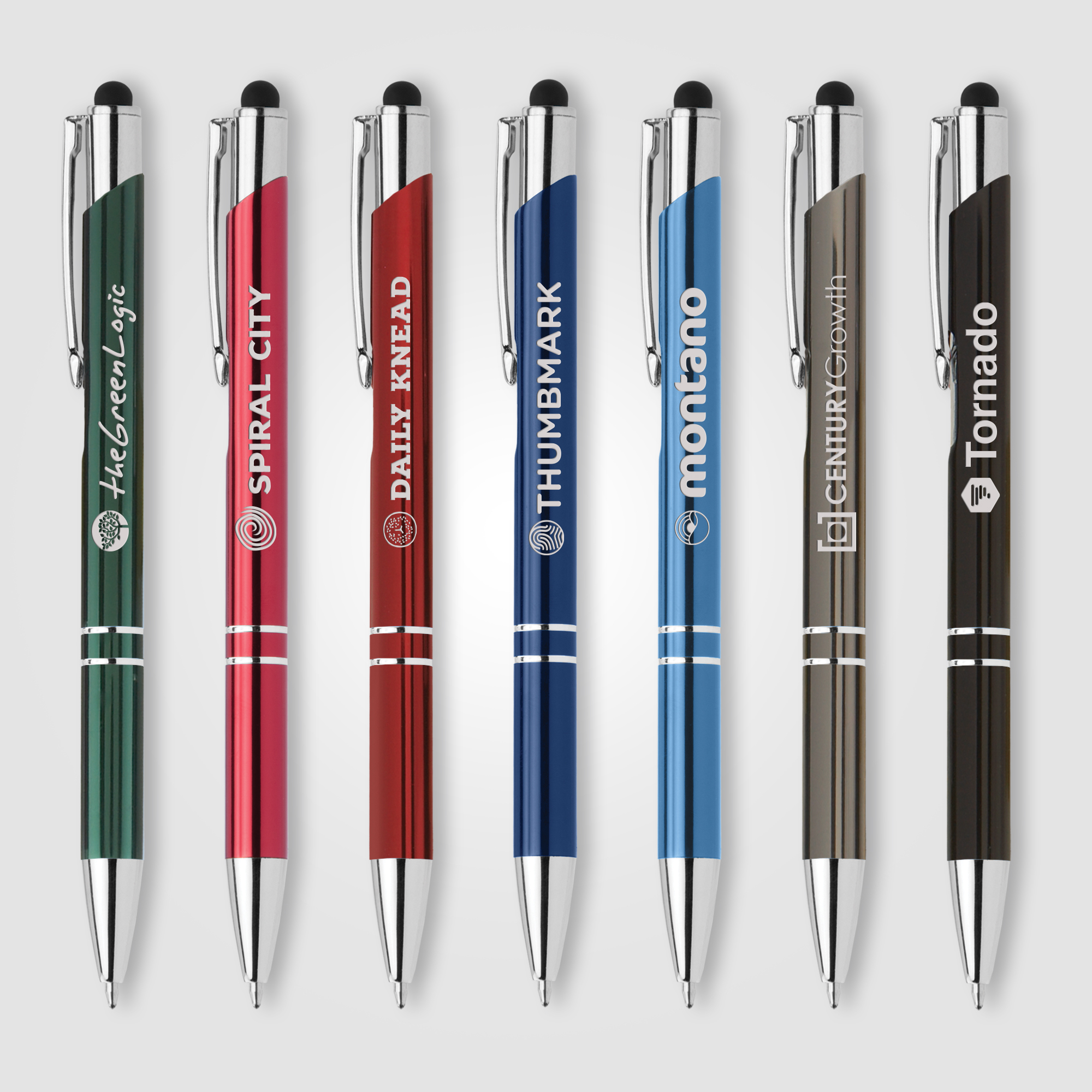 A polished metal pen with a quick-click plunger that doubles as a stylus, the Tres-Chic Stylus pen is ideal for any user with a touchscreen device. Select from a variety of vibrant, gleaming barrel colors. Decorate with a full-color, photo-quality imprint with our innovative ColorJet printing capabilities.