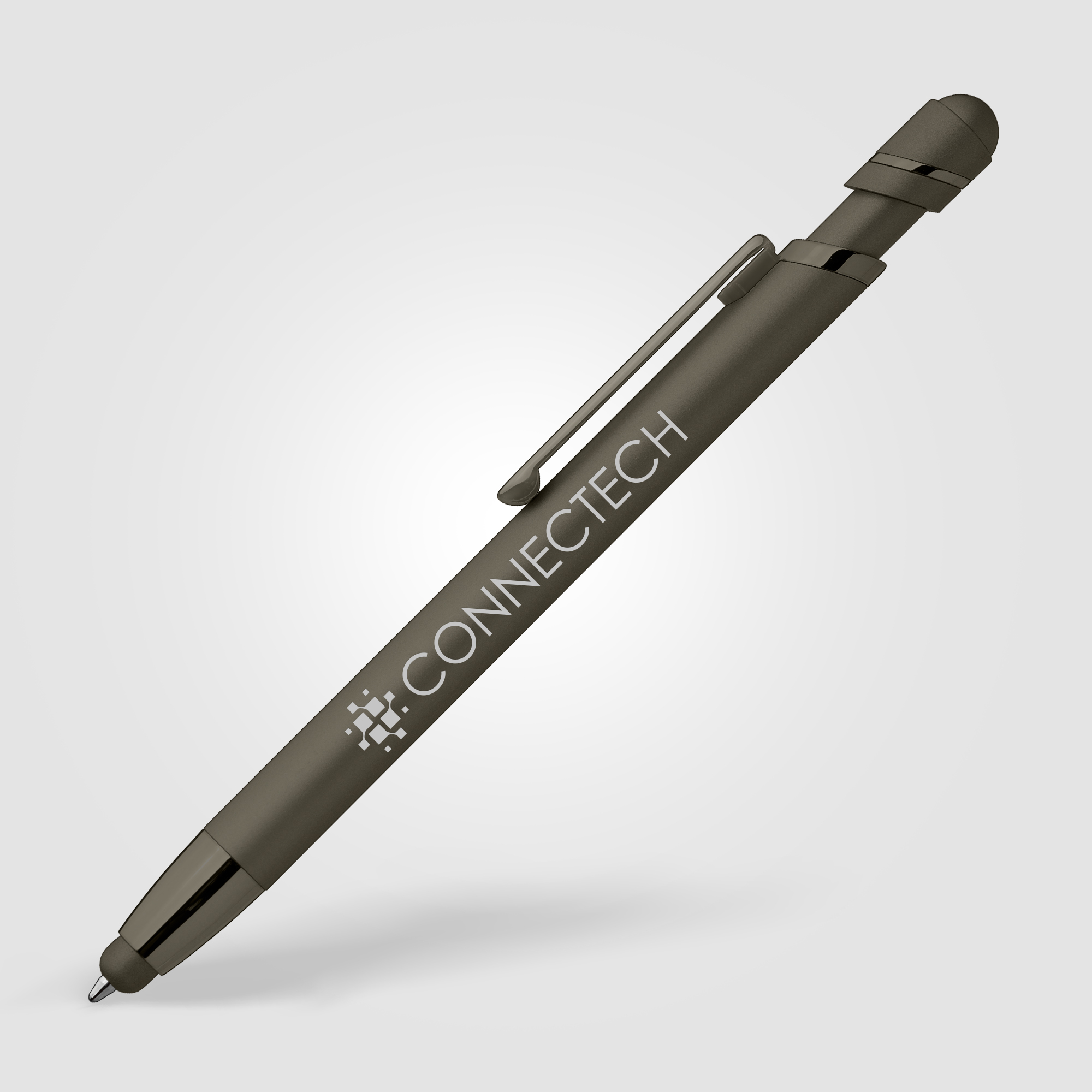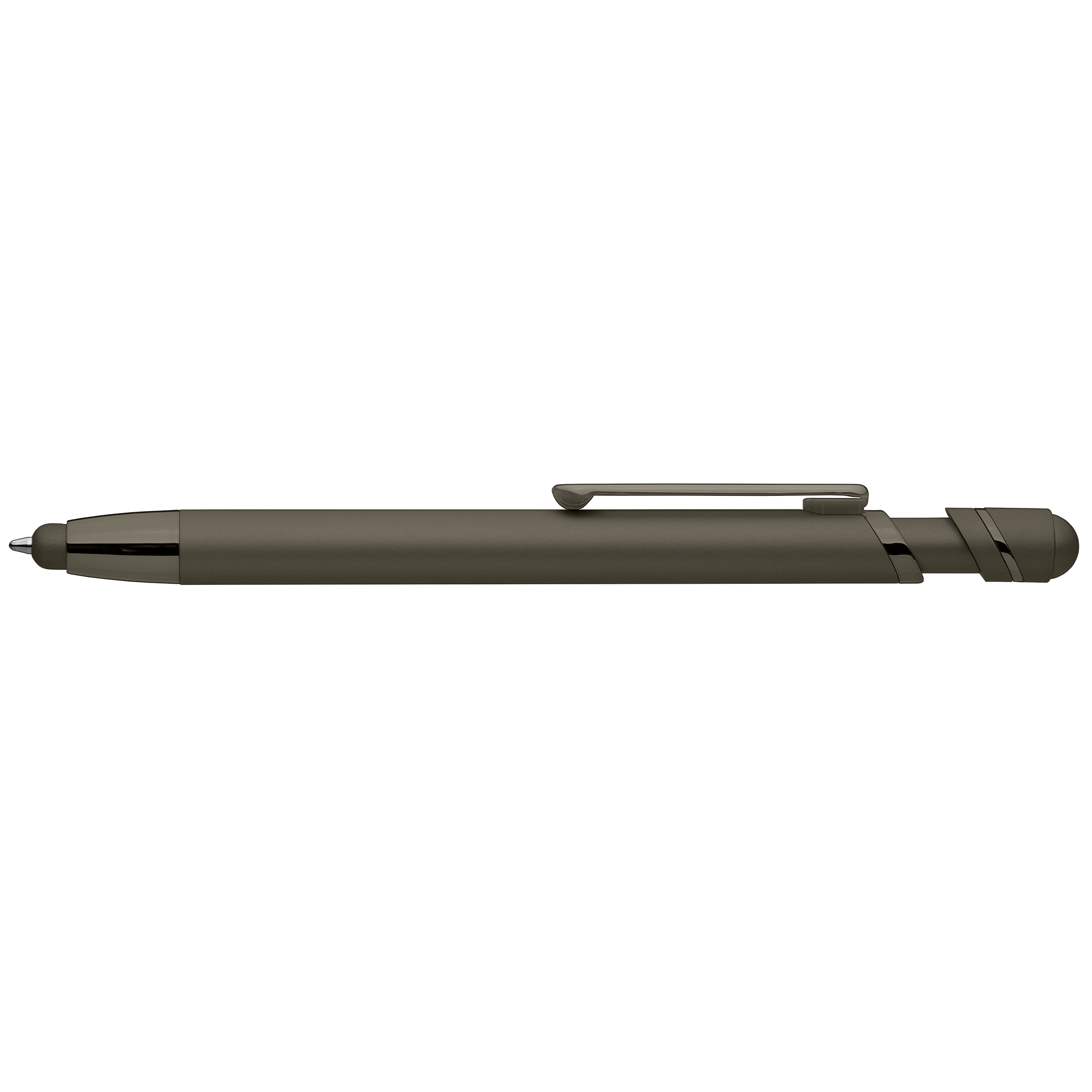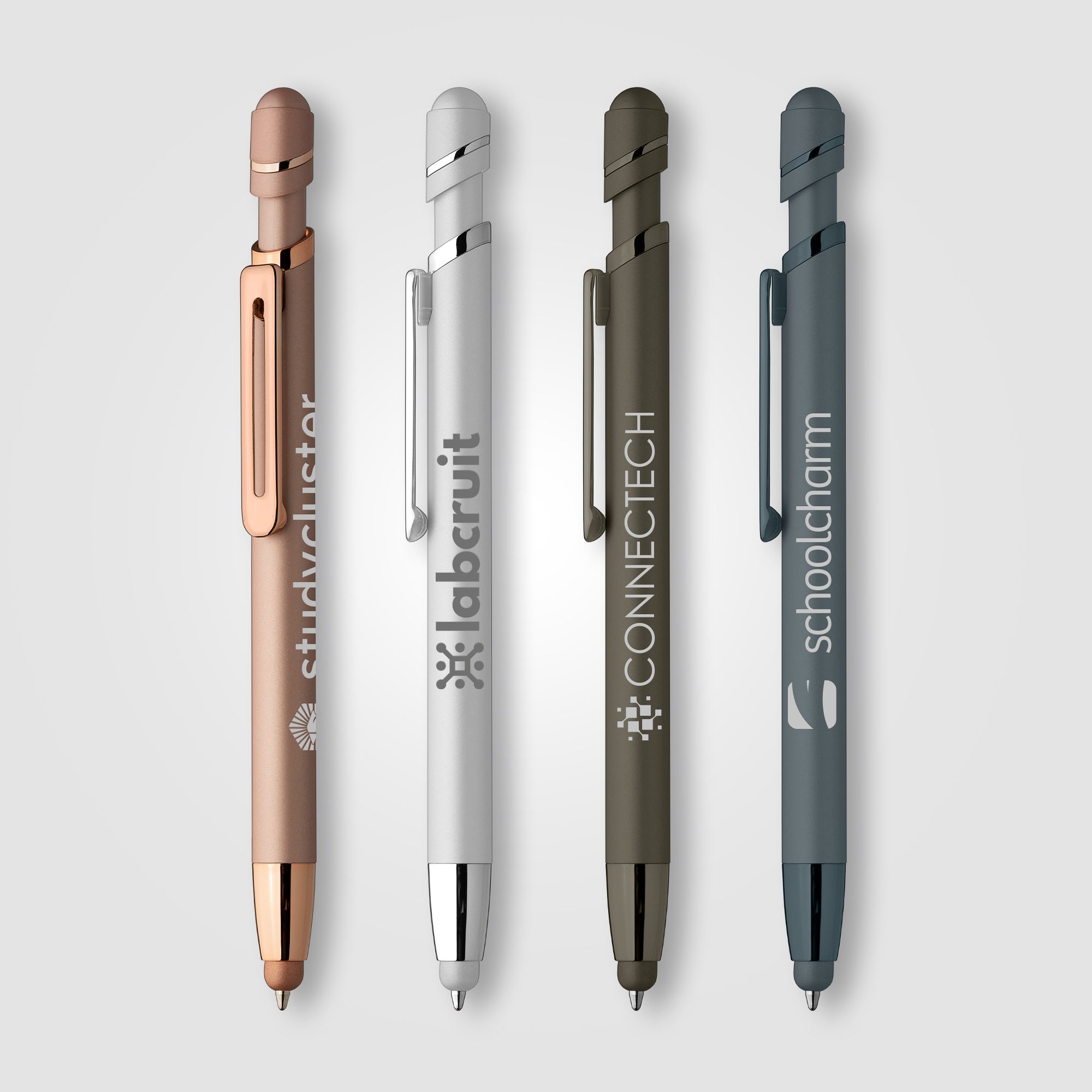 The Atlantic Softy Metallic metal pen features a contemporary monochromatic design, with luxurious soft-touch barrels complementing color-matched metallic trim for a fresh, modern look. The capacitive stylus adds useful touchscreen functionality. .