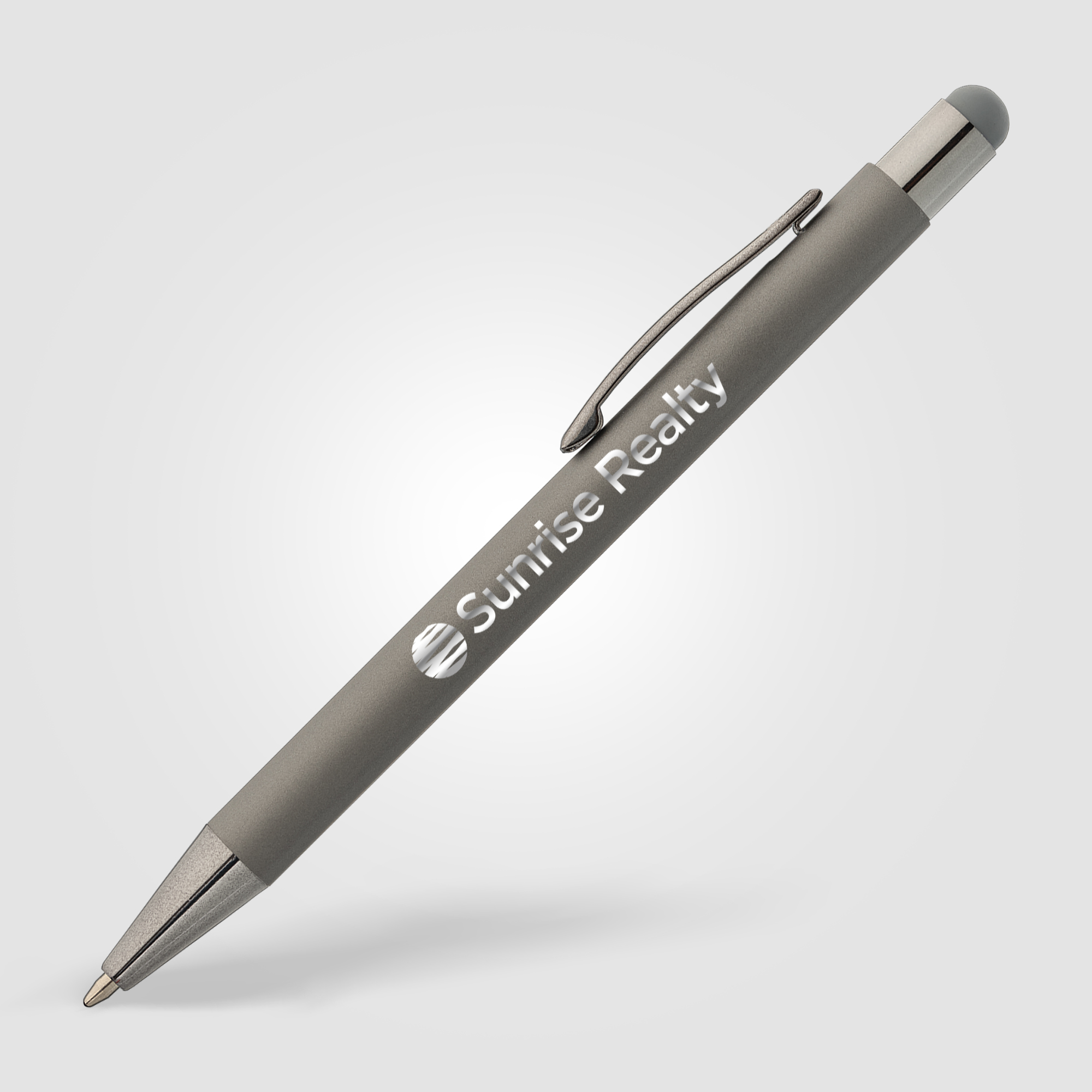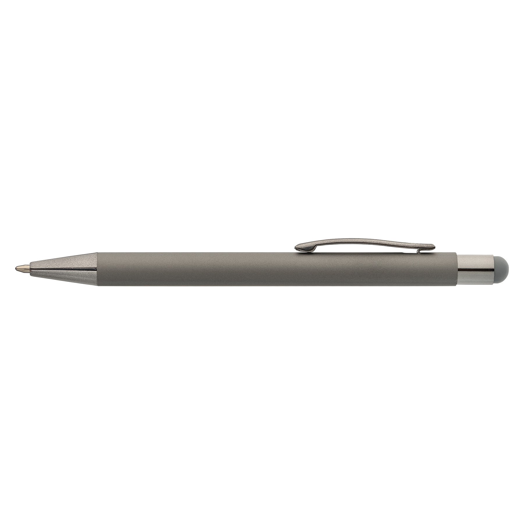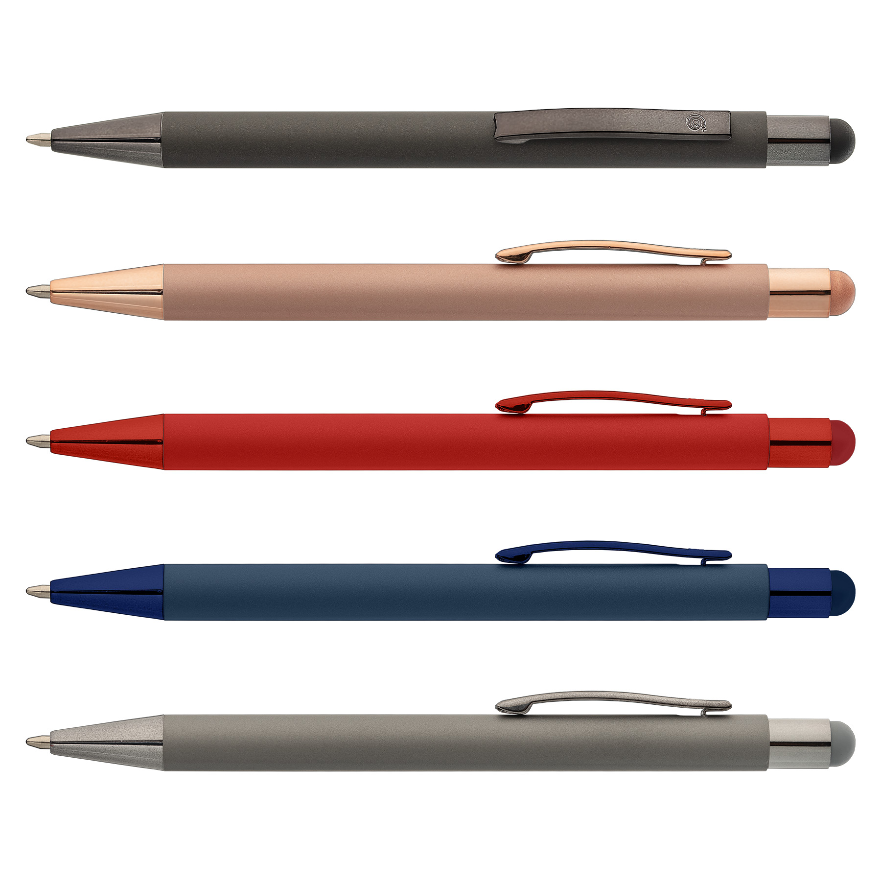 Elevate your brand with the Bowie Softy Monochrome Stylus Pen! This sleek and elegant metal pen features an on-trend soft-touch rubberized finish barrel, and a touchscreen stylus for all your devices. This medium ballpoint aluminum pen comes with a Premium Italian refill with German ink, allowing you to write longer. Show your brand's true colors with ColorJet, our full-color inkjet imprint process.