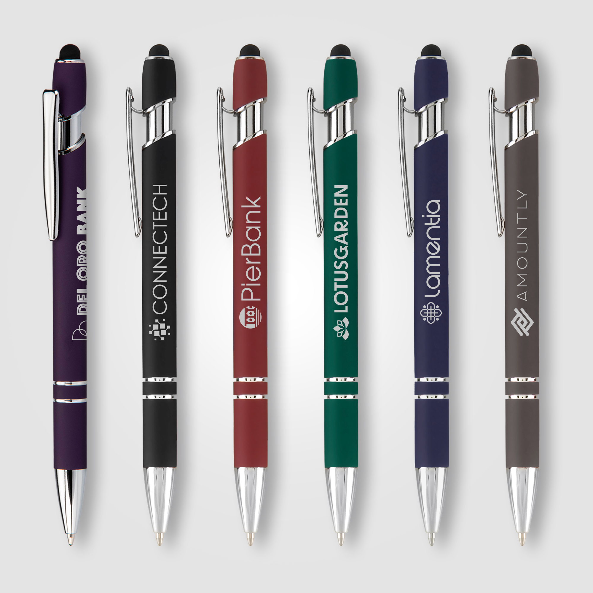 Introducing the Ellipse Softy Gel Pen w/Stylus – a stylish and practical writing tool that effortlessly combines elegance with technology. The pen showcases an Aluminum Rubber Barrel with a Chrome Metal clip, providing a polished appearance. The Chrome-painted plastic Nosecone adds a hint of sophistication, paired with the convenient Black Plunger and Stylus for contemporary functionality. Your logo will be imprinted in Laser Engraving.