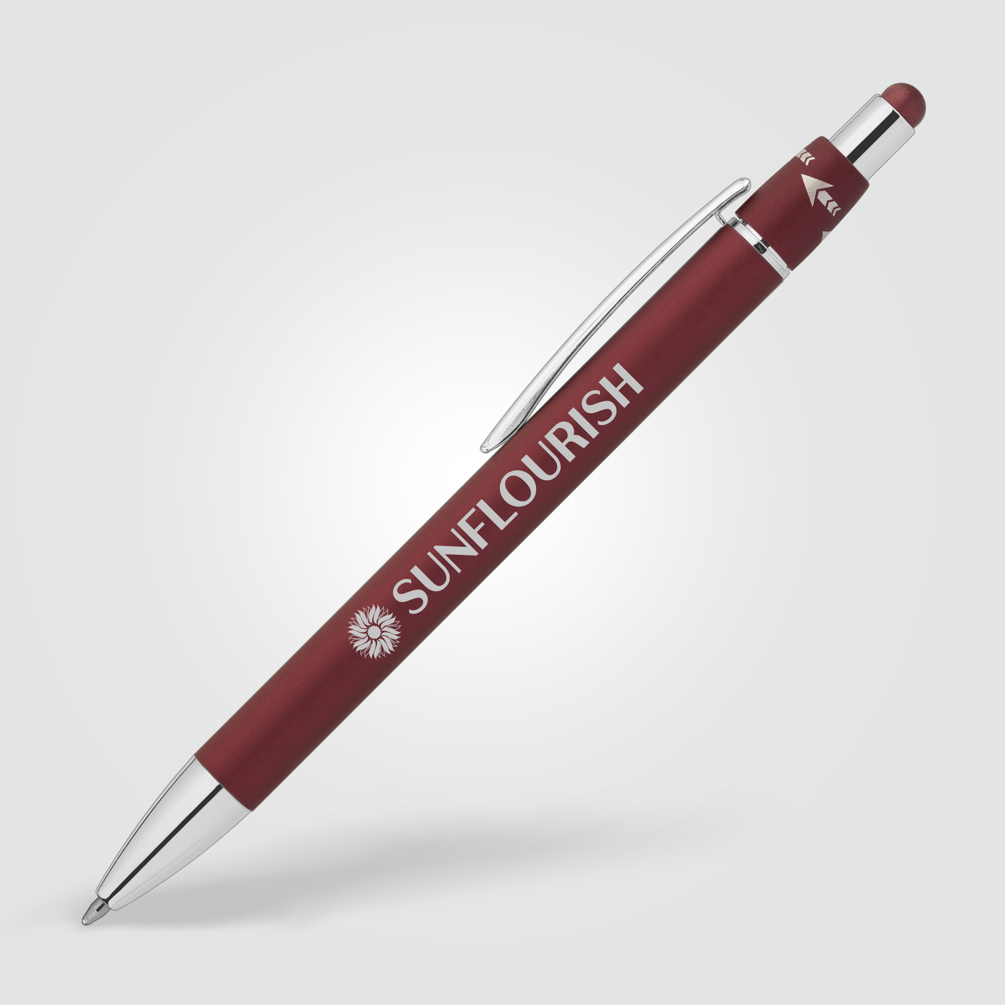 Introducing our new Orbit Spinner Chrome Metal Pen with Stylus—a perfect blend of functionality and style. It features a retractable aluminum barrel with a sleek rubberized finish for a comfortable writing experience, complemented by elegant chrome trim ideal for corporate settings. The top boasts a unique rotating fixture with silver arrows for a satisfying fidgeting experience, while a matching stylus on the plunger allows seamless transitions between paper and digital interfaces. Complete with a slim refill with Dokumental Ink and a 1.0mm tip, this pen ensures smooth, professional writing.