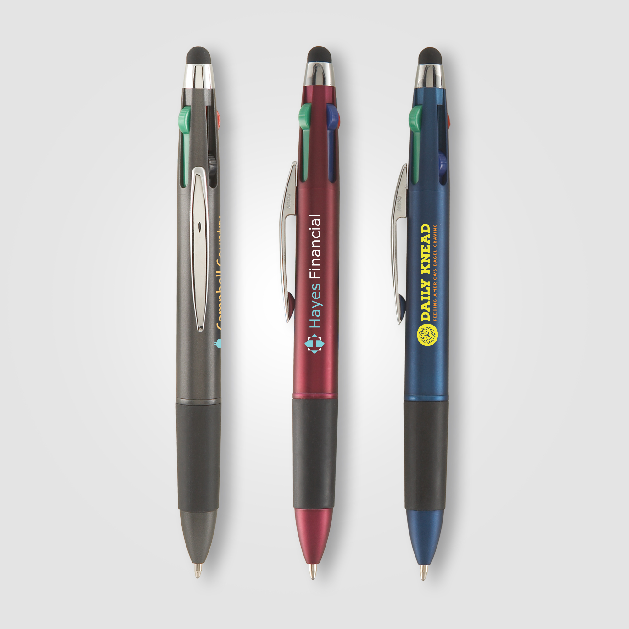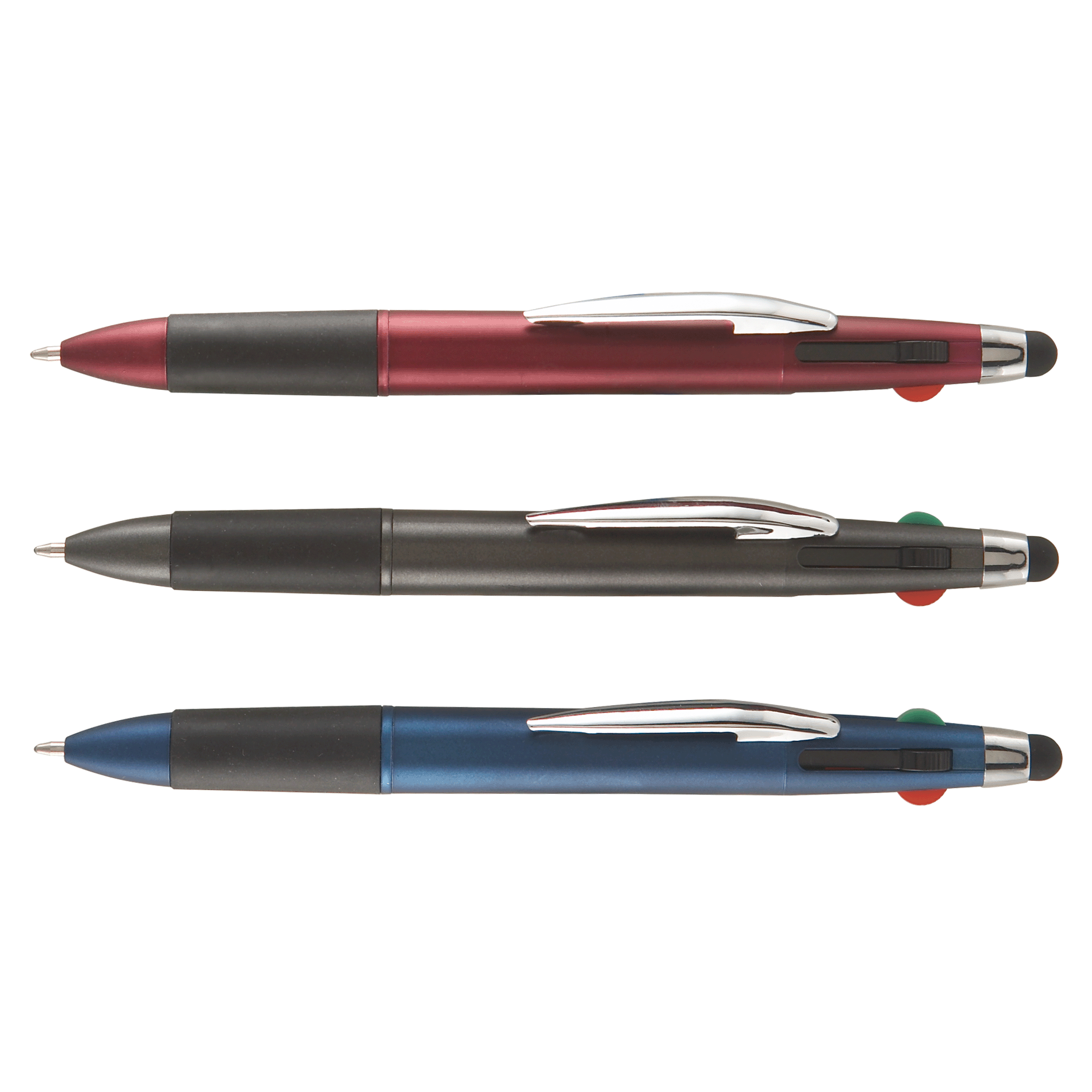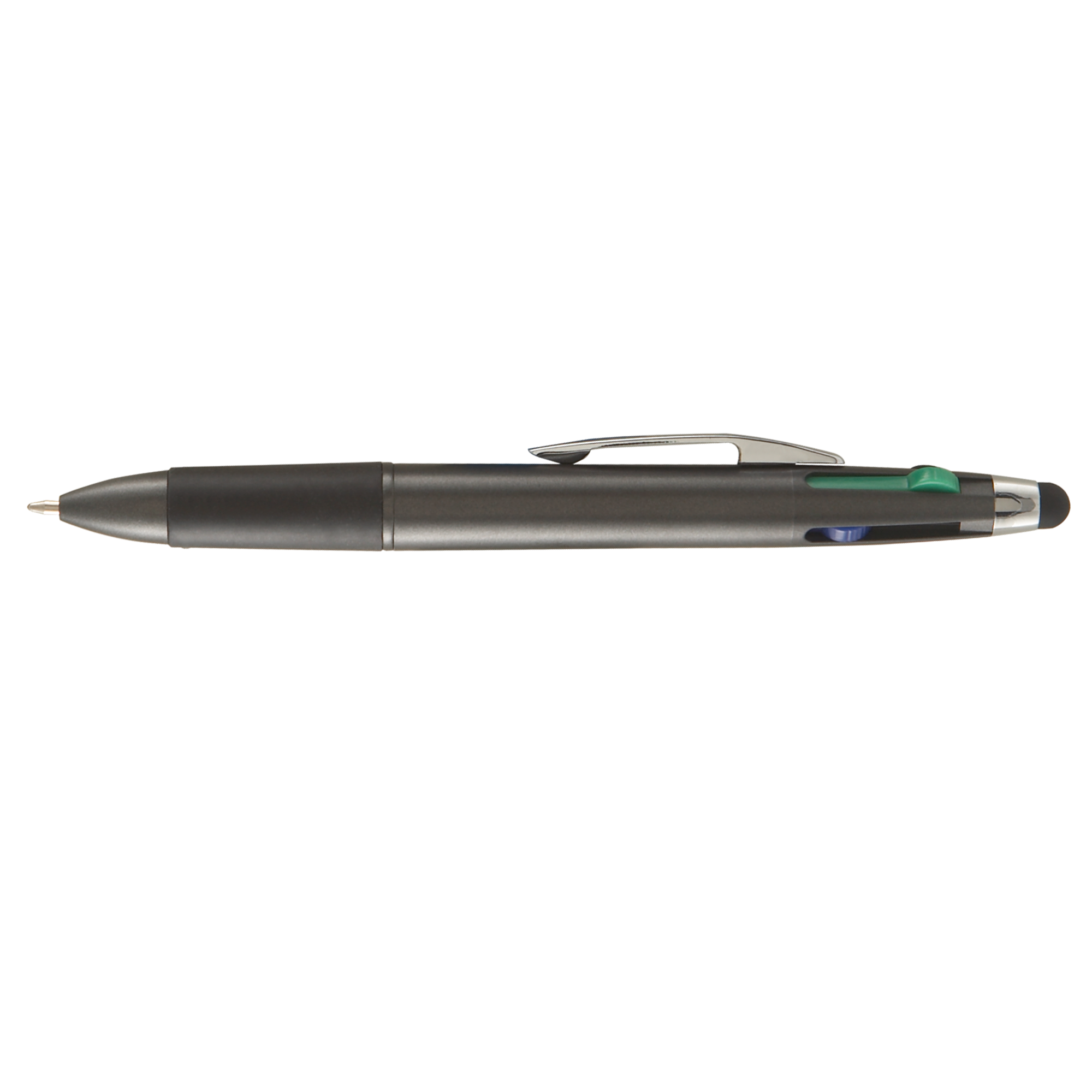 Your clients will love the Quattro Multi-Pen with Stylus! This multi-functional, click action pen features four ink colors: Red, Green, Blue and Black! It also has a soft comfort grip and a capacitive touch stylus to use on smartphones, tablets and any touchscreen devices. Available in classic colors, the Quattro is a very useful and memorable promotional pen.