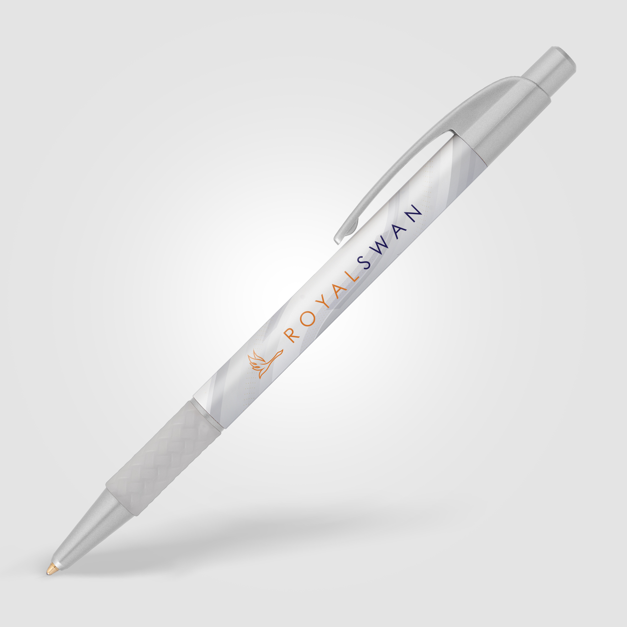 ***Temporarily unavailable.*** The Elite Plastic Matte Metallic Pen combines thoughtful design and sleek aesthetics for a premium writing experience. Crafted with a RABS plastic barrel containing 51% post-consumer plastic, it features a frosted rubber grip with a diamond pattern for added comfort and control. The matte metallic accents on the tip, plunger, and clip complete the modern look. With low-viscosity Dokumental ink in a slim refill.