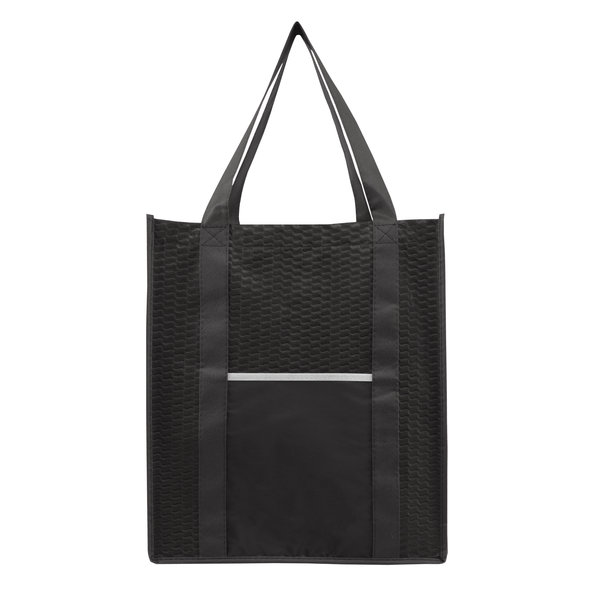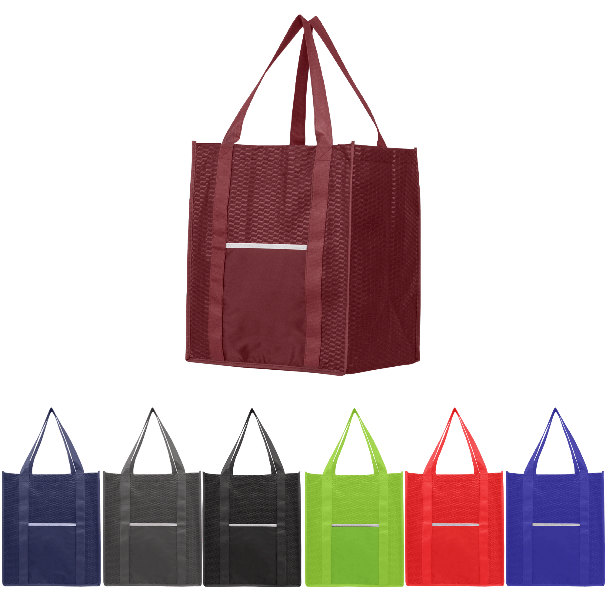 Our North Park Deluxe Shopping Tote is large and versatile, with an added dash of style. It's made of 80 gram non-woven polypropylene with unique wave-texture. Measuring 13" wide x 15" high, with 20" reinforced handles and a 10" wide gusset with matching bottom insert, there is plenty of space for carrying groceries and so much more. This reusable bag is an excellent way to make sure your customers will stay connected with your brand.
