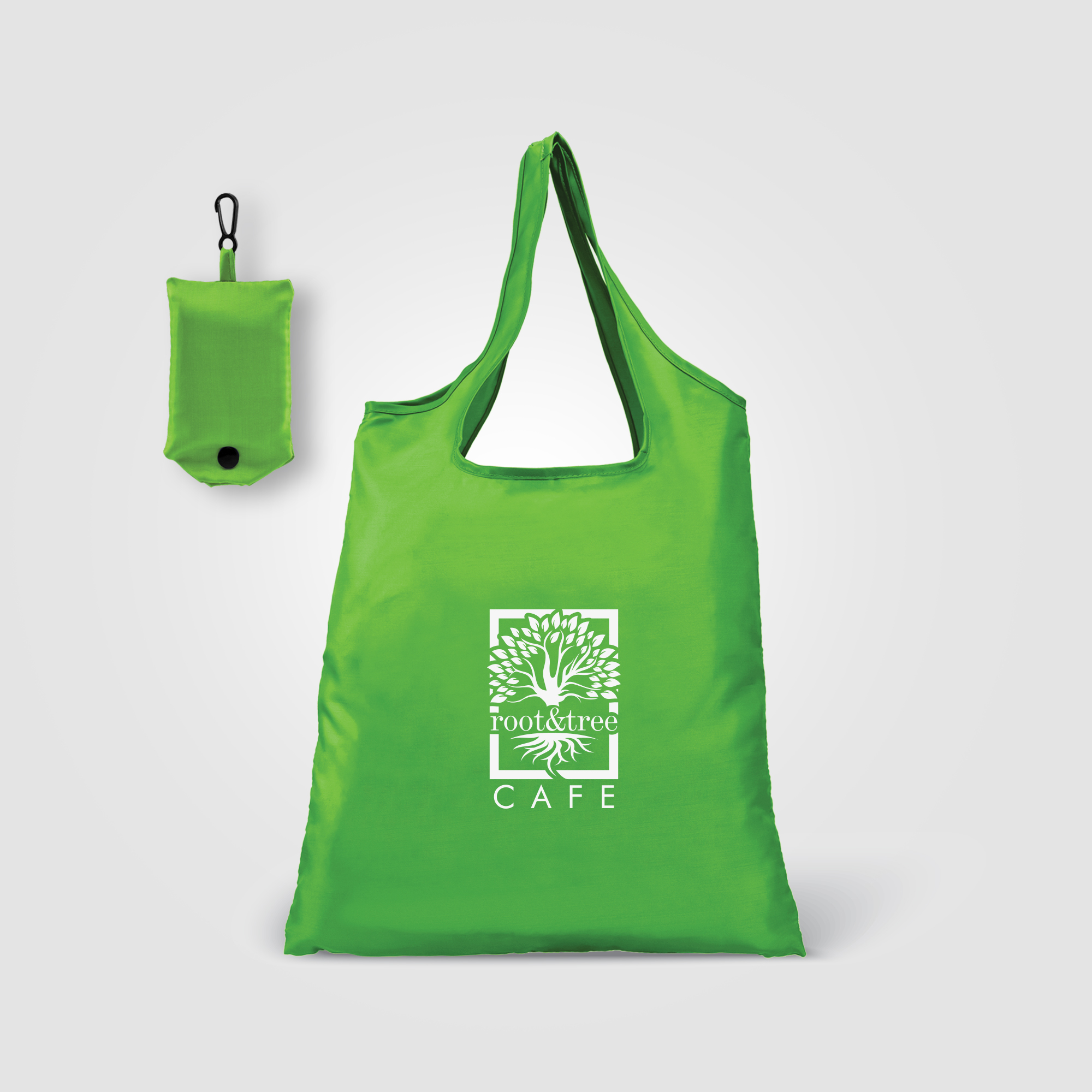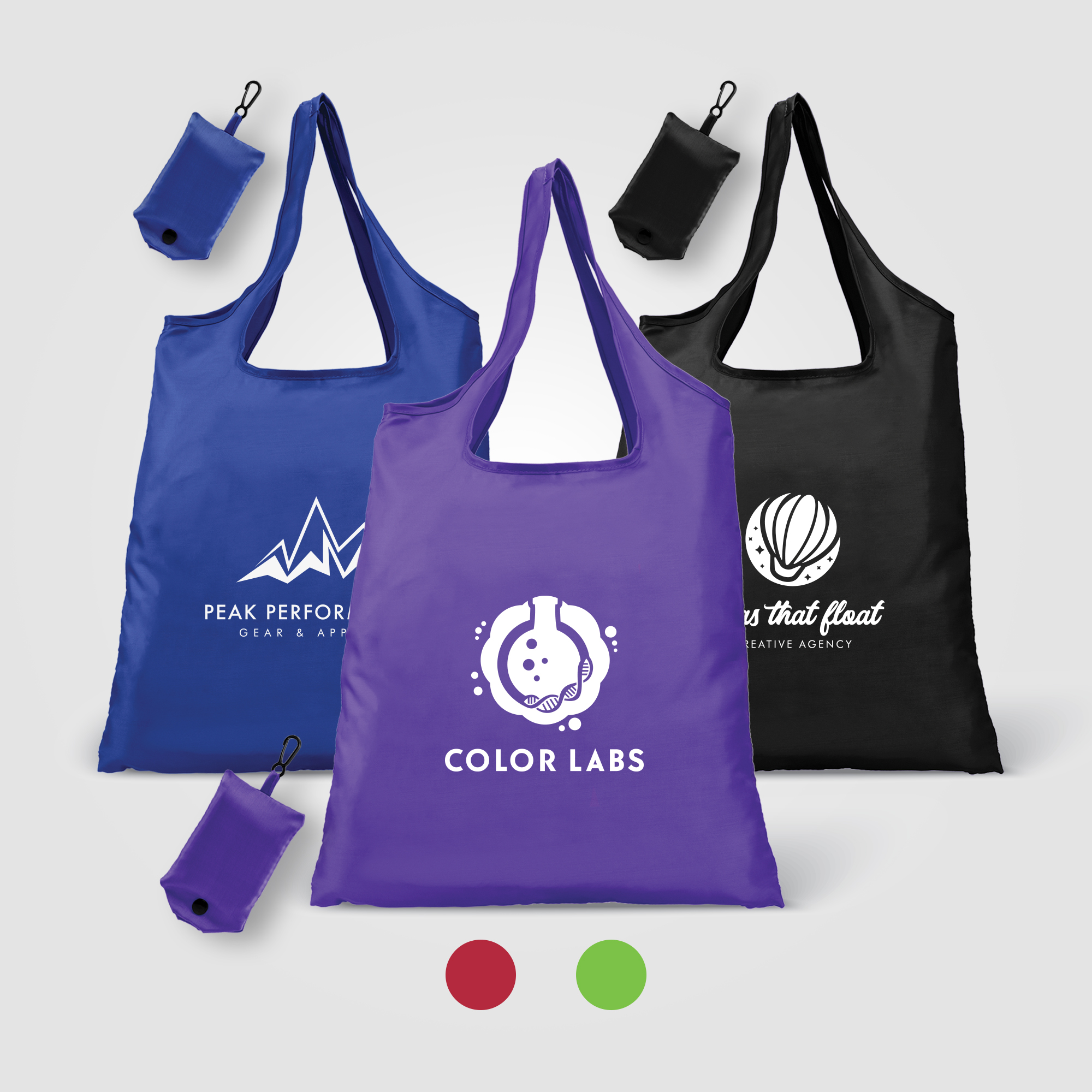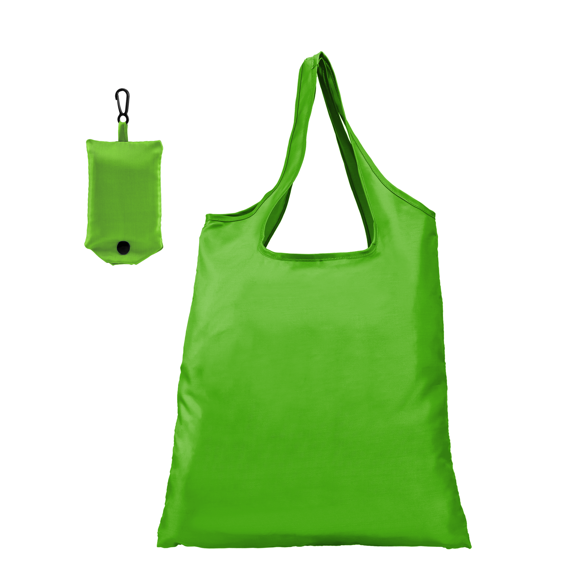 This reusable tote bag easily folds up into and stores inside a self-containing pouch! A small carrying clasp makes this shopping tote easy to secure, store and find within a larger handbag, backpack, or even a keyring! Made of 210D polyester, the Santorini features integrated double handles, and it can carry up to 15 lbs. The handle is made from material that is continuous with the main bag, with an approximate span of 21 inches from left to right.