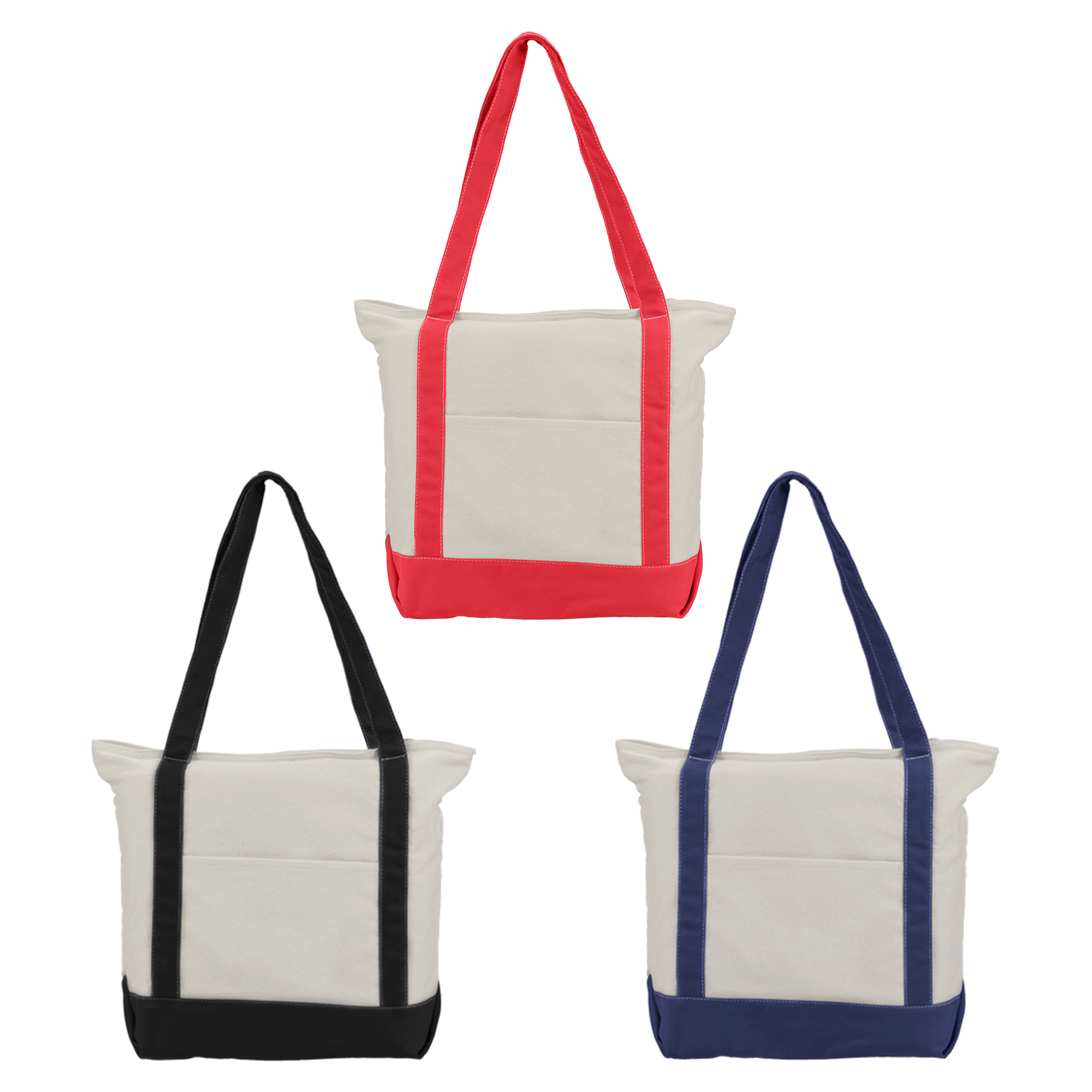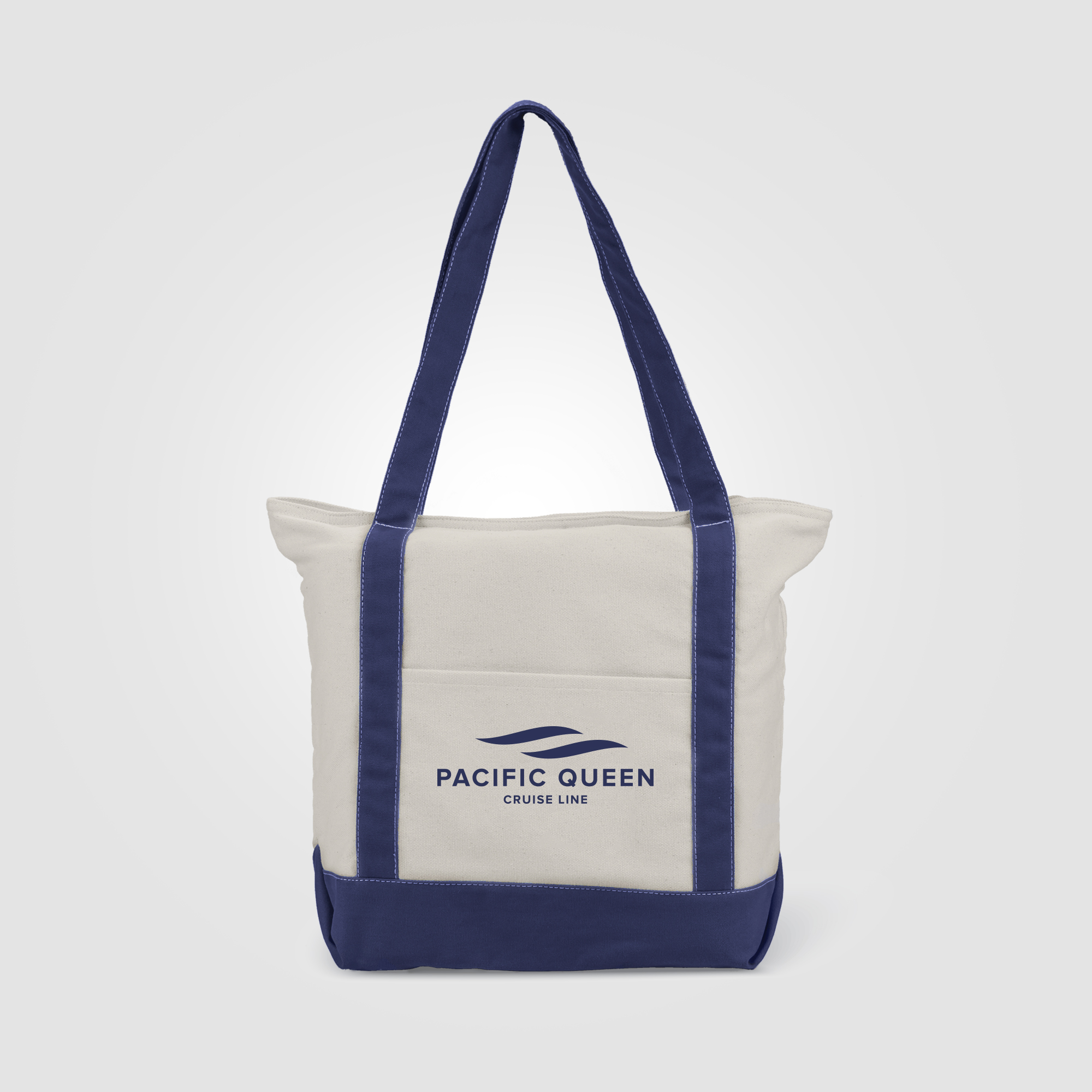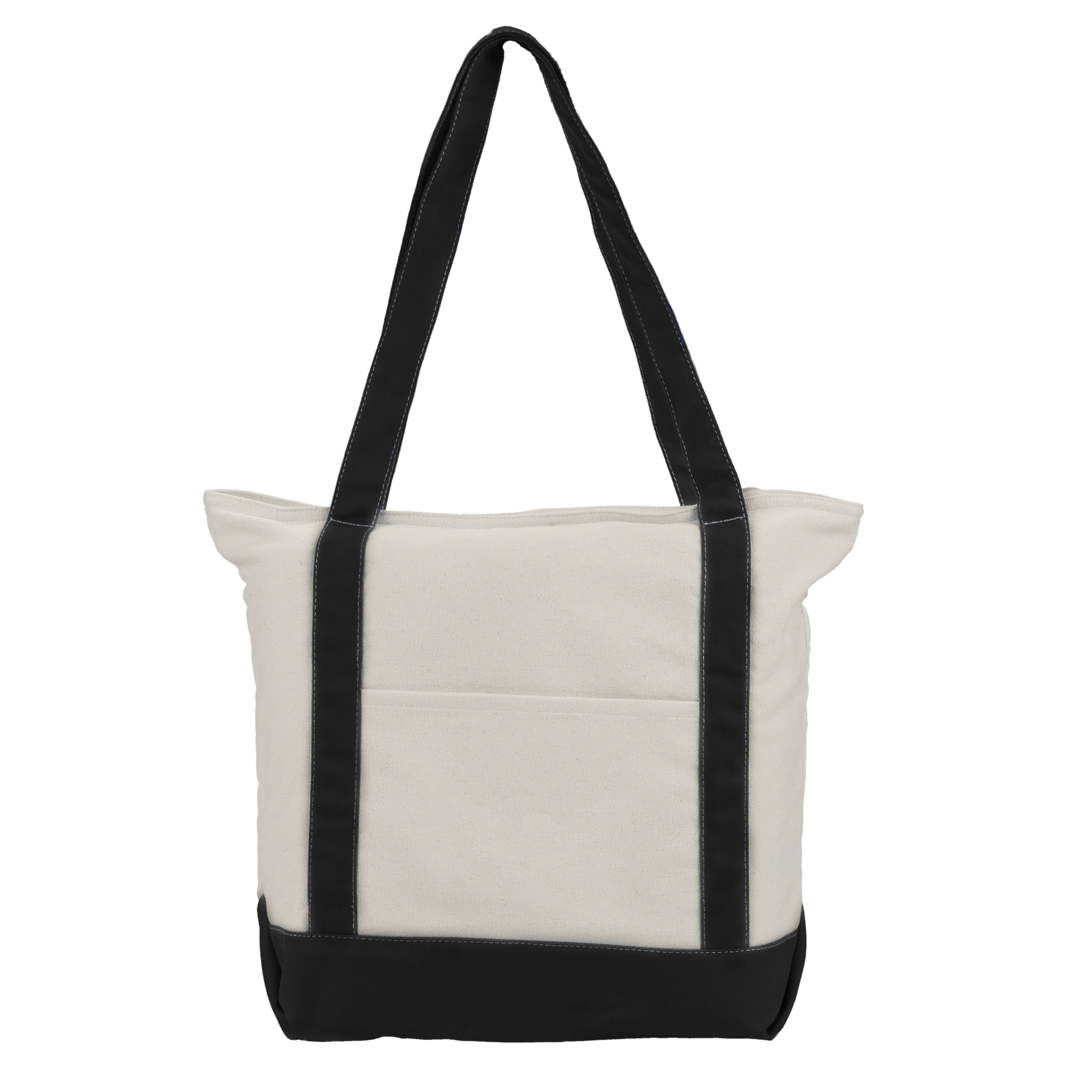 The Zephyr is a reusable canvas tote bag made from 12 oz. cotton canvas and features a strong base, durable carrying straps, front pocket, and a zipper closure. This canvas tote bag is a great size for daily errands, and its sturdy construction will certainly be appreciated by customers. Select a trim and .