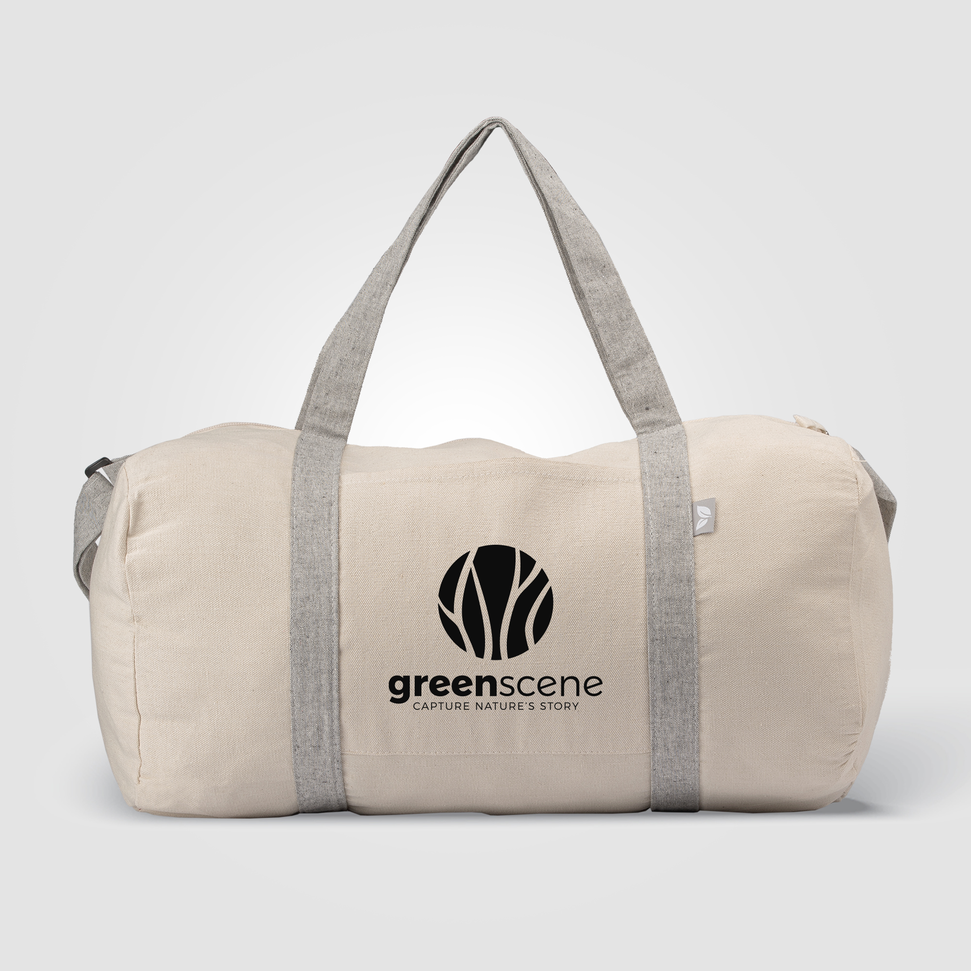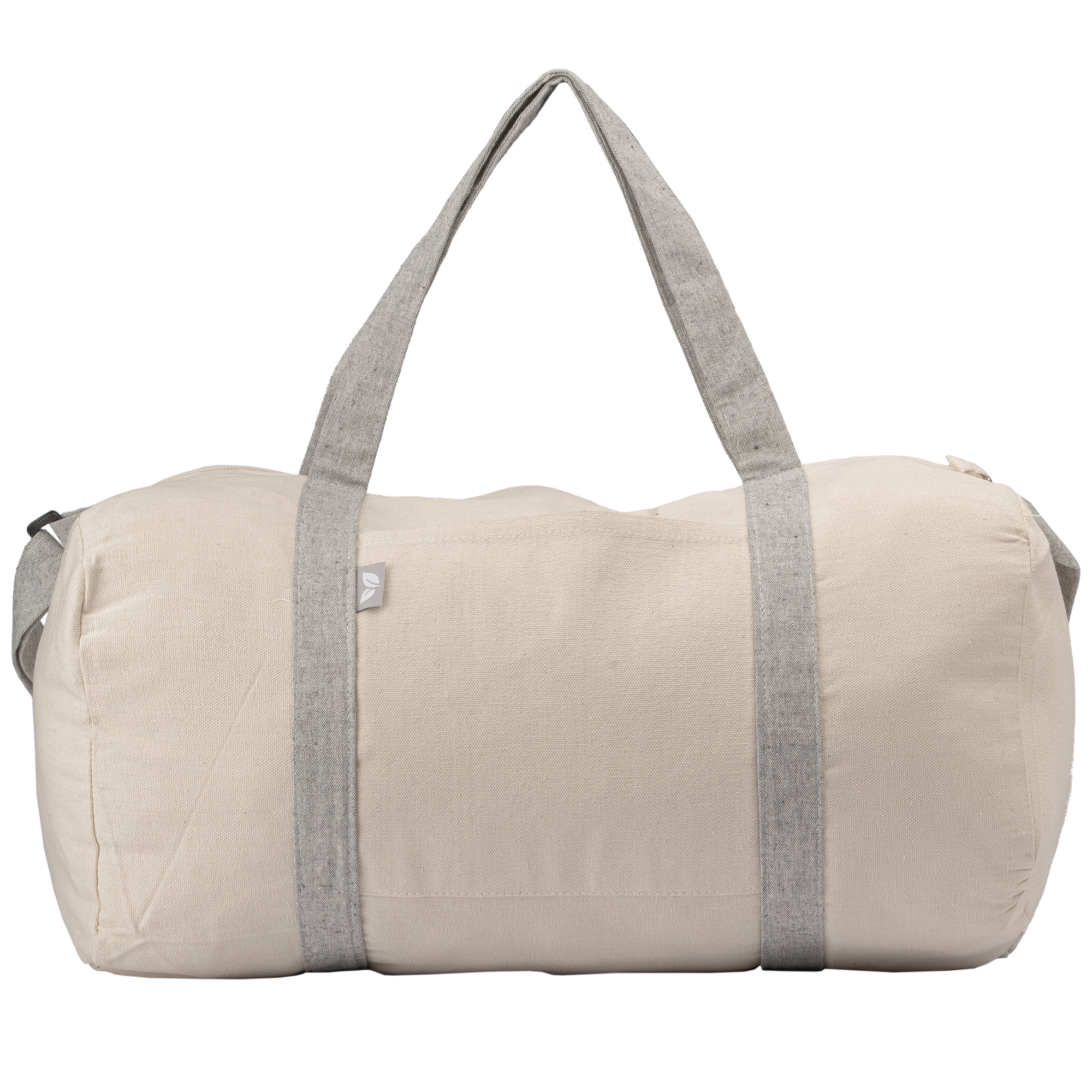 Introducing our Loom - Recycled Cotton Blend Duffel Bag – a travel essential designed for convenience and style. With double handles, an adjustable shoulder strap, a front slash pocket, and a zippered main compartment, this duffle bag is crafted from recycled cotton (55% cotton + 45% polyester), seamlessly blending functionality with environmental responsibility. Boasting a 22.5 L capacity with a max weight of 22 lbs. it's perfect for your travels. The Jacquard material eco tag, featuring a leaf design and "recycled cotton," is sewn on the outside down the right side of the front pocket, making it a chic and sustainable choice. Your logo will be imprinted in Silkscreen.