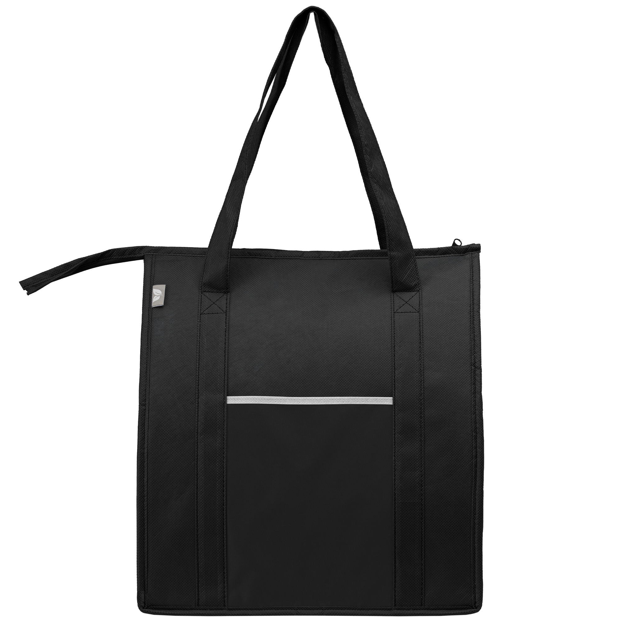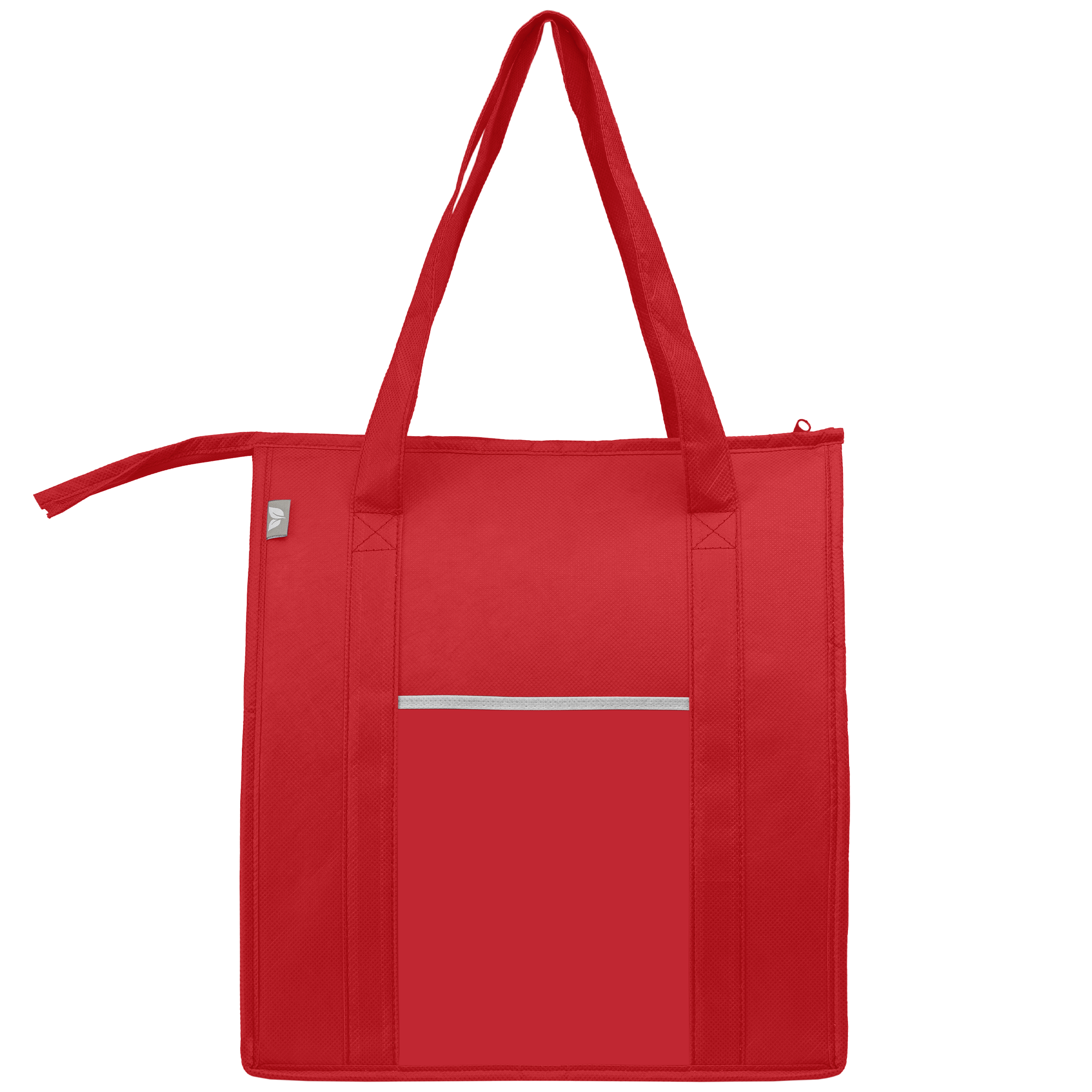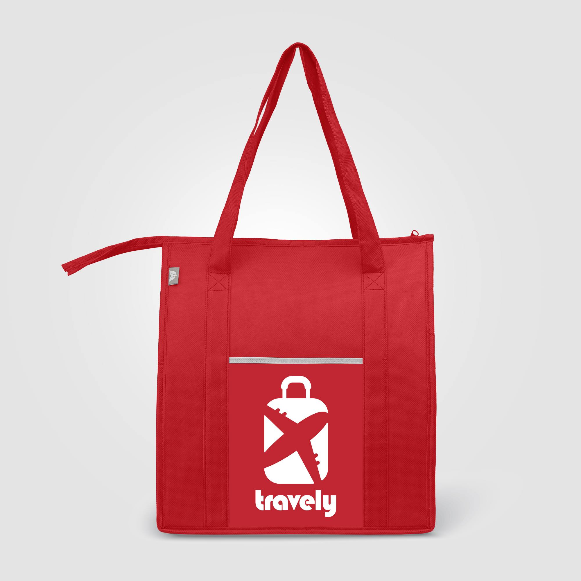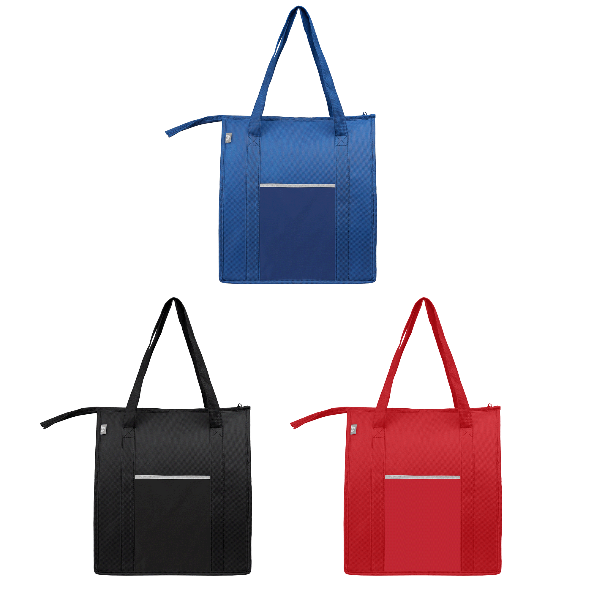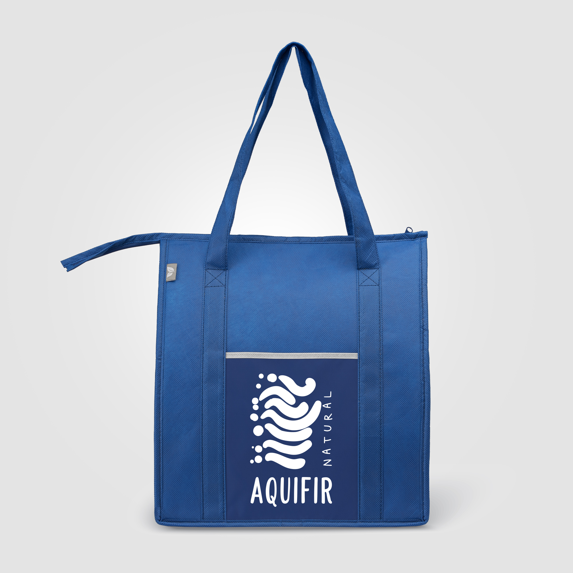 Introducing our North Park RPET Cooler Bag – a functional choice for keeping things cool on the go. The exterior is made from 100% RPET 2oz. Non-Woven material, while the interior features EPE Foam Aluminum foil for effective insulation. The cooler has one main compartment with a zipper closure, and a front pocket for added convenience. Measuring 12.99" × 14.96" × 10.04", with handles sized 1.18" × 4.72", it has a generous 25 L capacity, and supports a maximum weight of 22 lbs. Additionally, the eco tag, made of Jacquard material, is sewn on the outside down the right side of the bag, featuring a leaf design on one side and proudly stating "recycled PET" on the other. Your logo will be imprinted in Silkscreen.