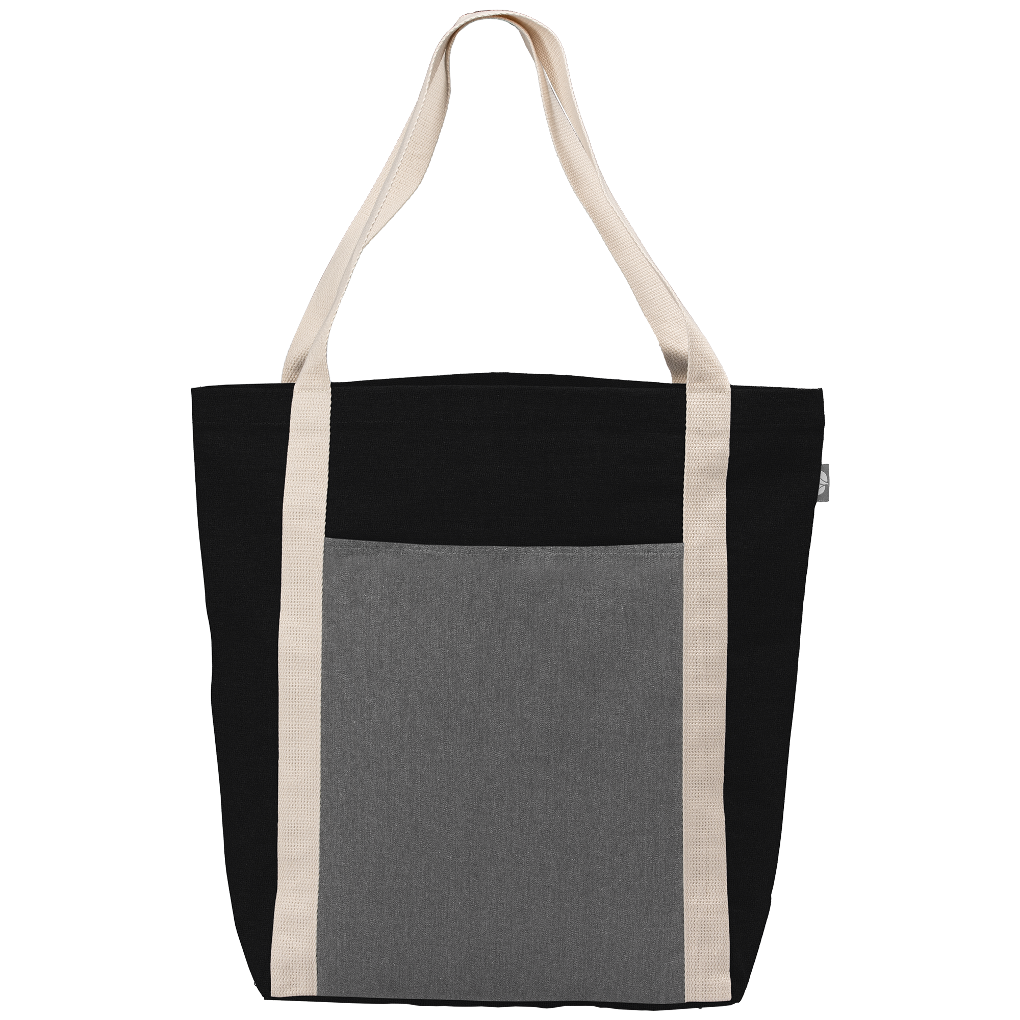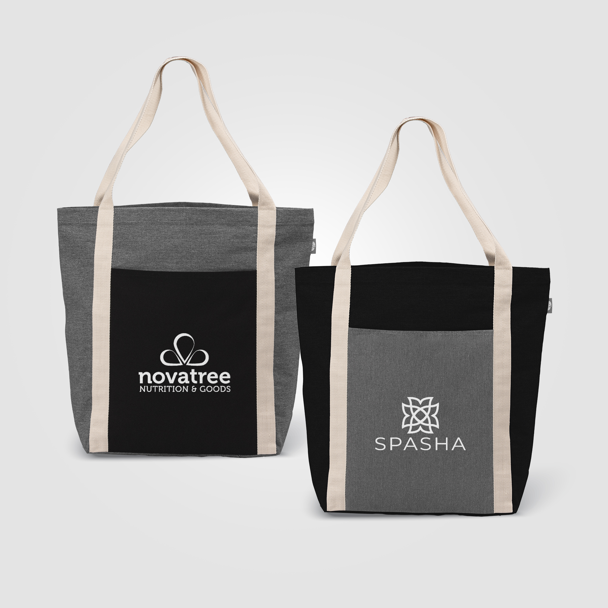 Discover our Spun Recycled Cotton Blend Tote Bag, your versatile and stylish everyday companion, crafted from durable 7 oz. recycled cotton (55% cotton + 45% polyester), this bag blends two different colors with long, solid and natural handles for sophistication, it features a spacious main compartment, along with a 8.8" x 11.8" front pocket, offering practicality and style. With a 15L capacity and a maximum weight of 11 lbs, it's both lightweight and sturdy. Your logo will be imprinted in Silkscreen.