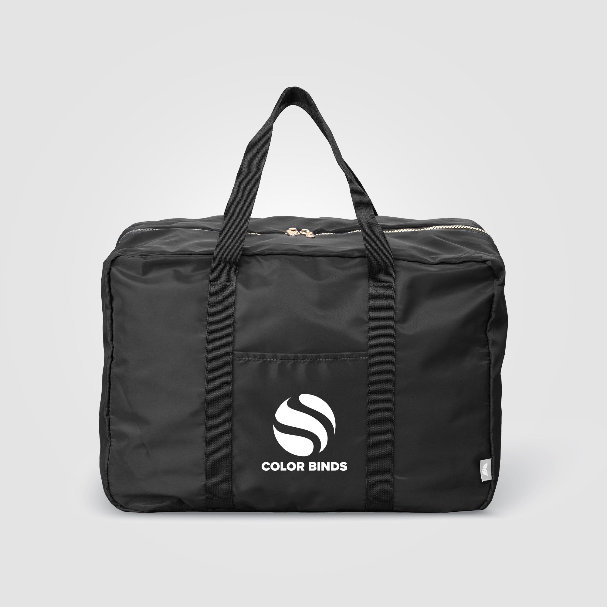 Our premium Aurelia Duffel is a light, soft, and highly organized bag that sets a new standard for travel. Part of the gold accented collection, this 33-liter duffel's panels and lining are crafted from lightweight 100% post-consumer recycled 75D polyester (rPET) and feature striking gold zippers for a refined look. The bag is engineered for travelers, featuring a main compartment that opens 180 degrees for full visibility and easy access to its two well-divided compartments (one with a zippered mesh divider, the other with a solid fabric divider). For effortless airport navigation, it includes a convenient trolley strap on the backside to secure it to luggage. Complete with two carry handles and a front open pocket, this duffel combines stylish design with maximum practicality for any trip.