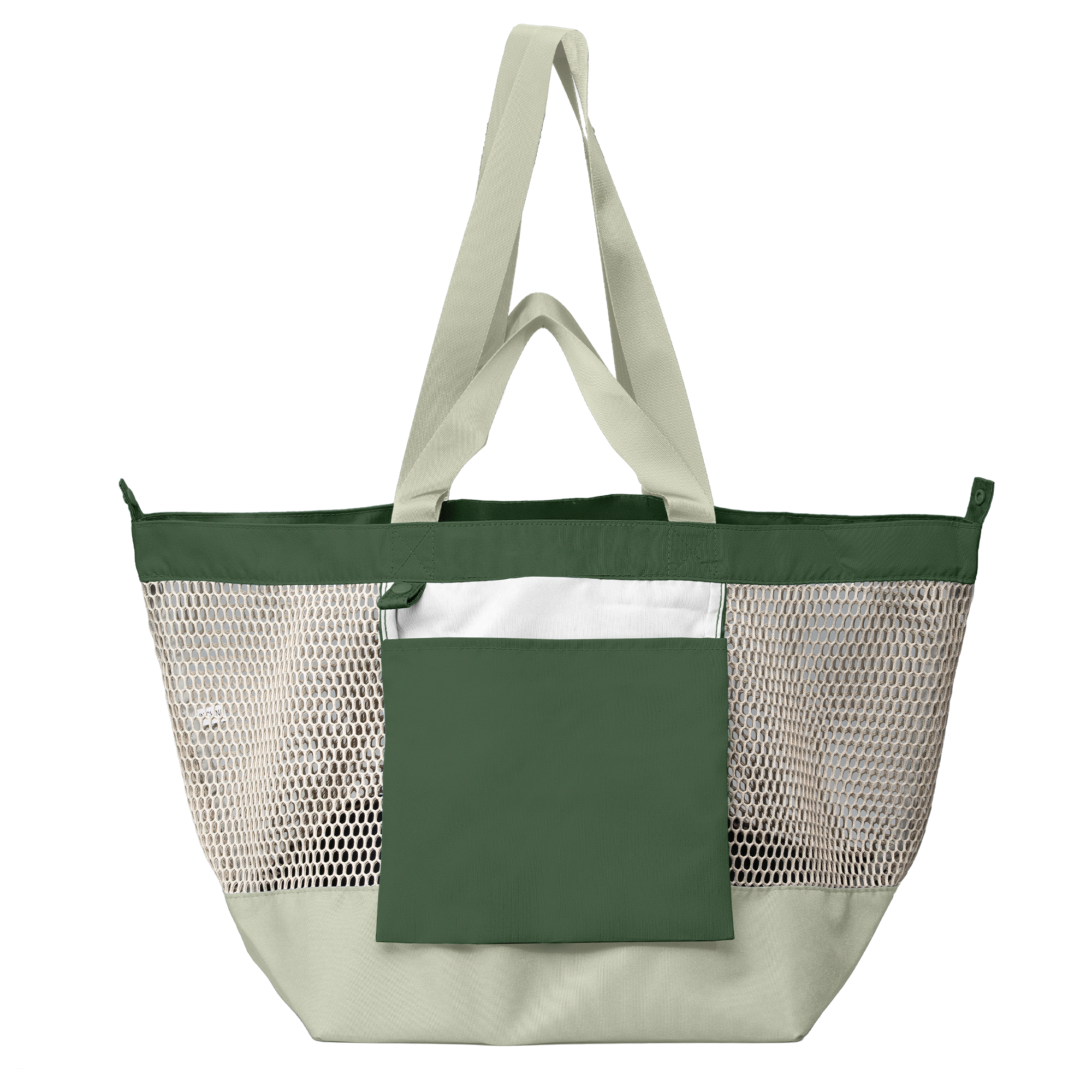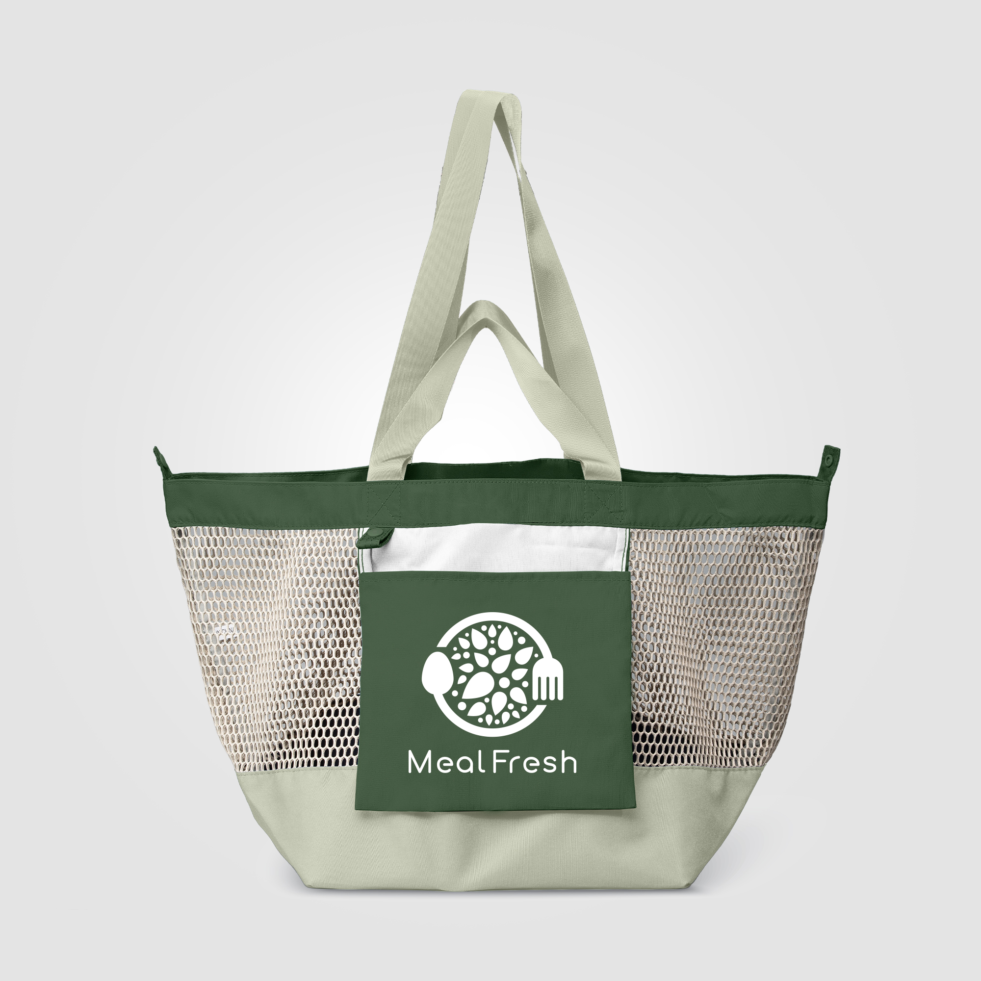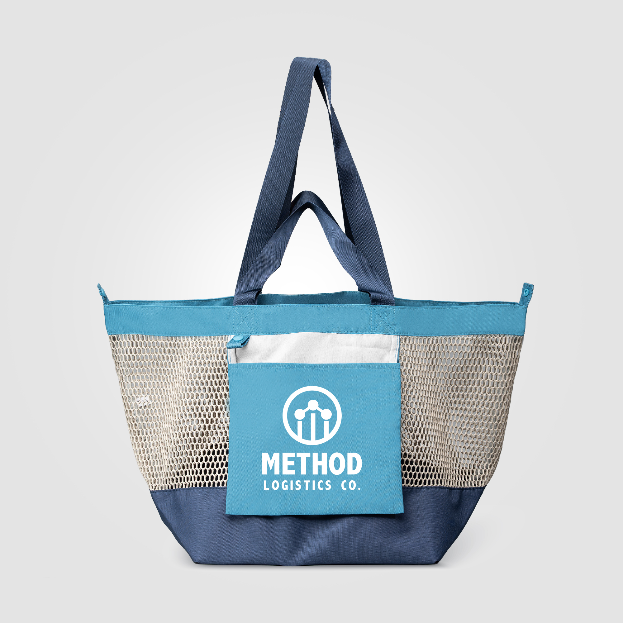 This Neri Tote is an innovative, multi-purpose bag that combines trend-driven design with ultimate practicality. This spacious 45-liter tote is crafted from durable 300D recycled content polyester with a striking mesh main body and solid color block panels. The foldable functionality is a key feature: the bag neatly stores into its own front pocket, keeping your logo visible whether the bag is open or folded. It offers versatile carrying with dual handles (short and long). Perfect for grocery shopping, daily errands, or as a beach bag, the Neri's large-capacity, foldable design makes it an ideal reusable bag for any need.