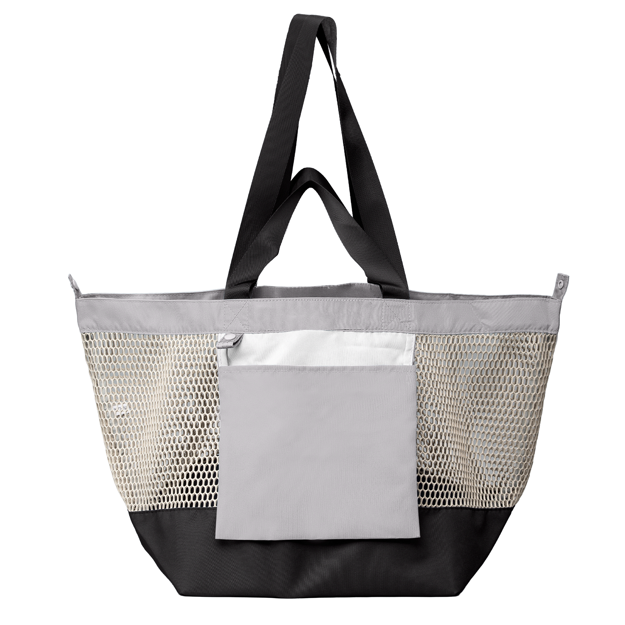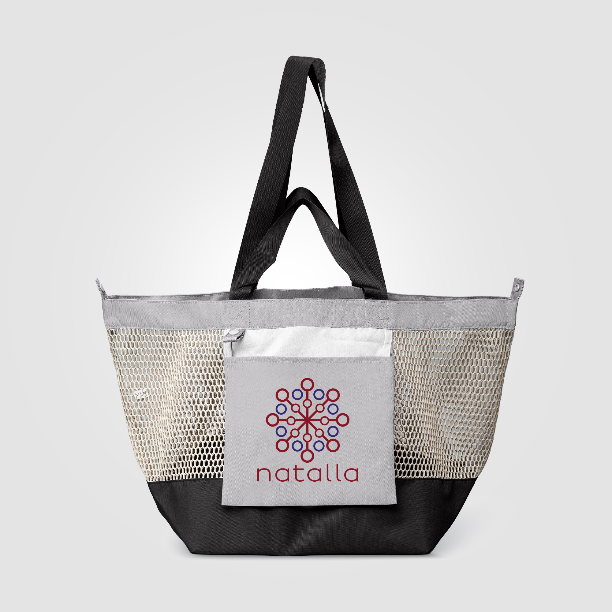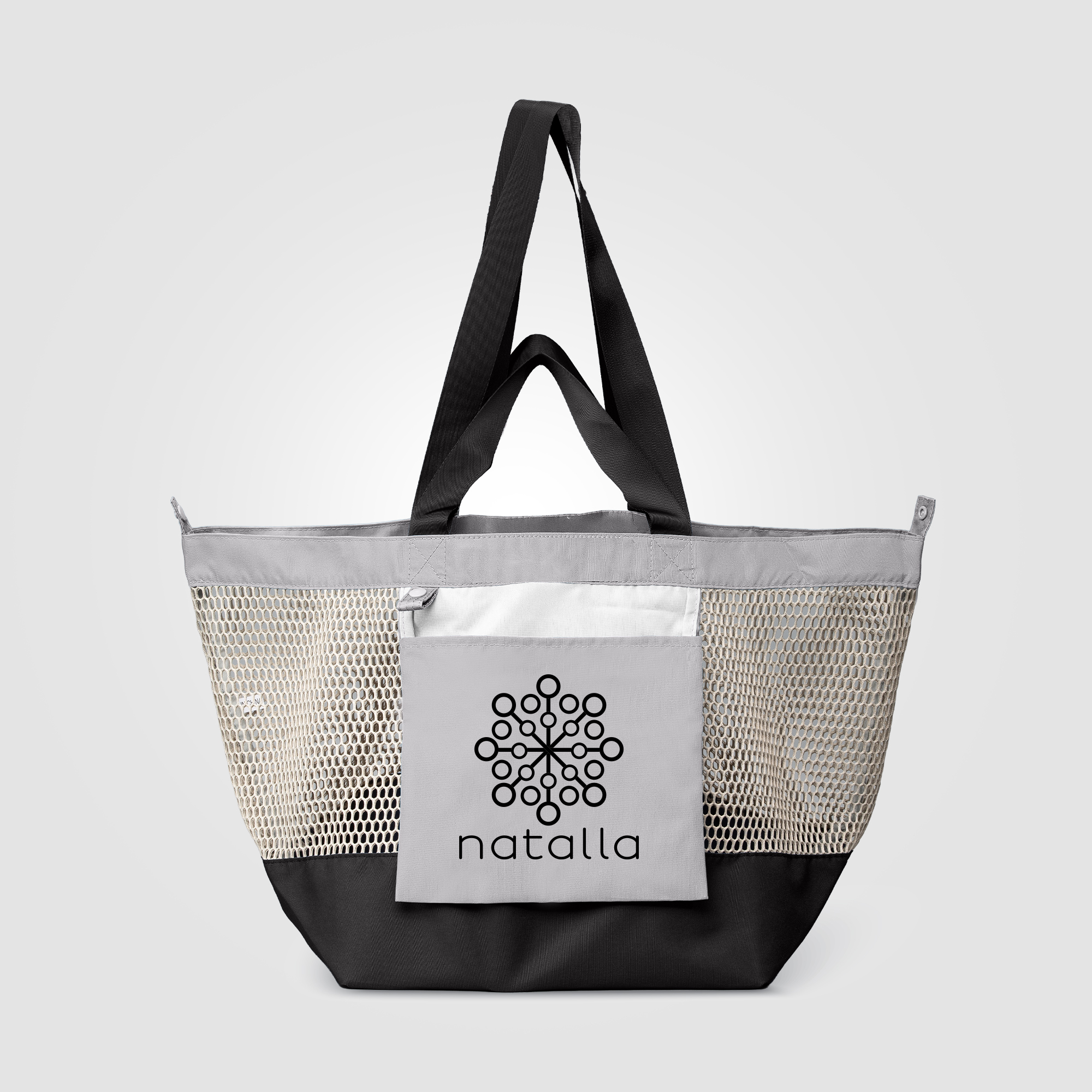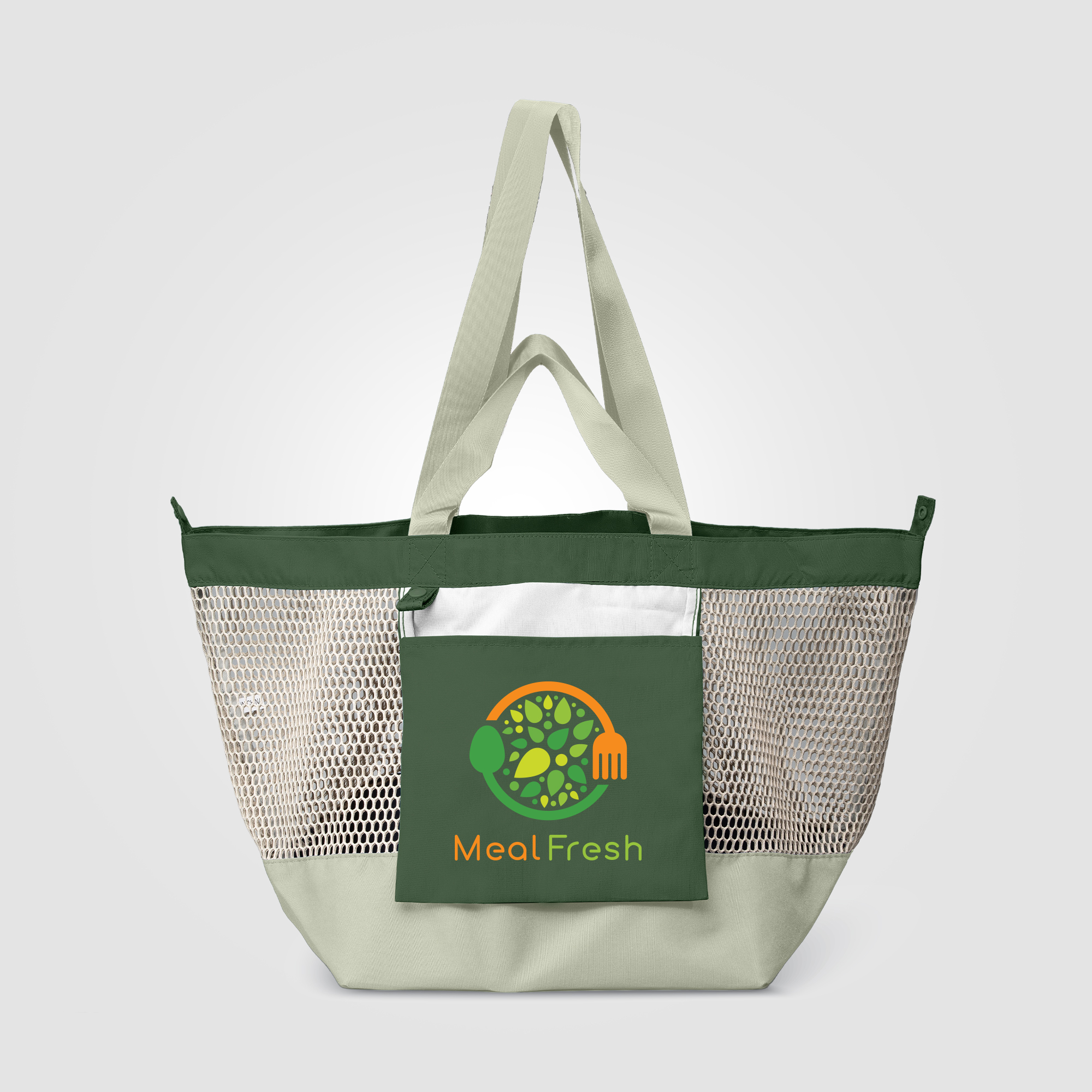 This Neri Tote is an innovative, multi-purpose bag that combines trend-driven design with ultimate practicality. This spacious 45-liter tote is crafted from durable 300D recycled content polyester with a striking mesh main body and solid color block panels. The foldable functionality is a key feature: the bag neatly stores into its own front pocket, keeping your logo visible whether the bag is open or folded. It offers versatile carrying with dual handles (short and long). Perfect for grocery shopping, daily errands, or as a beach bag, the Neri's large-capacity, foldable design makes it an ideal reusable bag for any need.