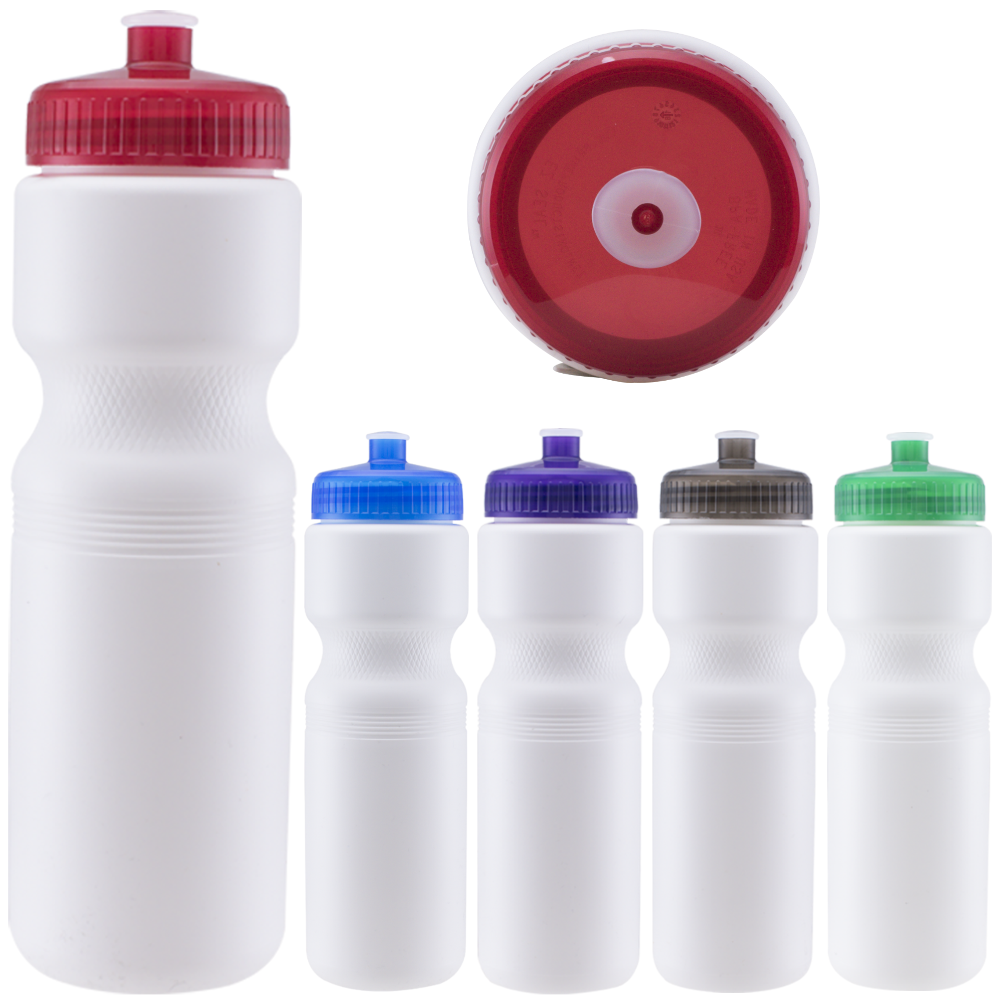 Made in USA. The 28 oz. Velocity Sports Bottle offers a blank white canvas to feature your logo. Made of lightweight HDPE plastic, this bottle has a push/pull spout lid that comes in popular translucent colors. Easily fits into bicycle water bottle holders. Up to 30% recycled material. BPA-free and lead-free. CA Prop 65 Compliant and FDA Approved. Hand wash only.